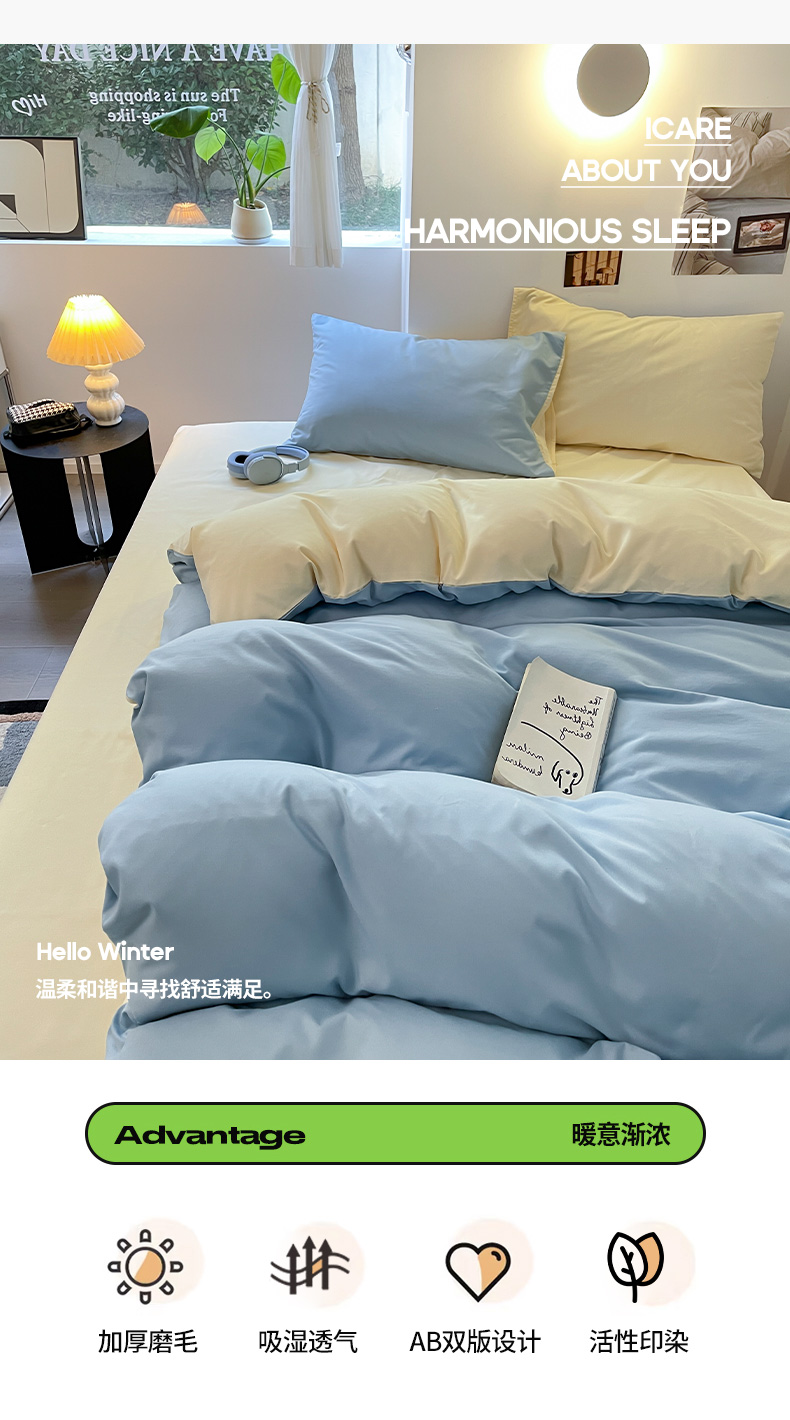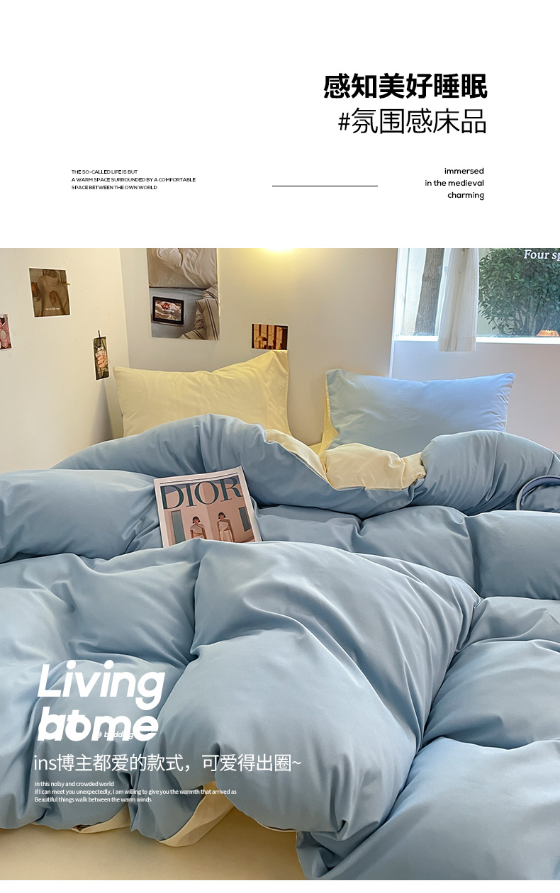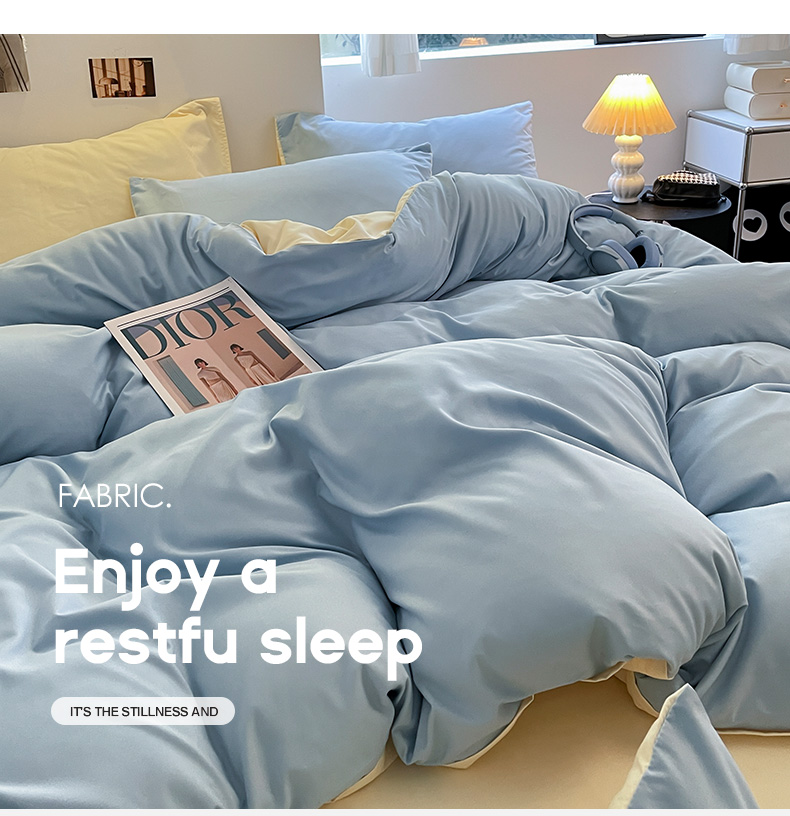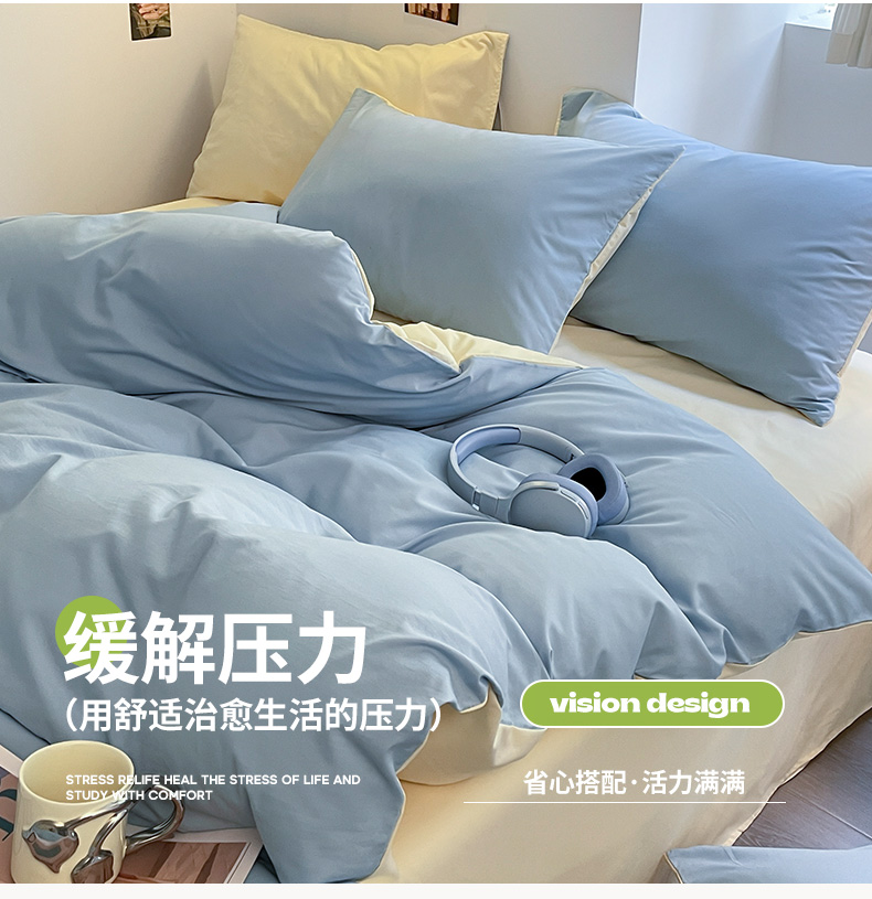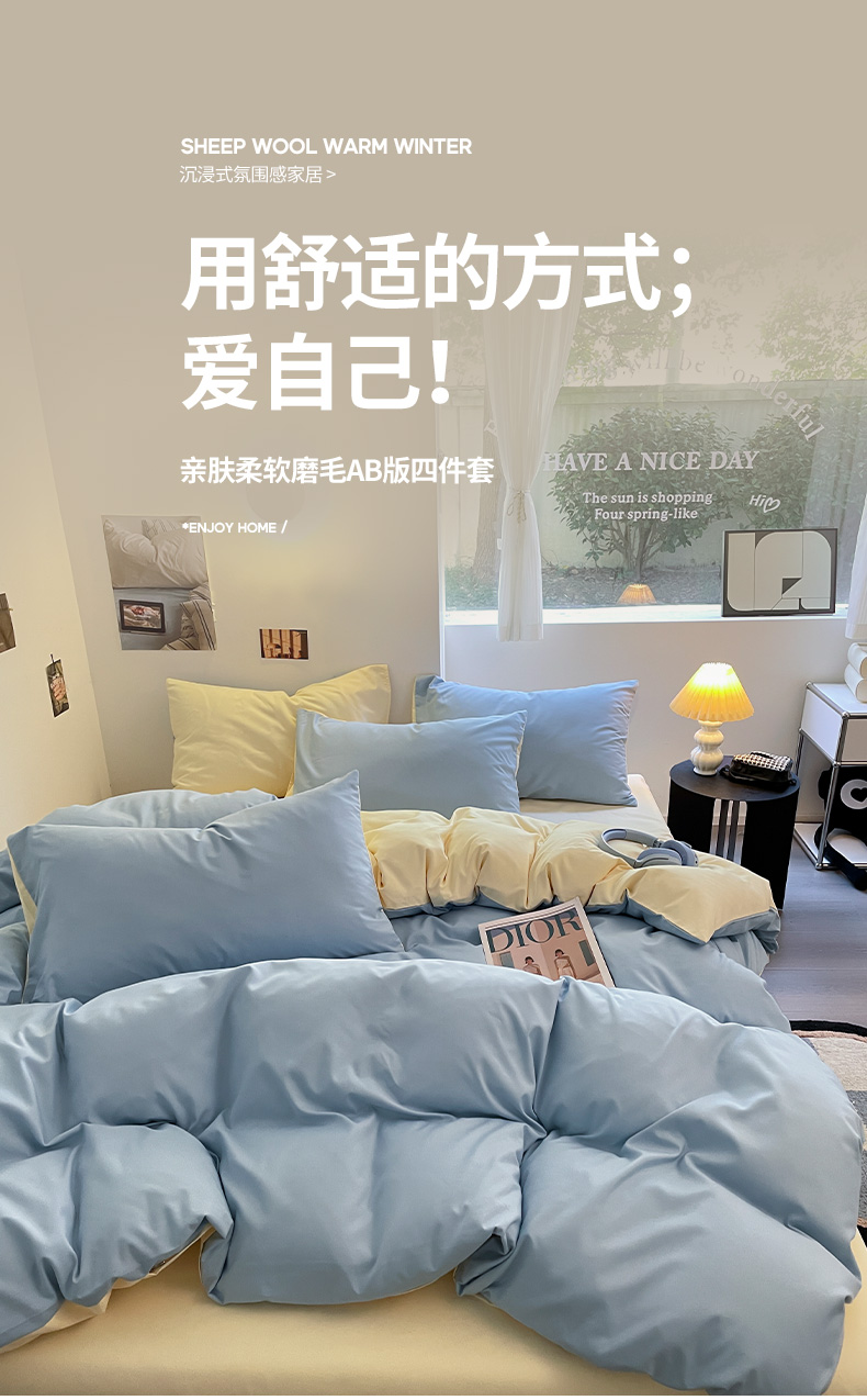 当前位置: 91家纺网 > 商品网购 > 床品套件 > 四件套 > 磨毛活性四件套 > 米粒 2024新款纯色简约双拼磨毛四件套 蓝+奶黄