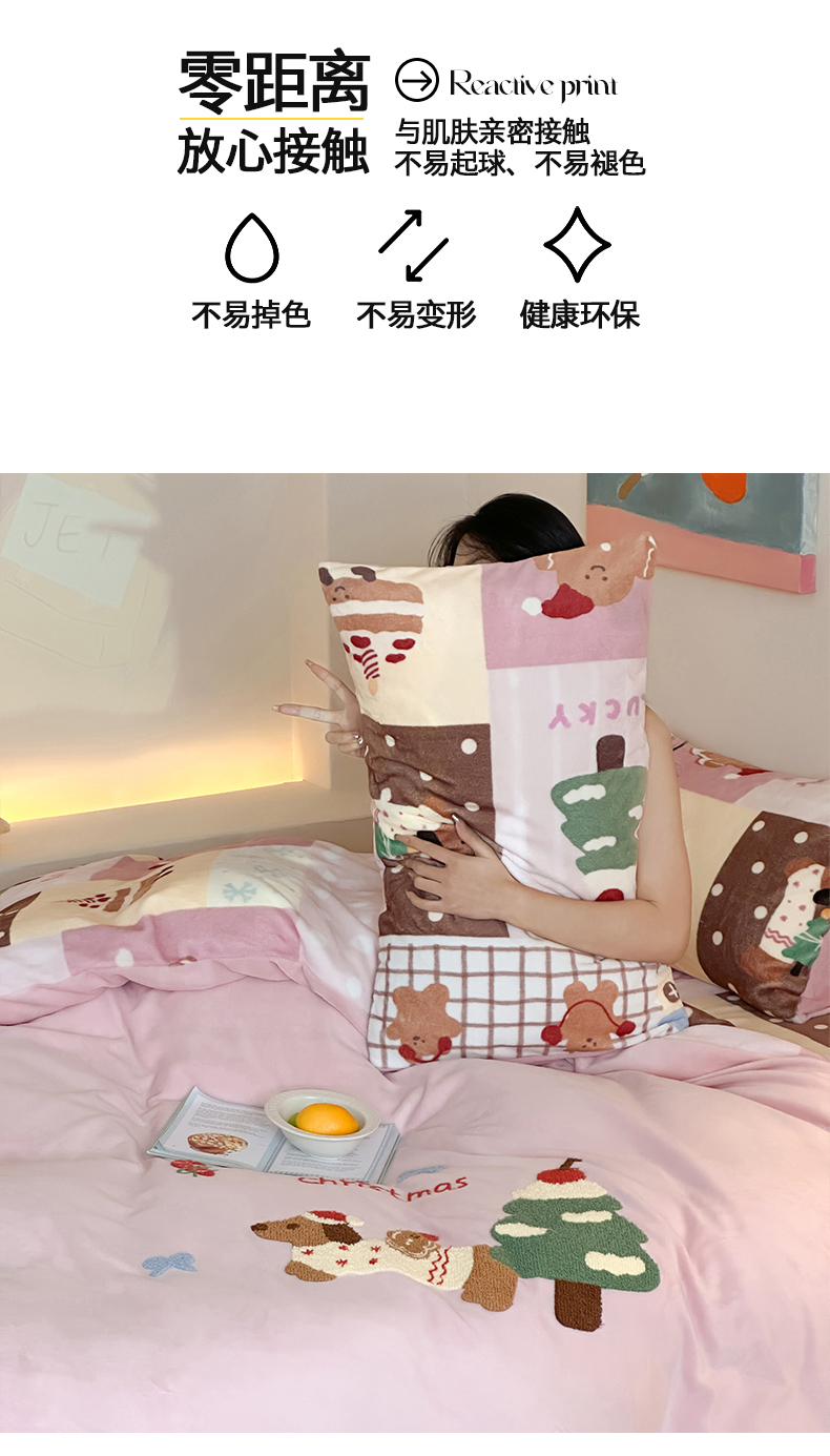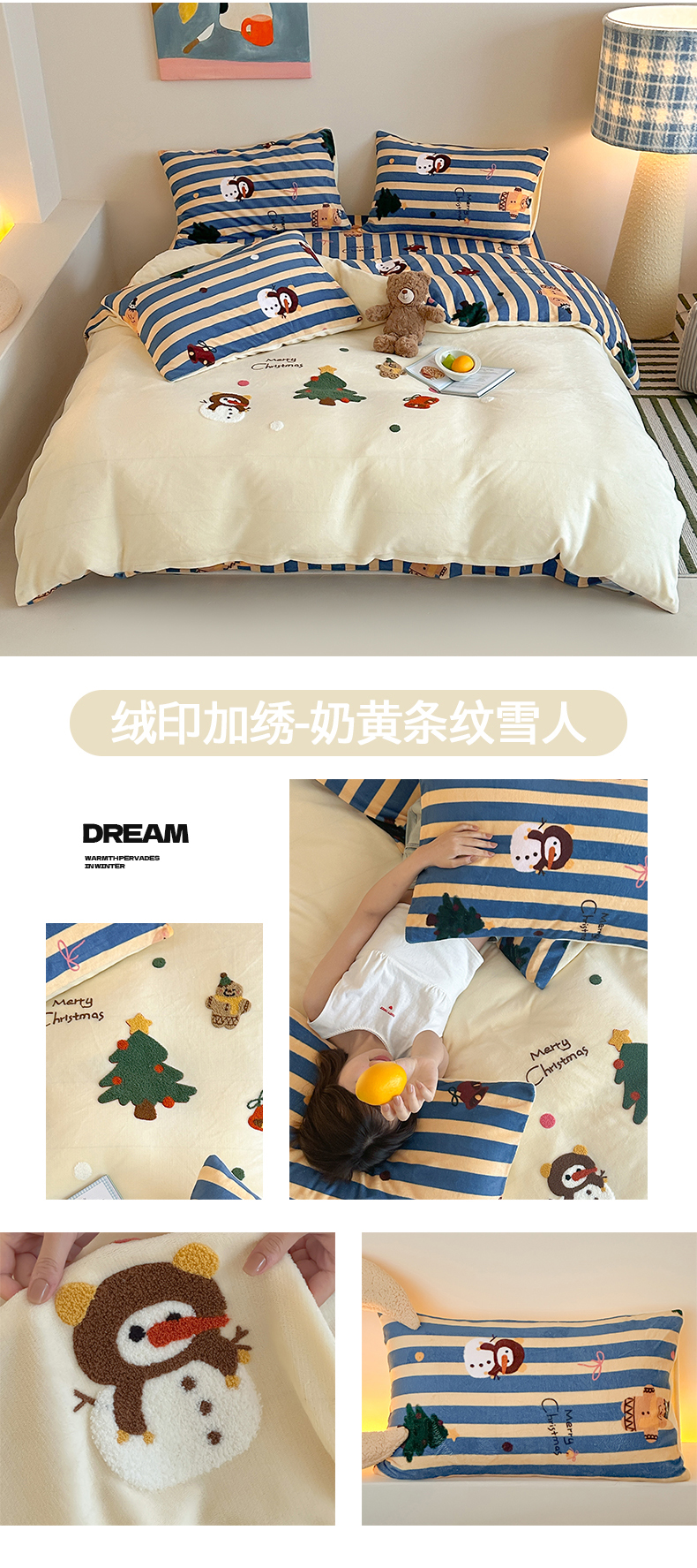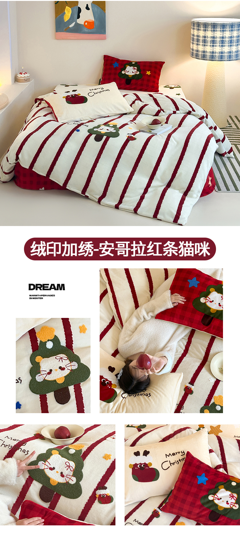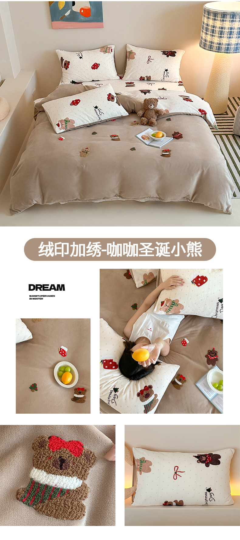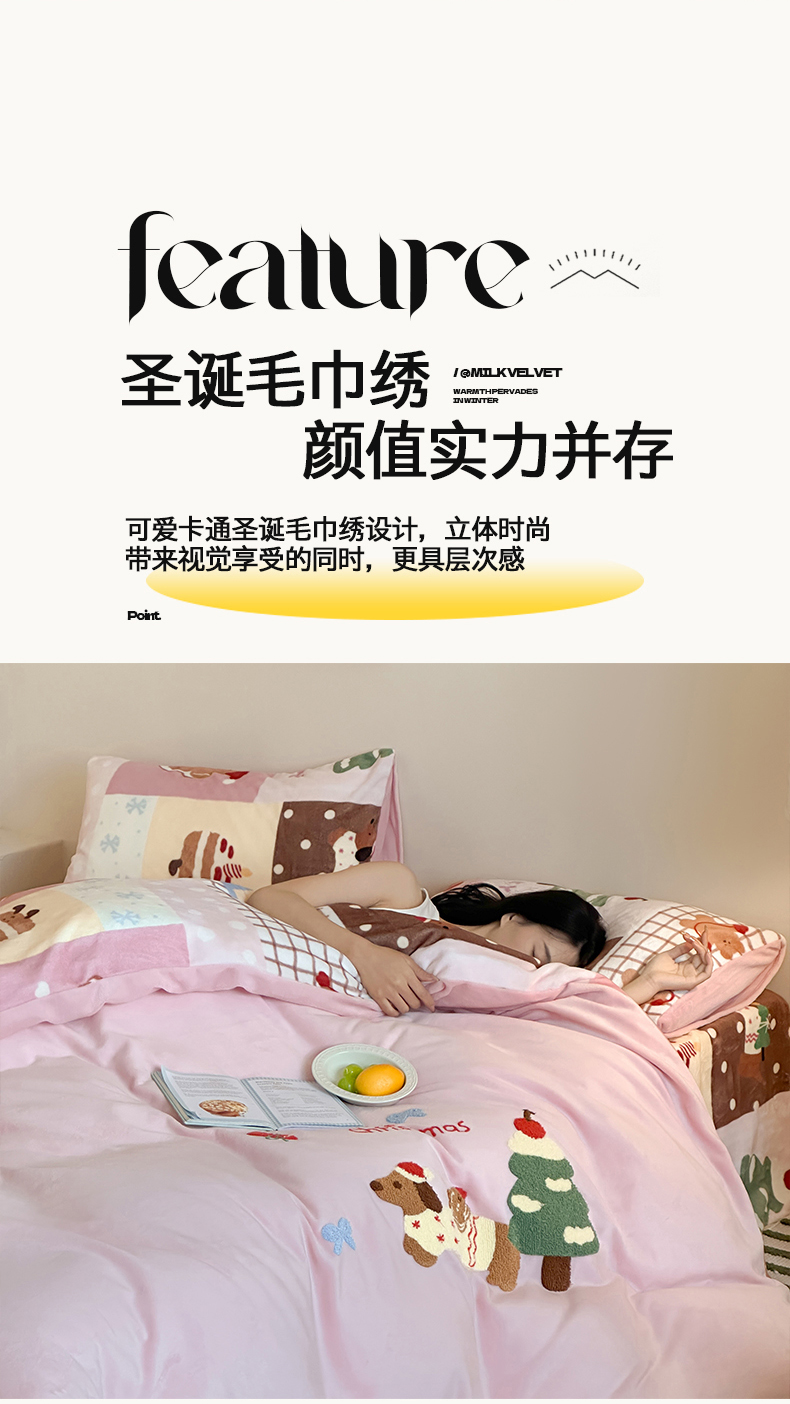 商品名称:(总)桃子家居 2024新款A类毛巾绣立体数码印花可爱卡通圣诞印加绣加厚牛奶绒系列四件套
