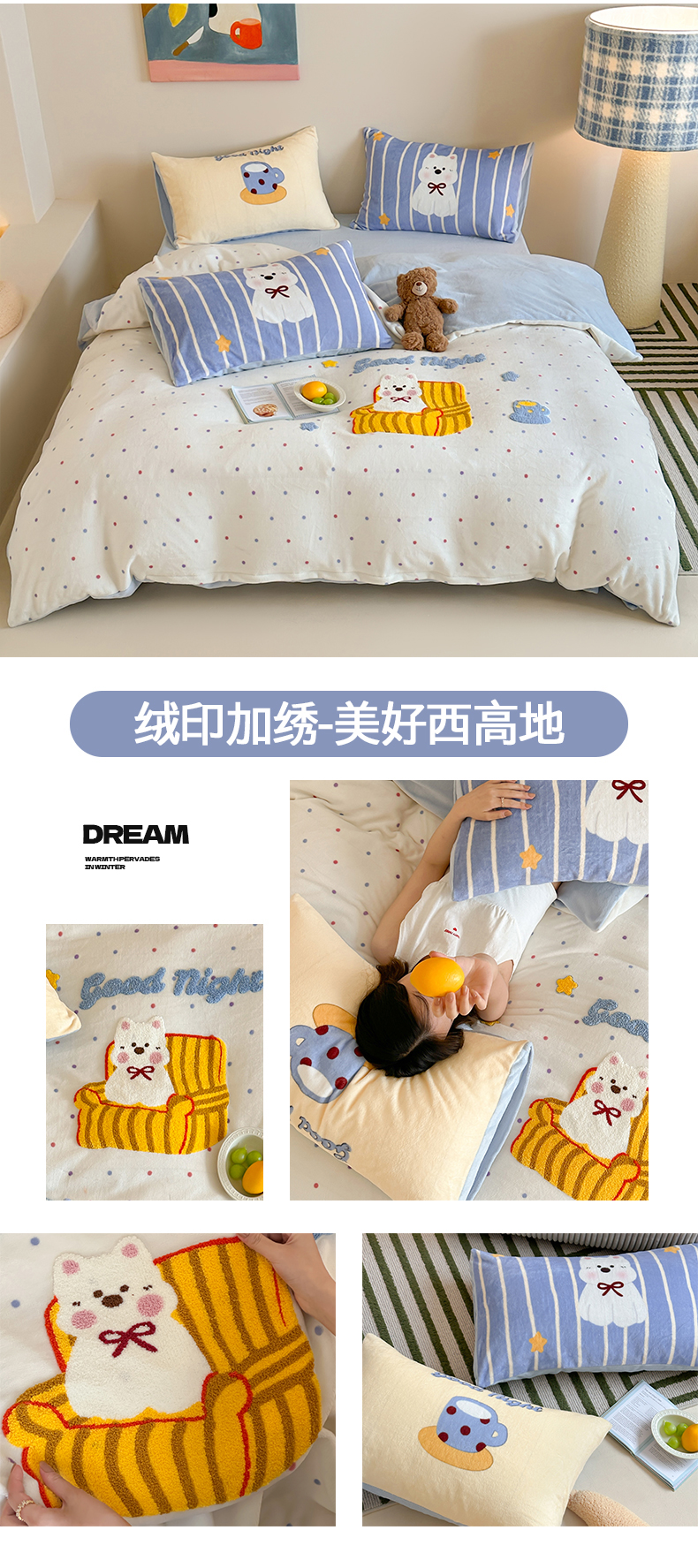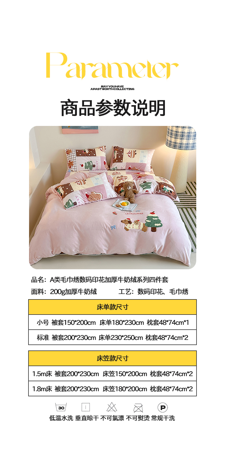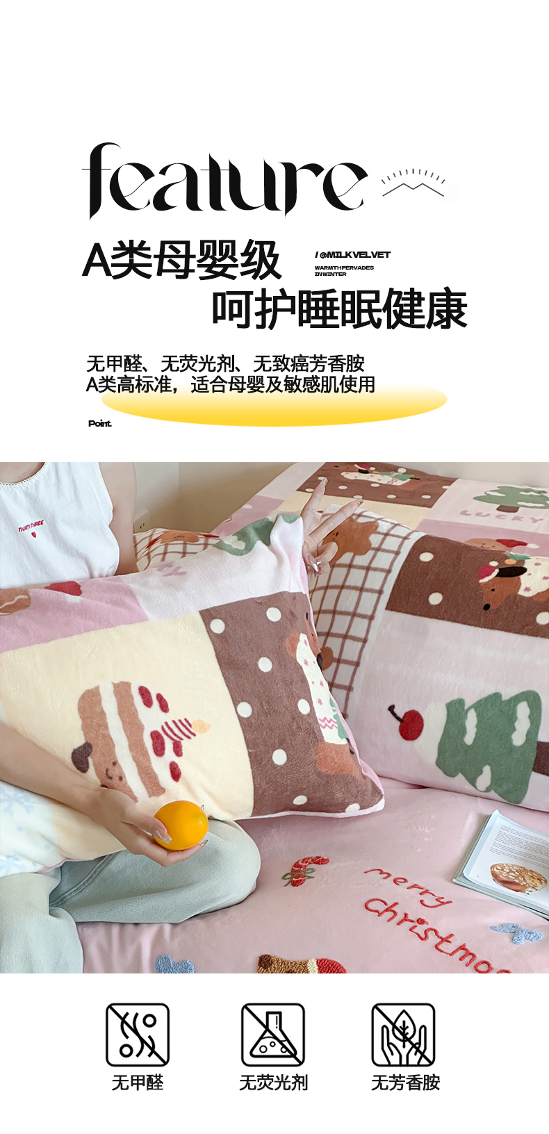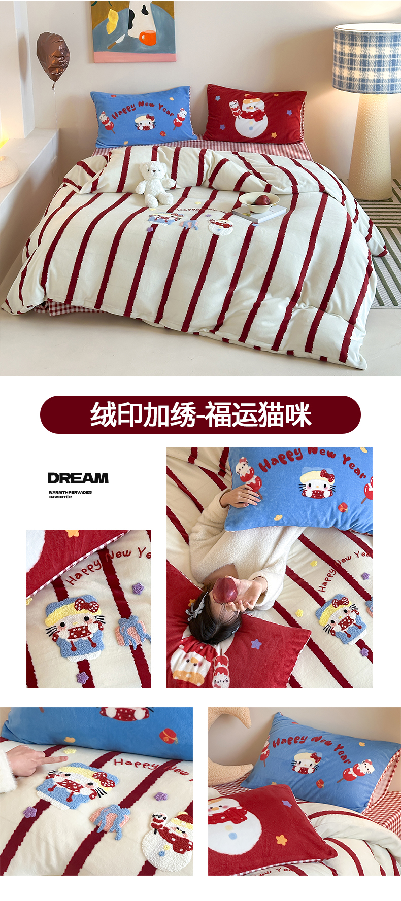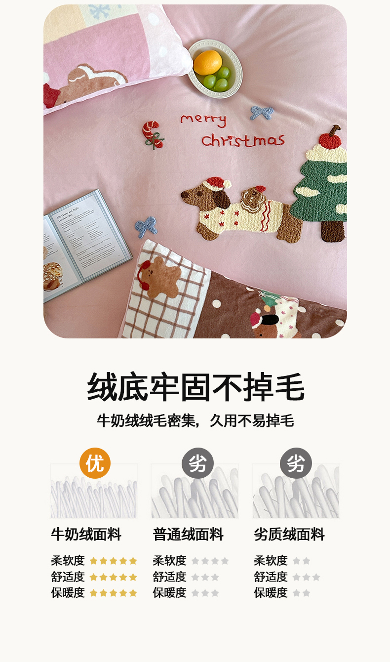 商品名称:(总)桃子家居 2024新款A类毛巾绣立体数码印花可爱卡通圣诞印加绣加厚牛奶绒系列四件套