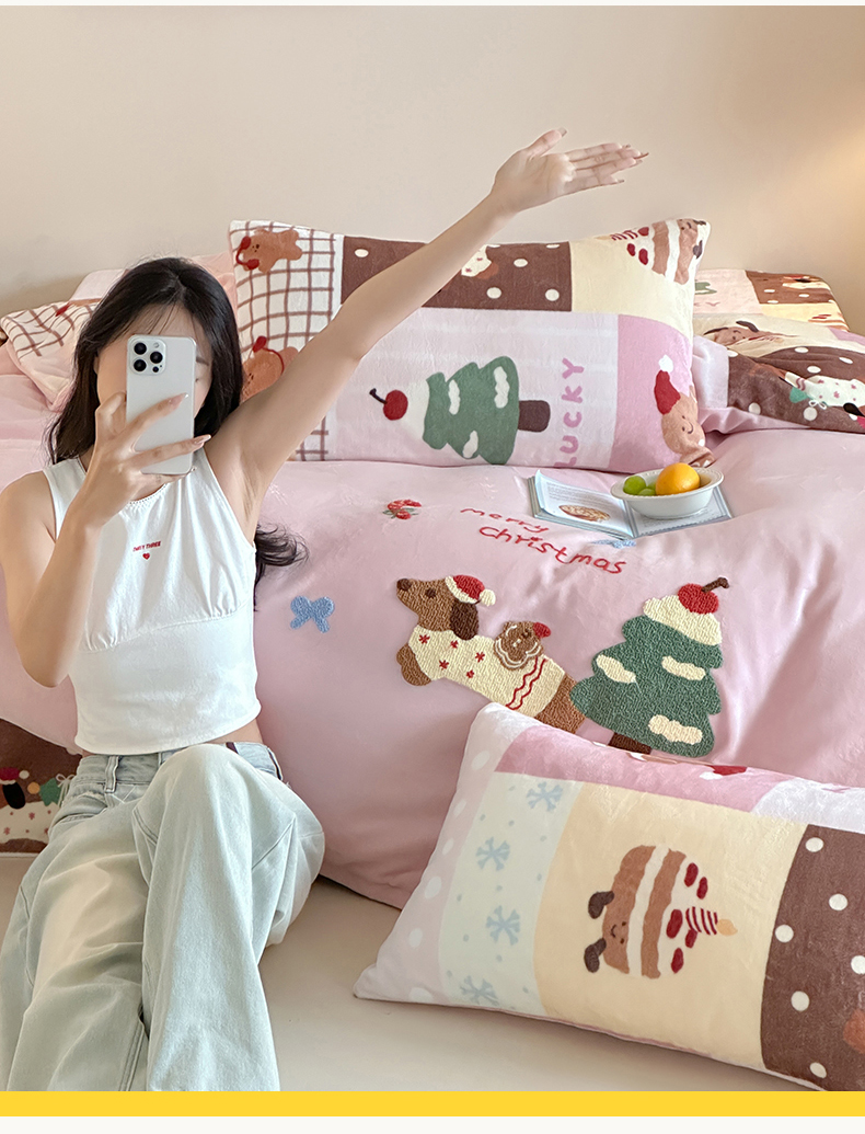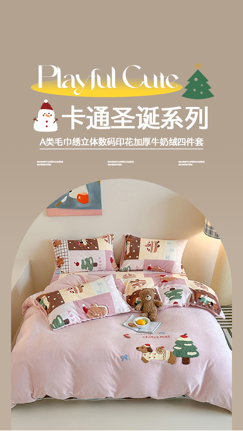 (总)桃子家居 2024新款A类毛巾绣立体数码印花可爱卡通圣诞印加绣加厚牛奶绒系列四件套