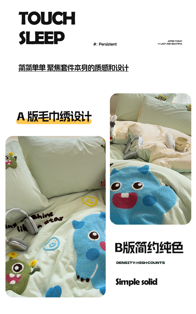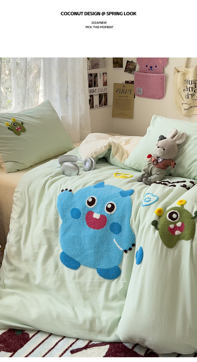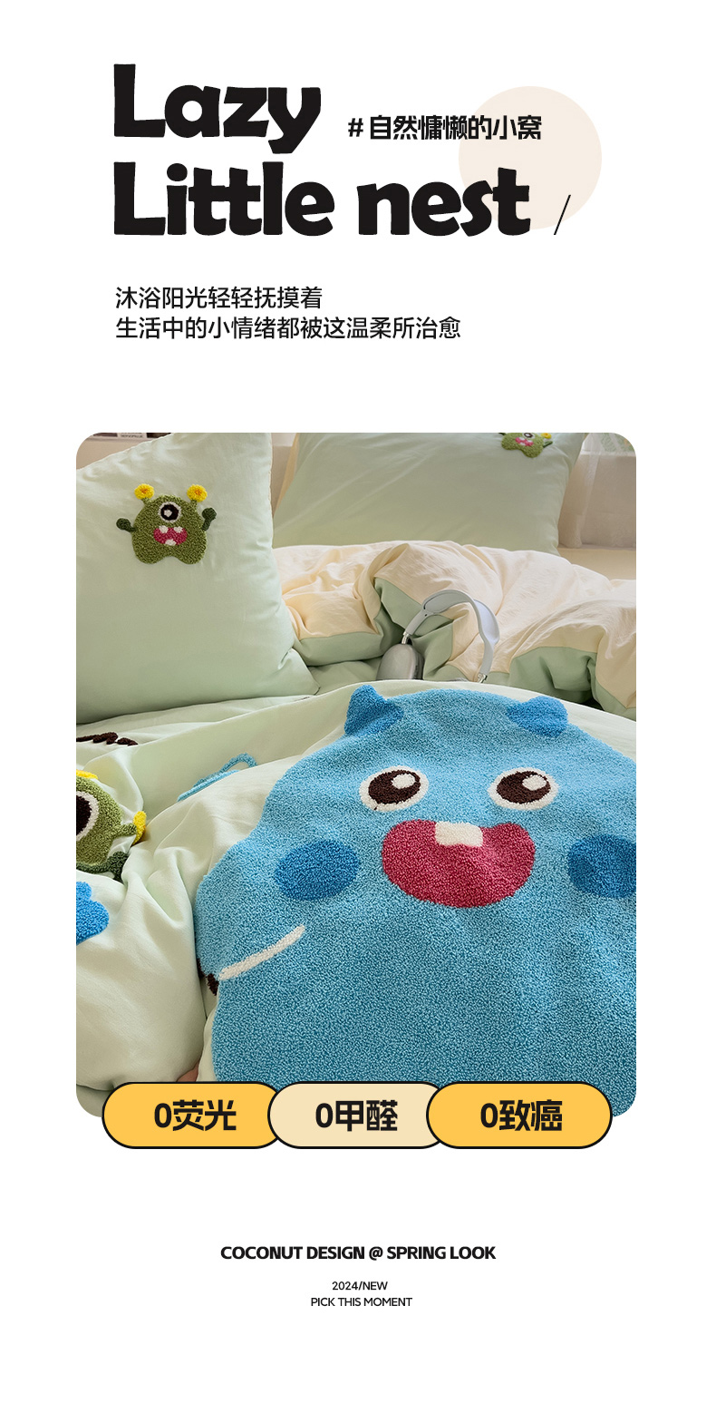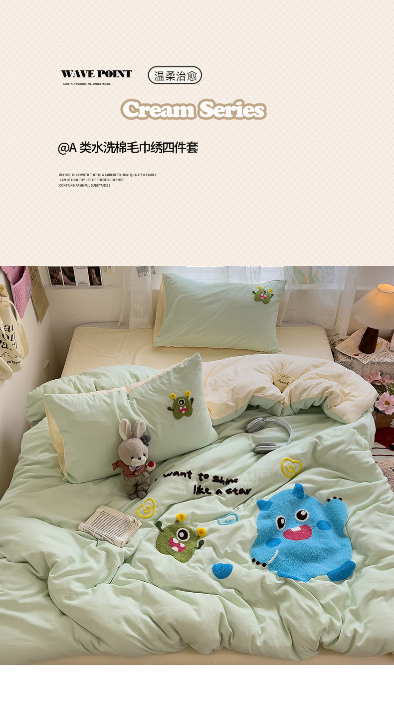 当前位置: 91家纺网 > 商品网购 > 床品套件 > 四件套 > 水洗棉四件套 > 2024新款水洗棉毛巾绣四件套系列 怪兽宝贝奶黄绿