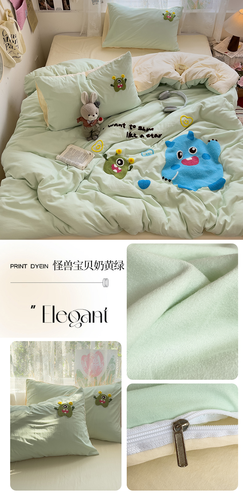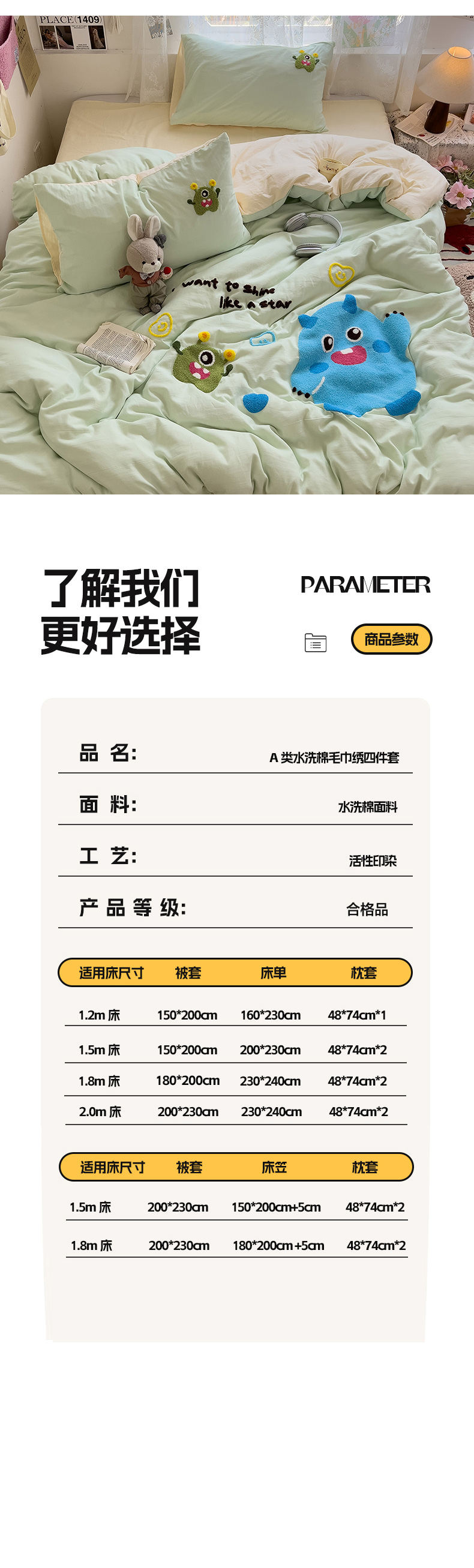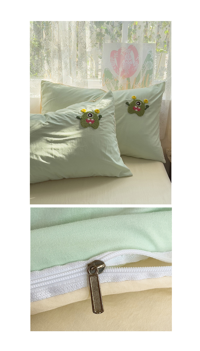 当前位置: 91家纺网 > 商品网购 > 床品套件 > 四件套 > 水洗棉四件套 > 2024新款水洗棉毛巾绣四件套系列 怪兽宝贝奶黄绿