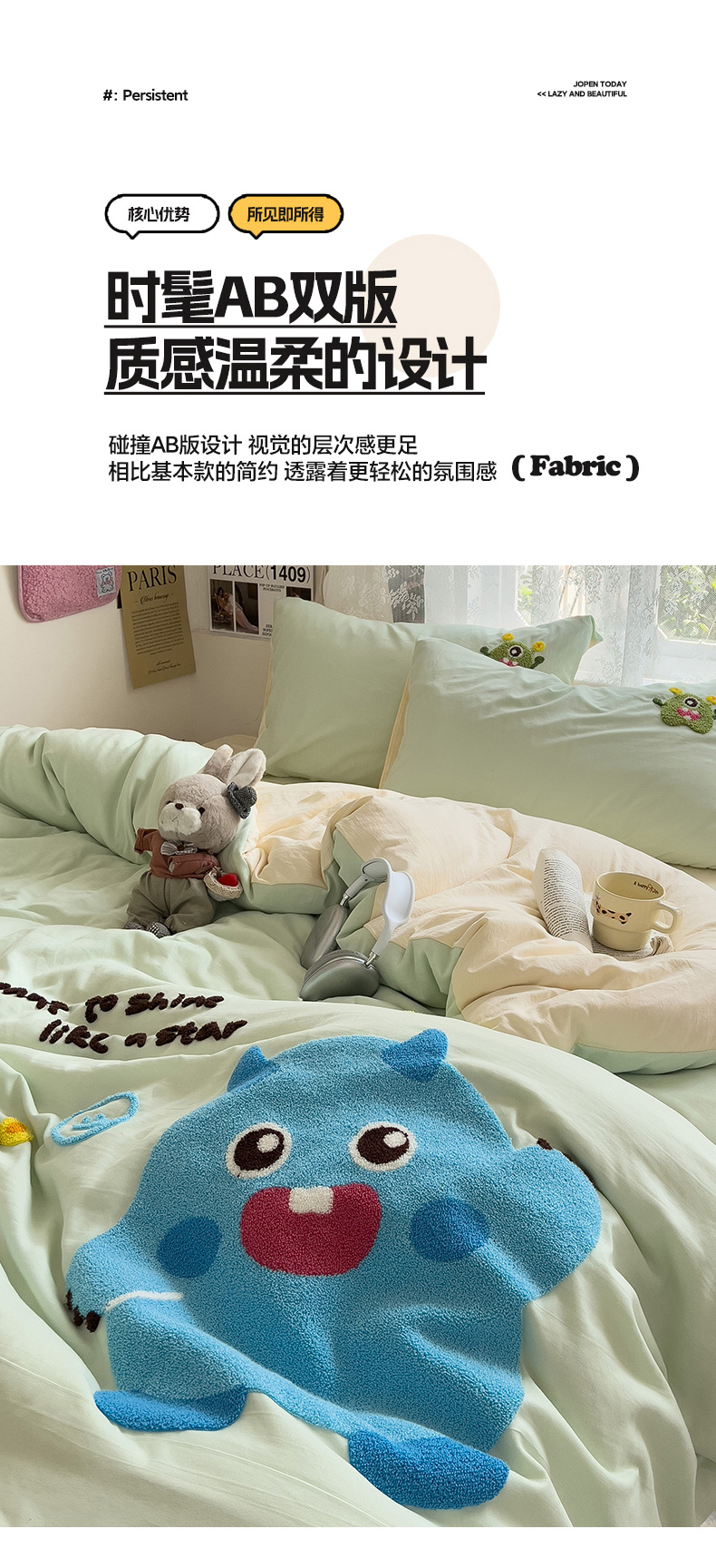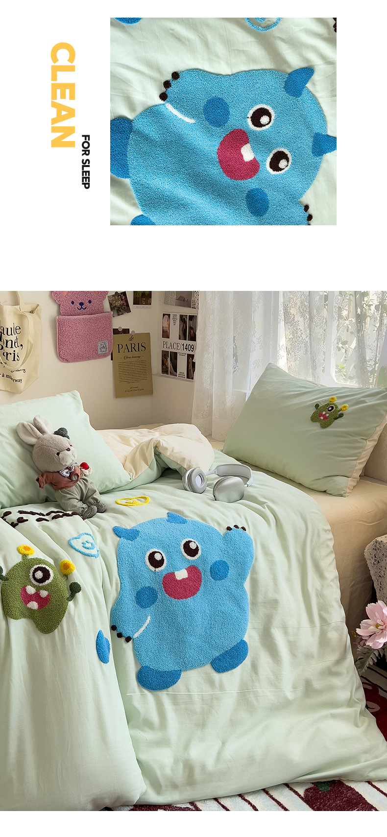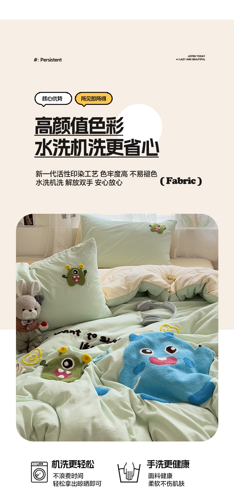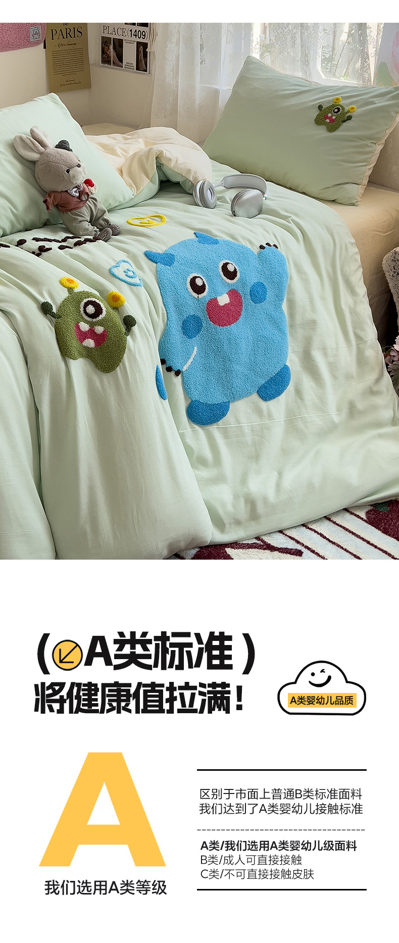 当前位置: 91家纺网 > 商品网购 > 床品套件 > 四件套 > 水洗棉四件套 > 2024新款水洗棉毛巾绣四件套系列 怪兽宝贝奶黄绿