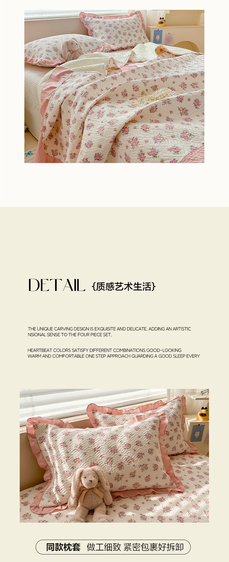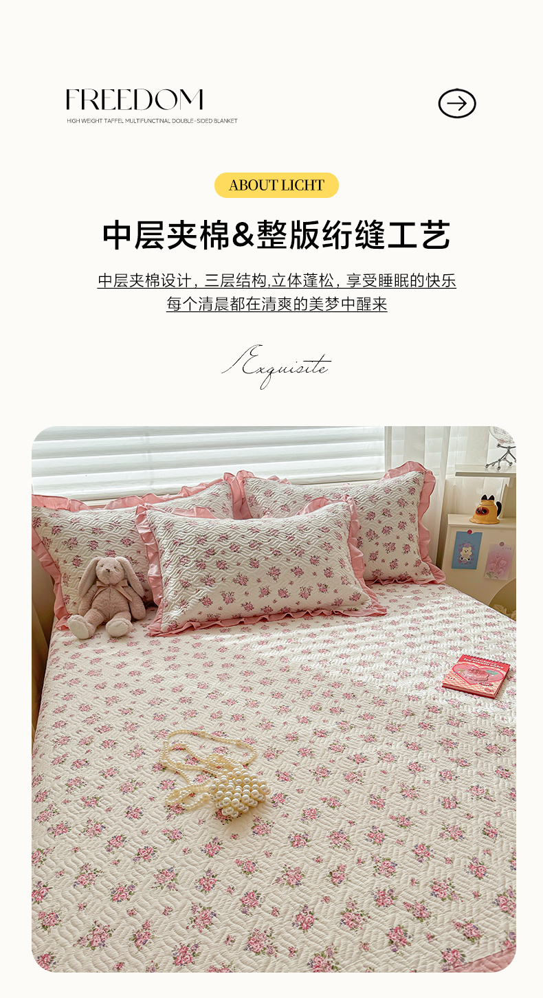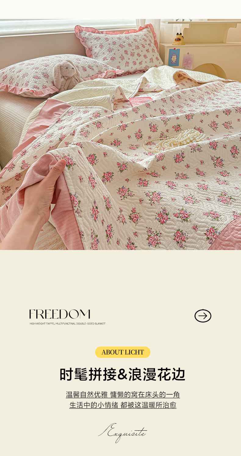 商品名称:2025新款木棉夹棉花边拼接床盖系列 初恋-粉