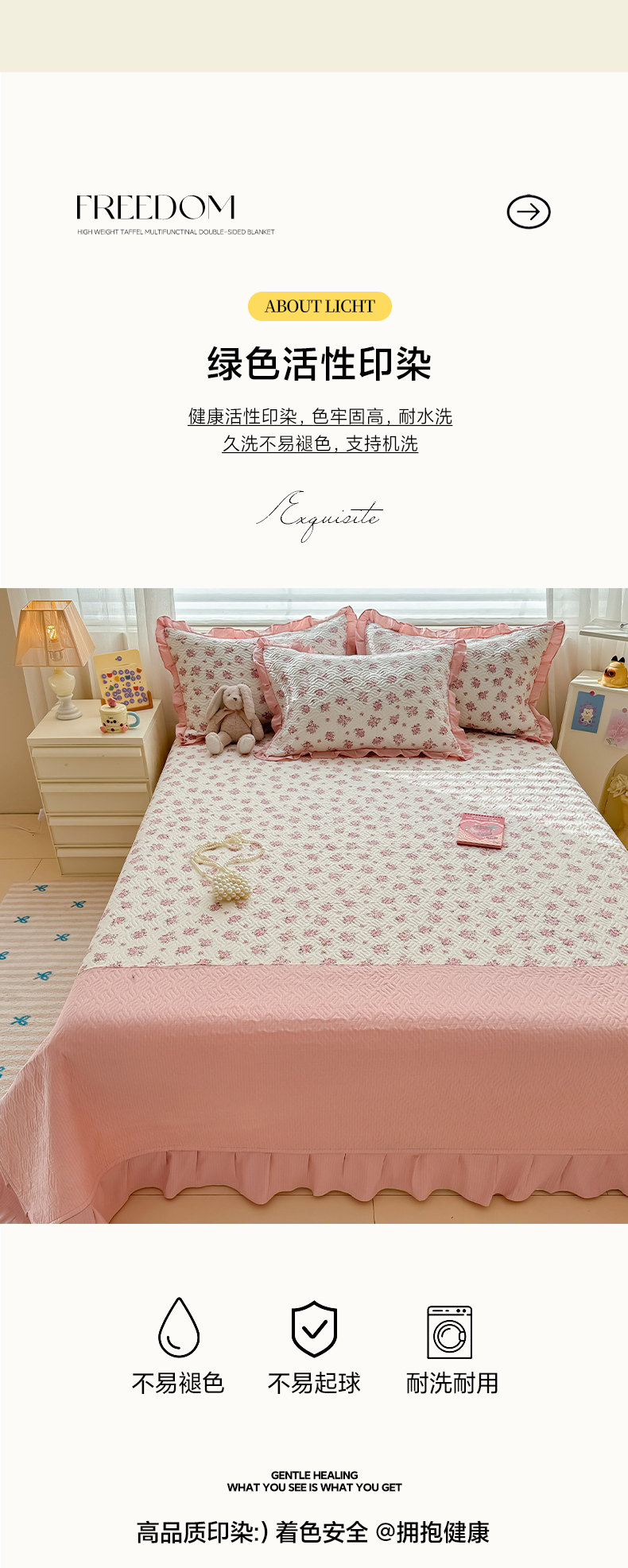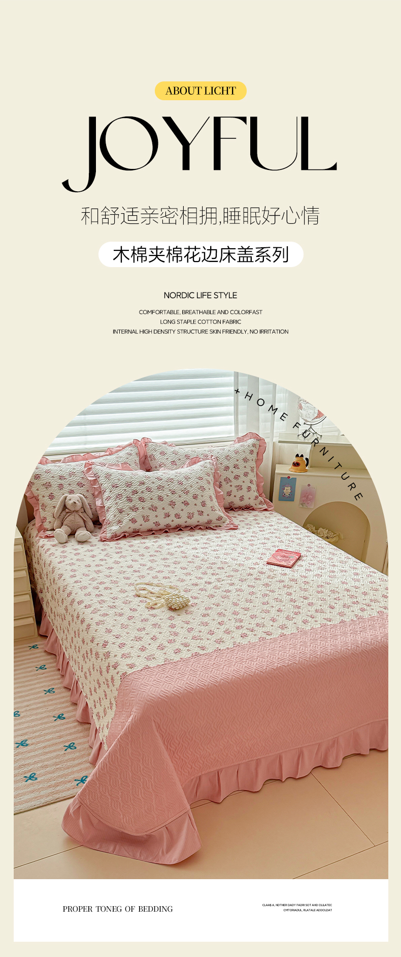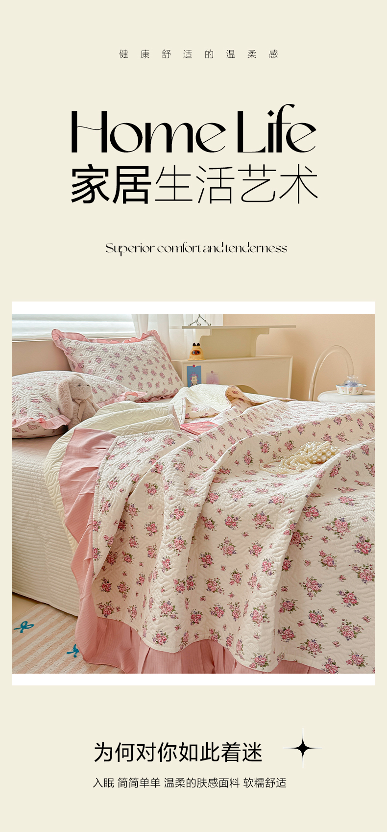 商品名称:2025新款木棉夹棉花边拼接床盖系列 初恋-粉