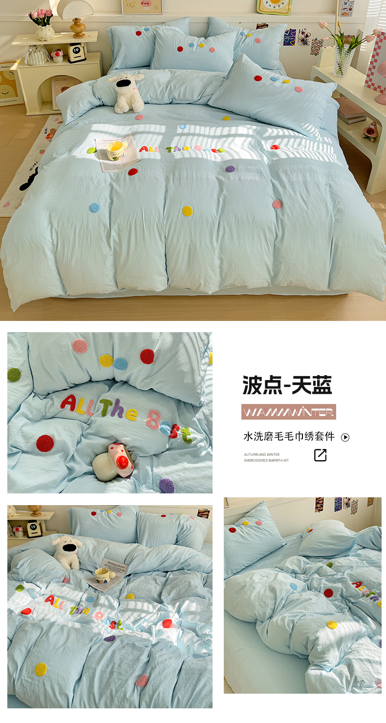 当前位置: 91家纺网 > 商品网购 > 床品套件 > 四件套 > 水洗棉四件套 > 逸尚阁 2025新款小清新毛巾绣四件套(提供买家秀) 波点-天蓝
