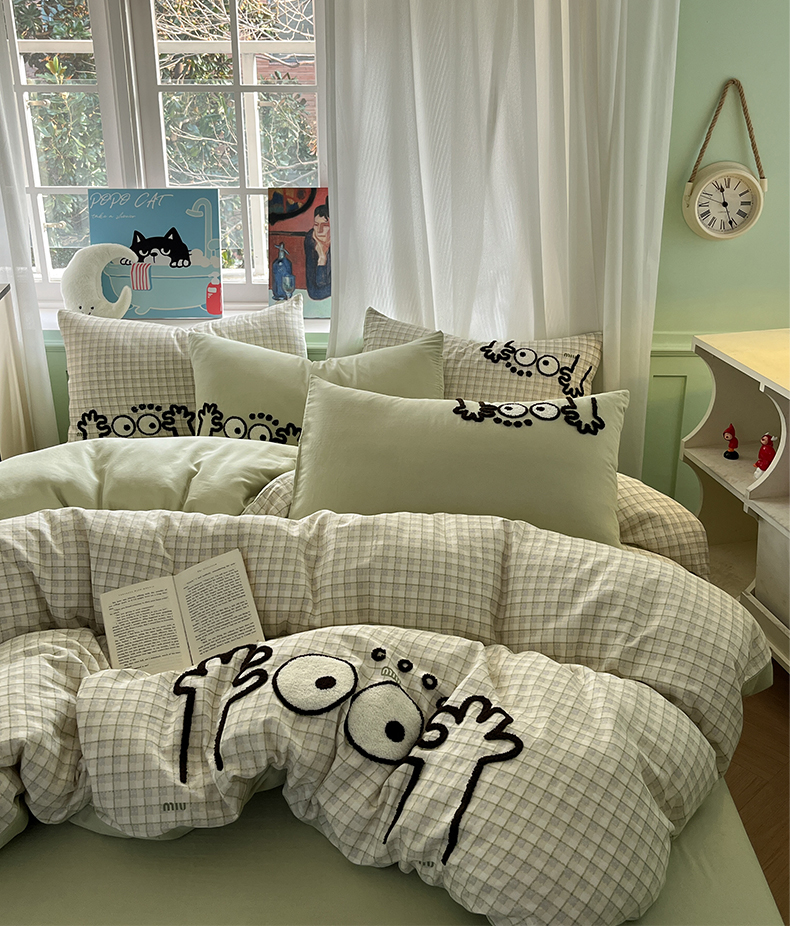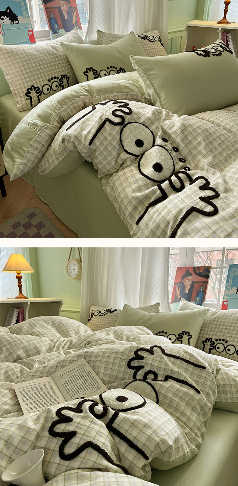 羚羊语家纺 2025新款A类全棉双层纱毛巾绣四件套100纯棉多层纱高克重小清新印花卡通皱皱纱三件套【含手提袋】 大眼睛-绿绮