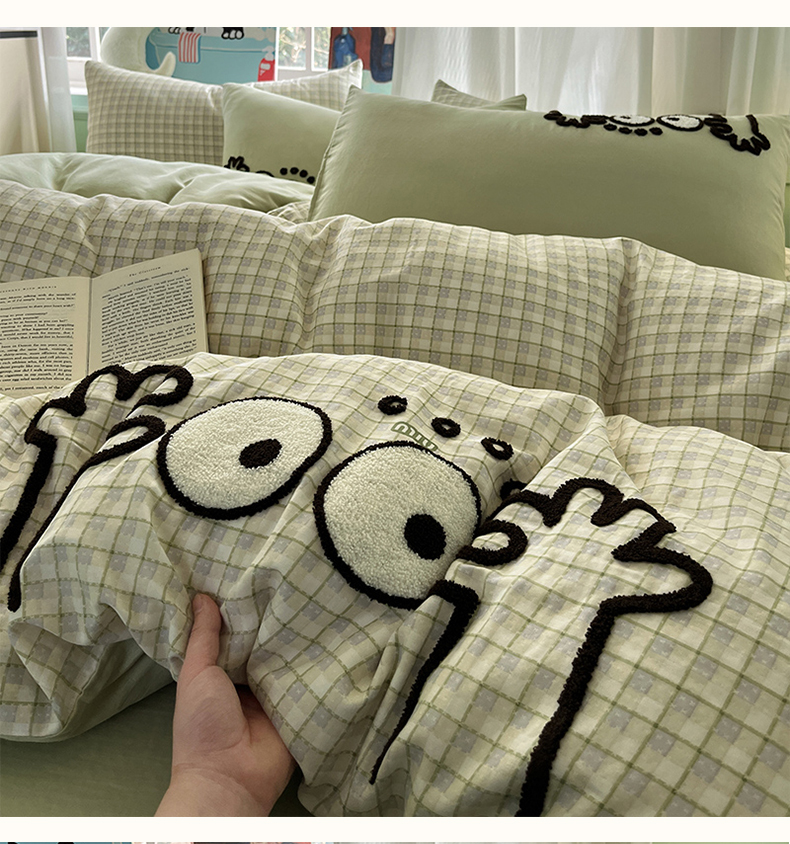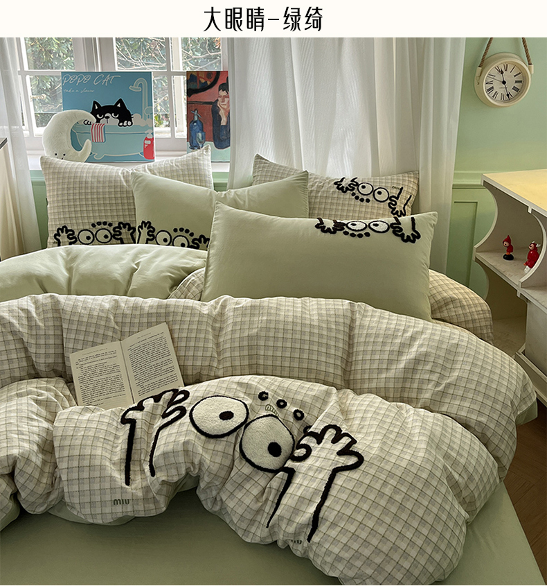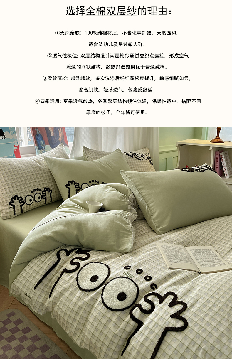 商品名称:羚羊语家纺 2025新款A类全棉双层纱毛巾绣四件套100纯棉多层纱高克重小清新印花卡通皱皱纱三件套【含手提袋】 大眼睛-绿绮