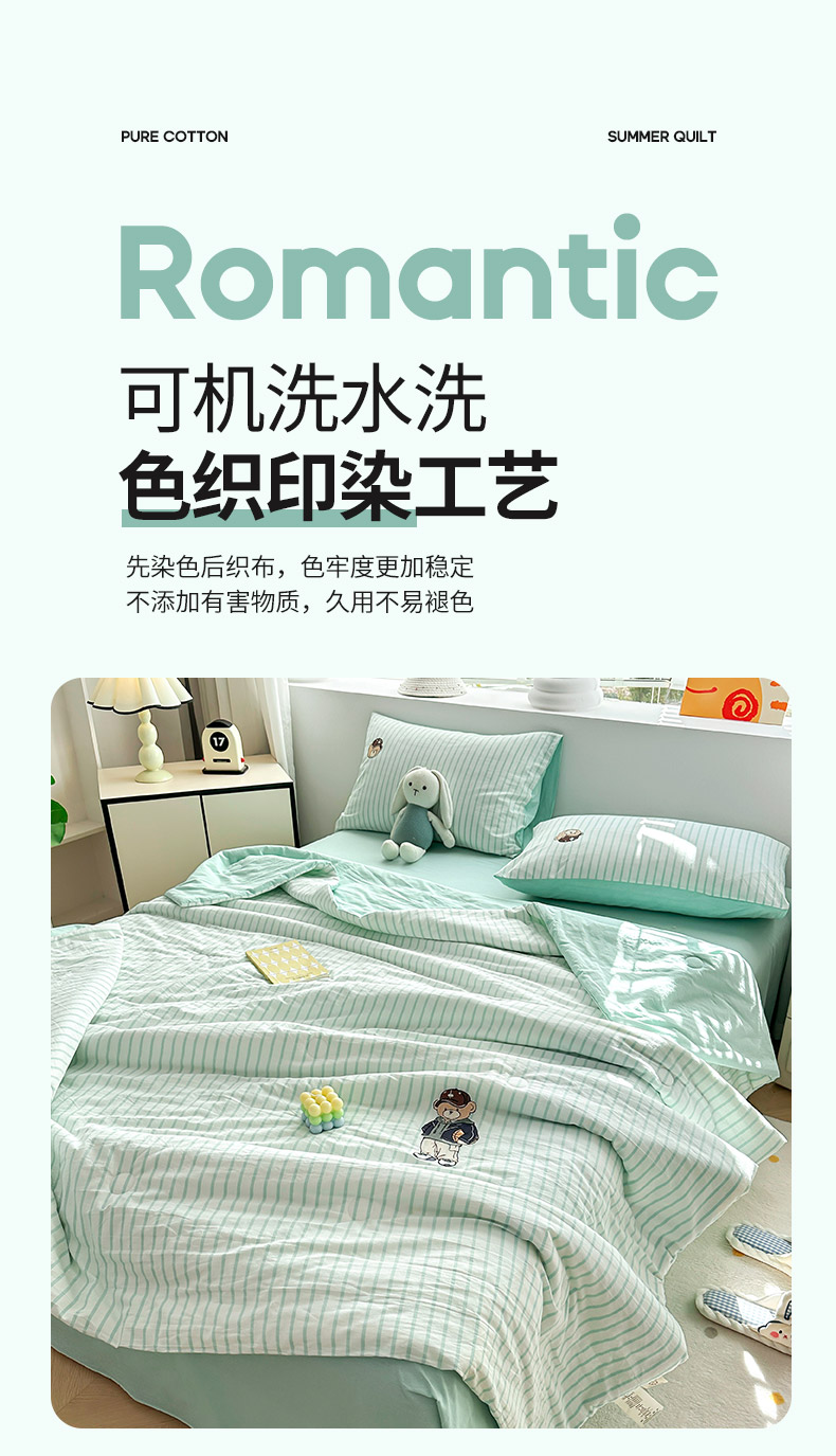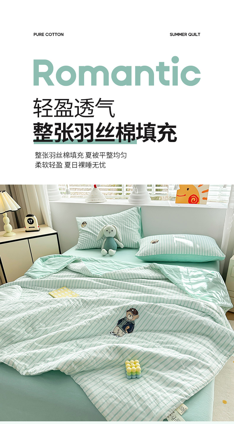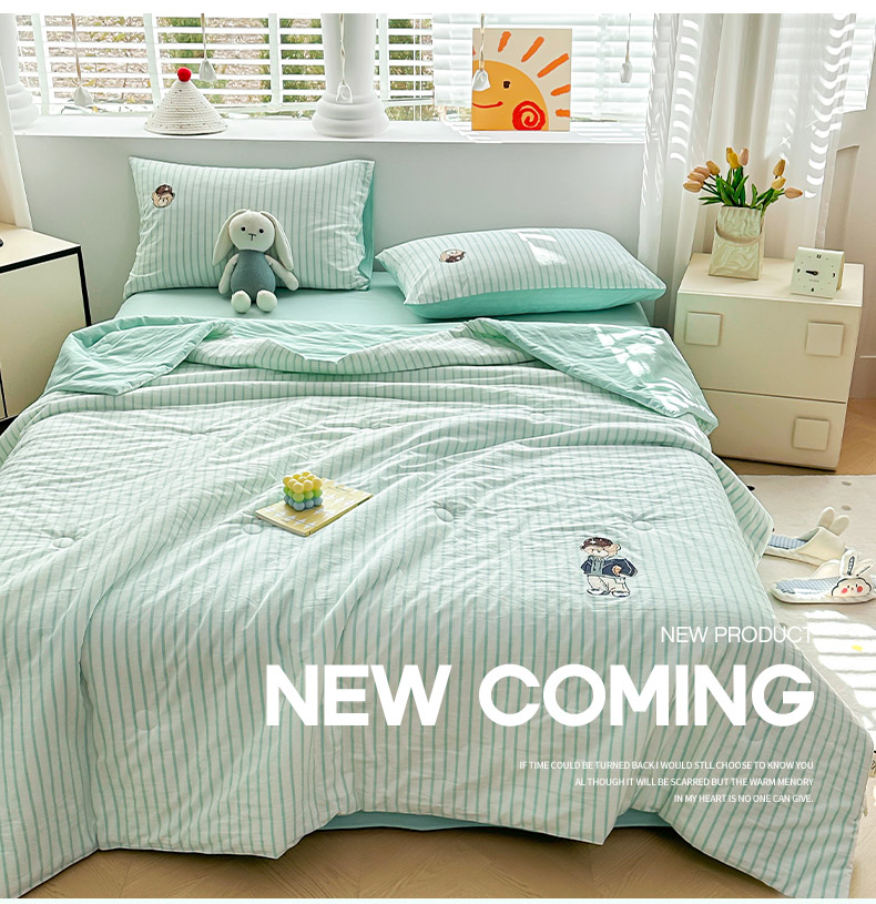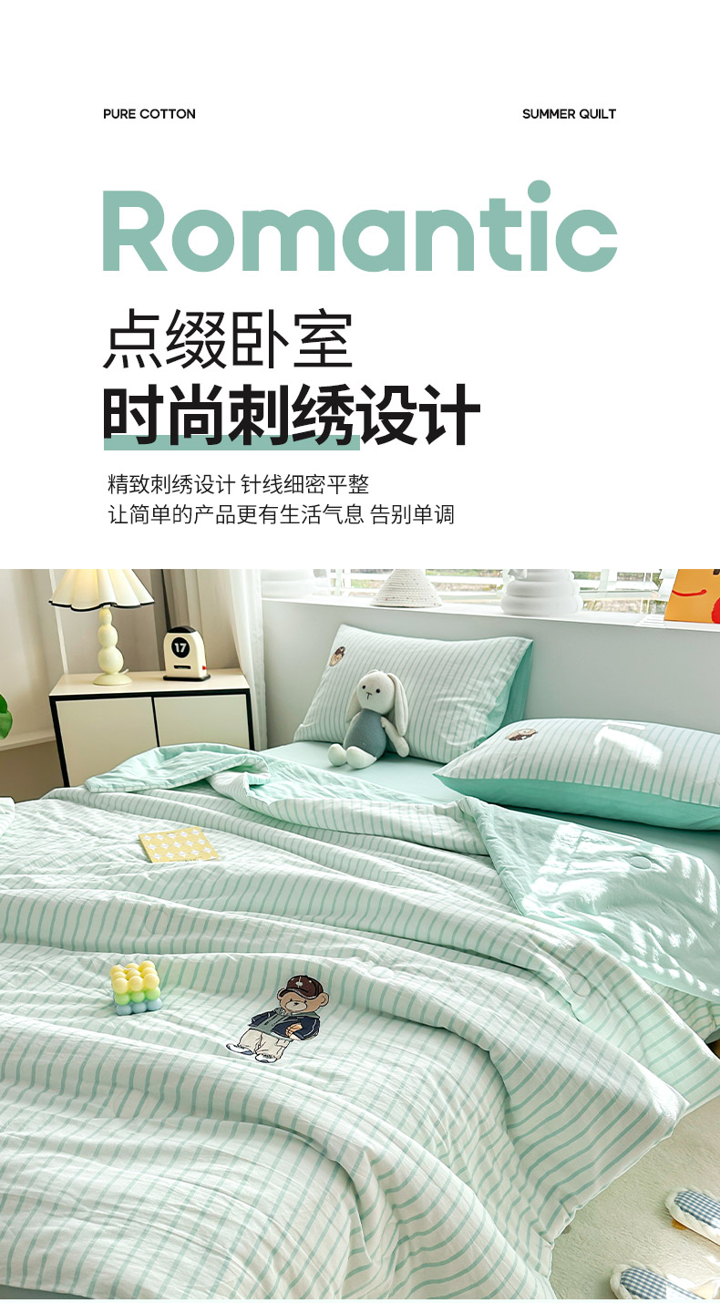 其奥家纺 2025新款专版纯棉色织水洗棉刺绣全棉夏被四件套夏凉被 篮球小熊-条纹绿