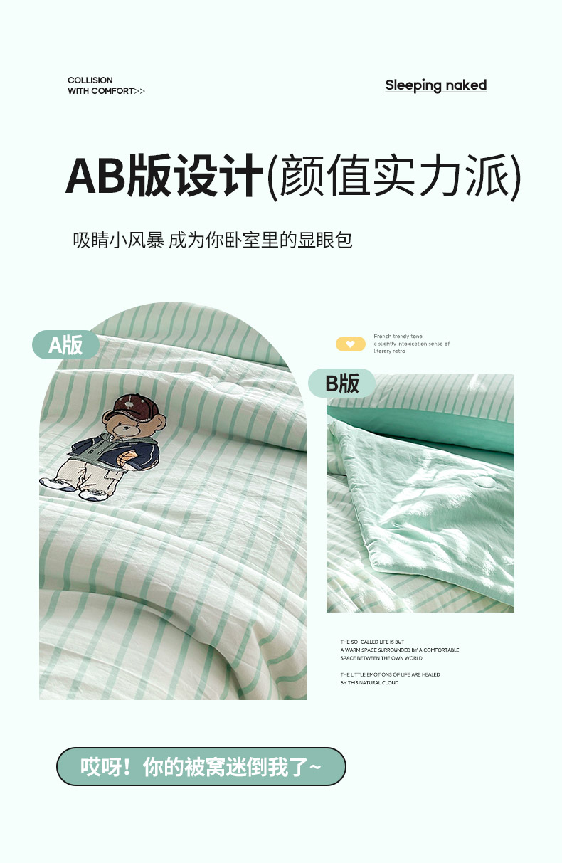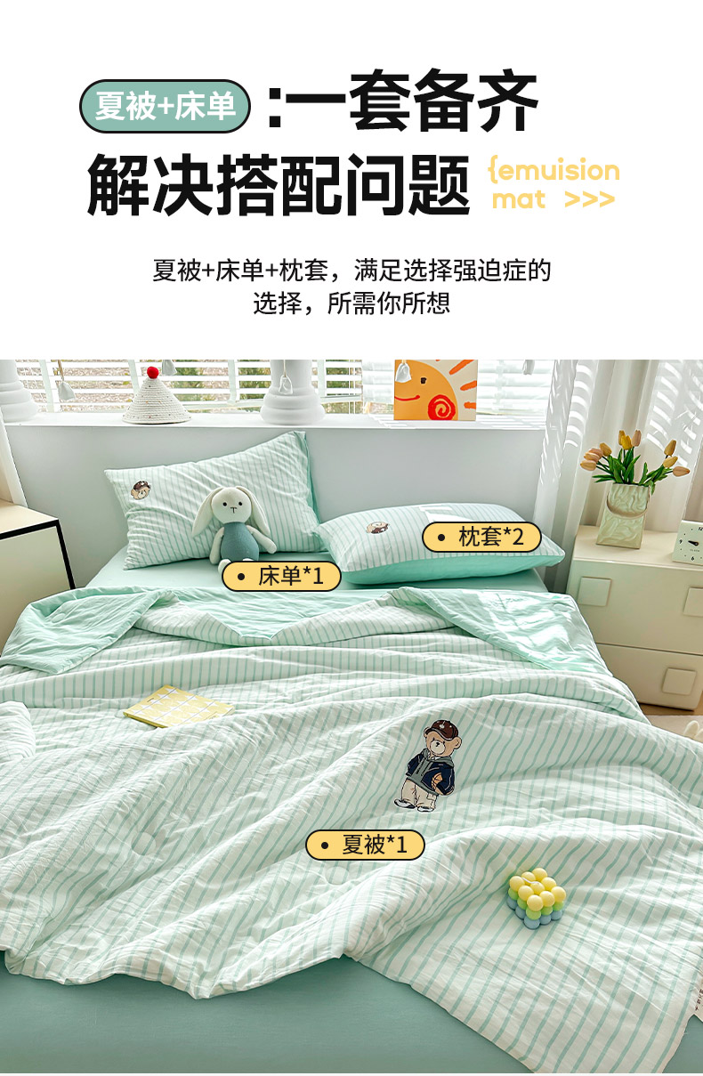 商品名称:其奥家纺 2025新款专版纯棉色织水洗棉刺绣全棉夏被四件套夏凉被 篮球小熊-条纹绿