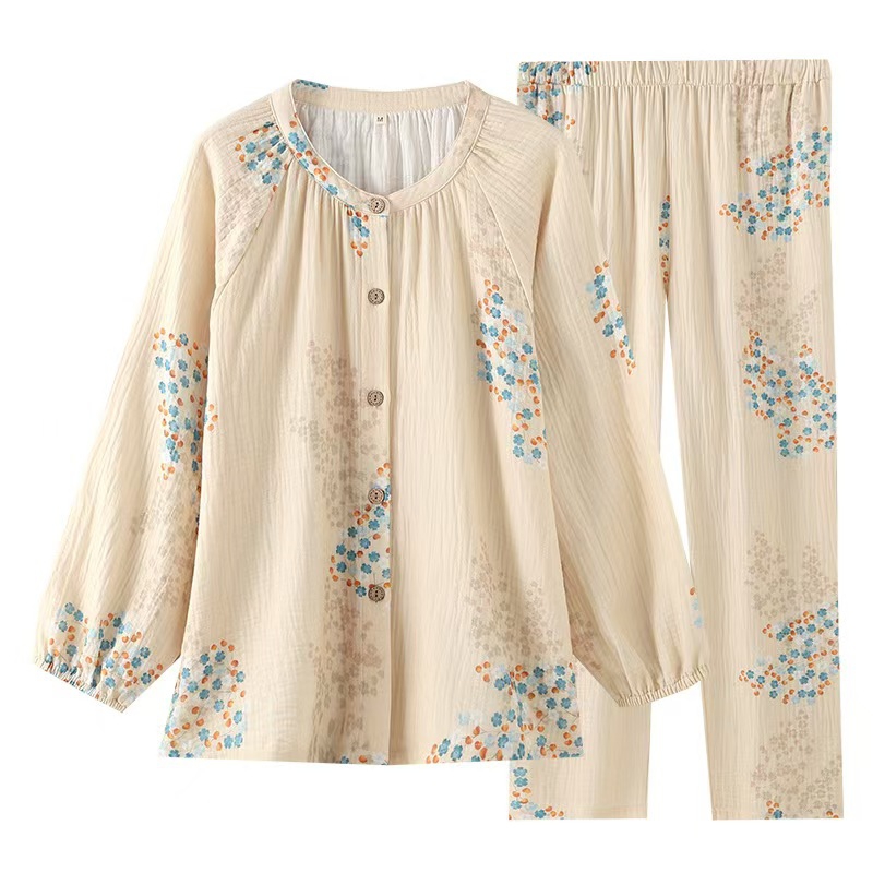 洛兰沙家居馆【只代发】【只代发】2025新款简约印花睡衣女春夏季宽松休闲家居服长袖开衫套装印花棉纱两件套 花束圆领
