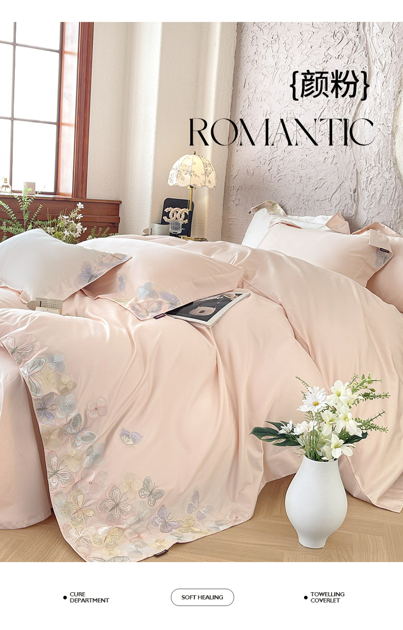 高端轻奢A类母婴级长绒棉全工艺刺绣四件套纯棉全棉高端春夏季爆款床上用品 茉婉-白粉