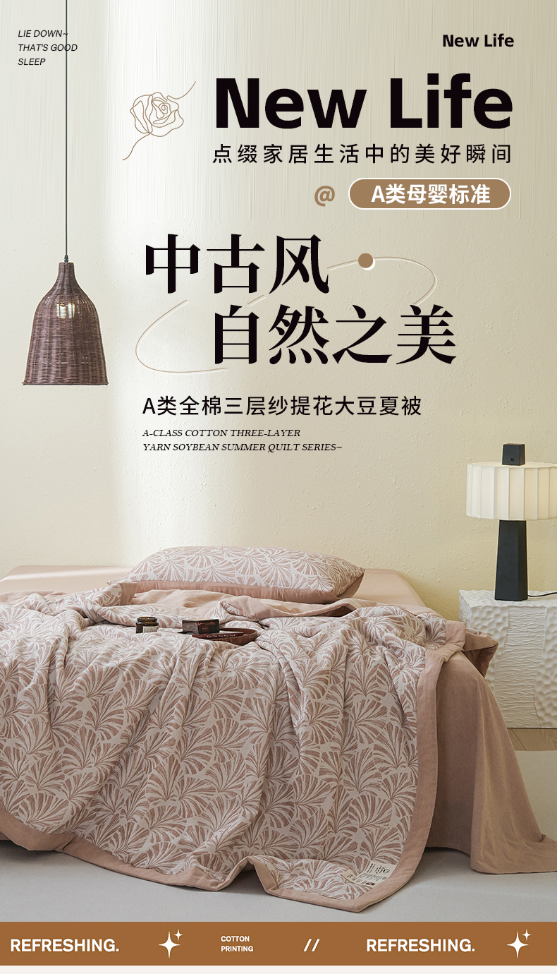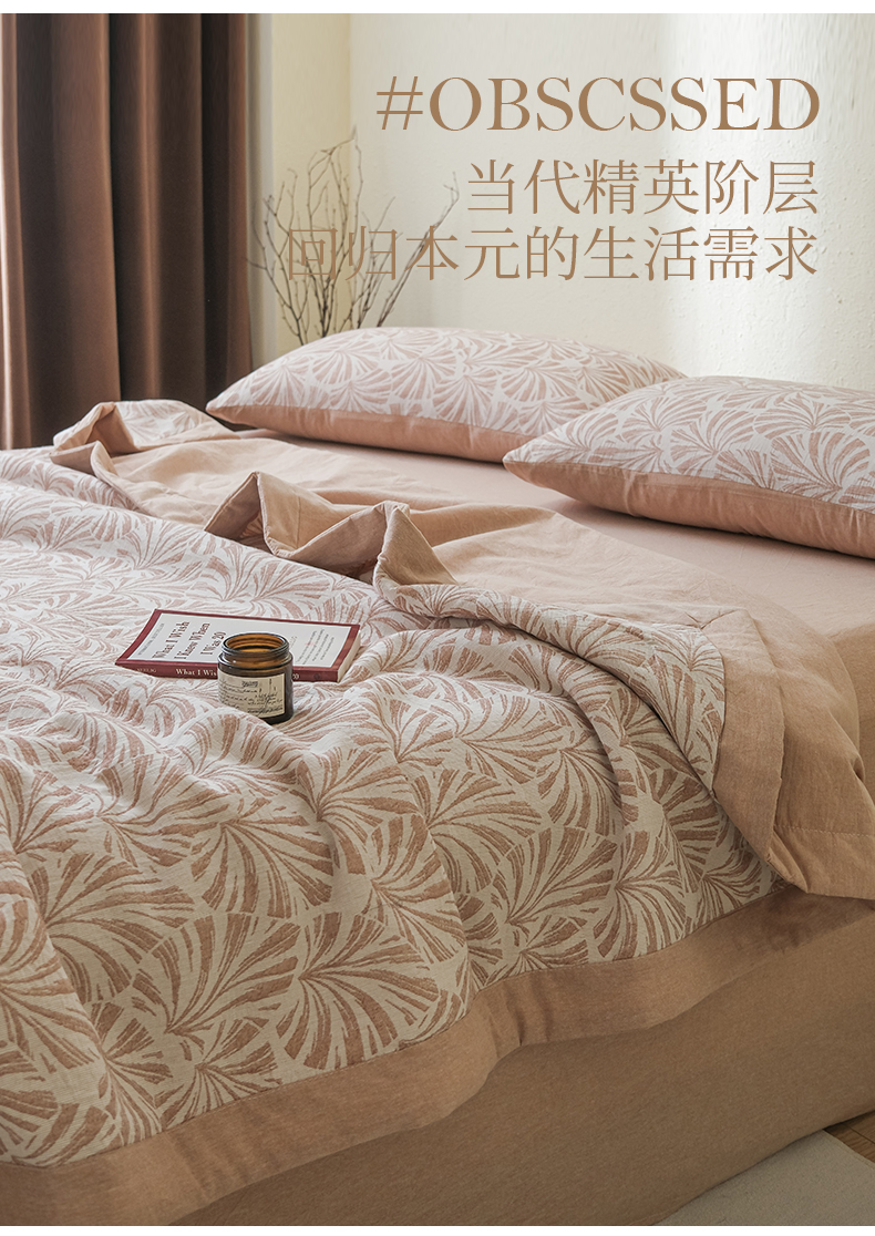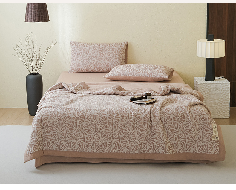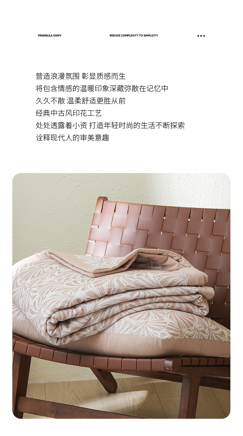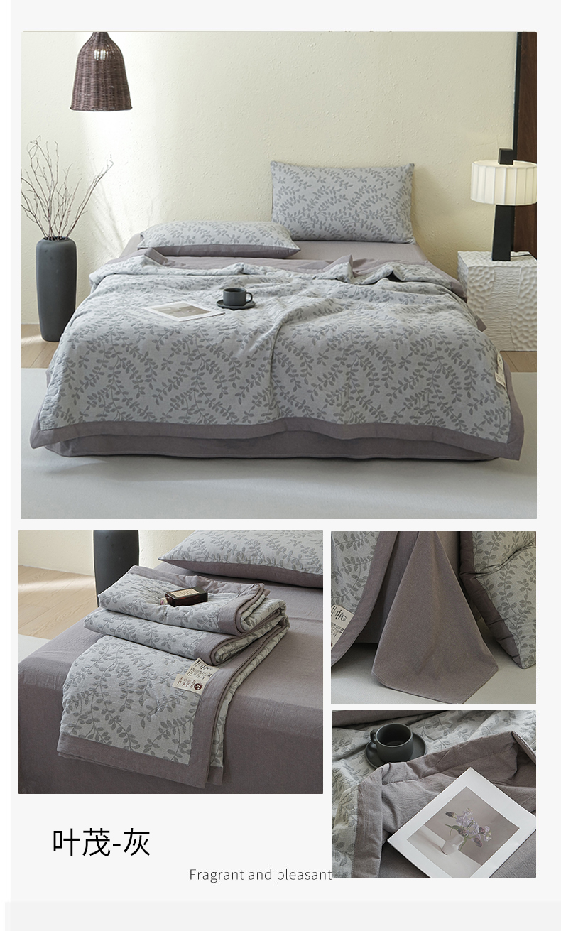 • 91家纺网 家纺一手货源 找家纺 优被业 2025新款A类全棉中古风全棉三层纱提花大豆夏被 灵叶-咖