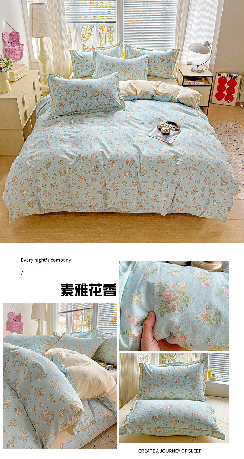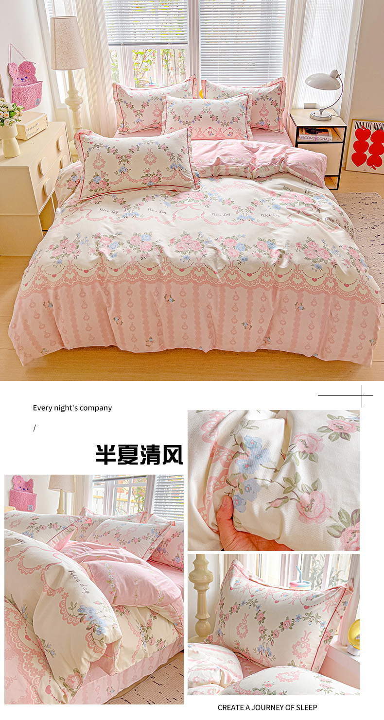 优选良品 2025新款韩版轻奢皱皱纱水洗棉拼色床单床笠四件套三件套-黛粉,黛粉