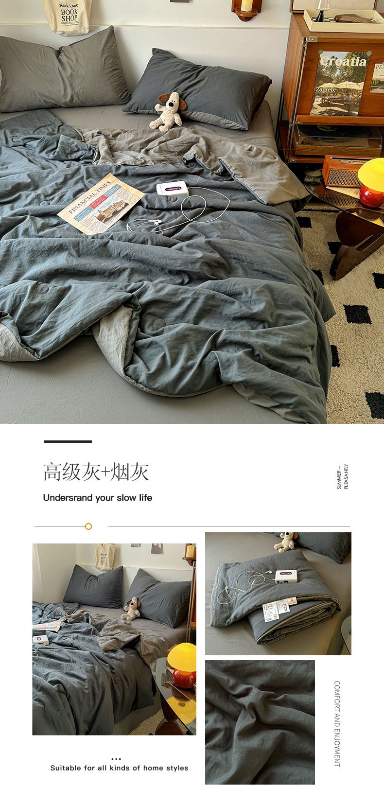 当前位置: 91家纺网 > 商品网购 > 被子 > 夏被 > 耀达家居 2025新款水洗棉双拼夏被四件套 高级灰➕烟灰