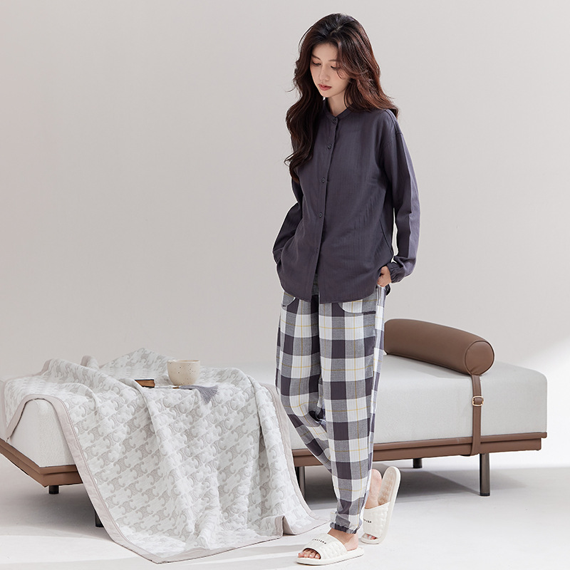 【女士双层纱睡裤】日式无印女士双层纱睡裤良品全棉家居服睡衣裤纯色格纹休闲单长裤,红色格子,黄色格子,紫色格子,绿色格子,紫色纯色,红色纯色,黄色纯色,绿色纯色