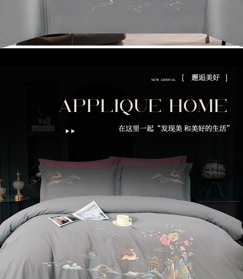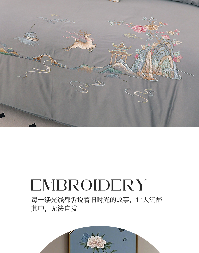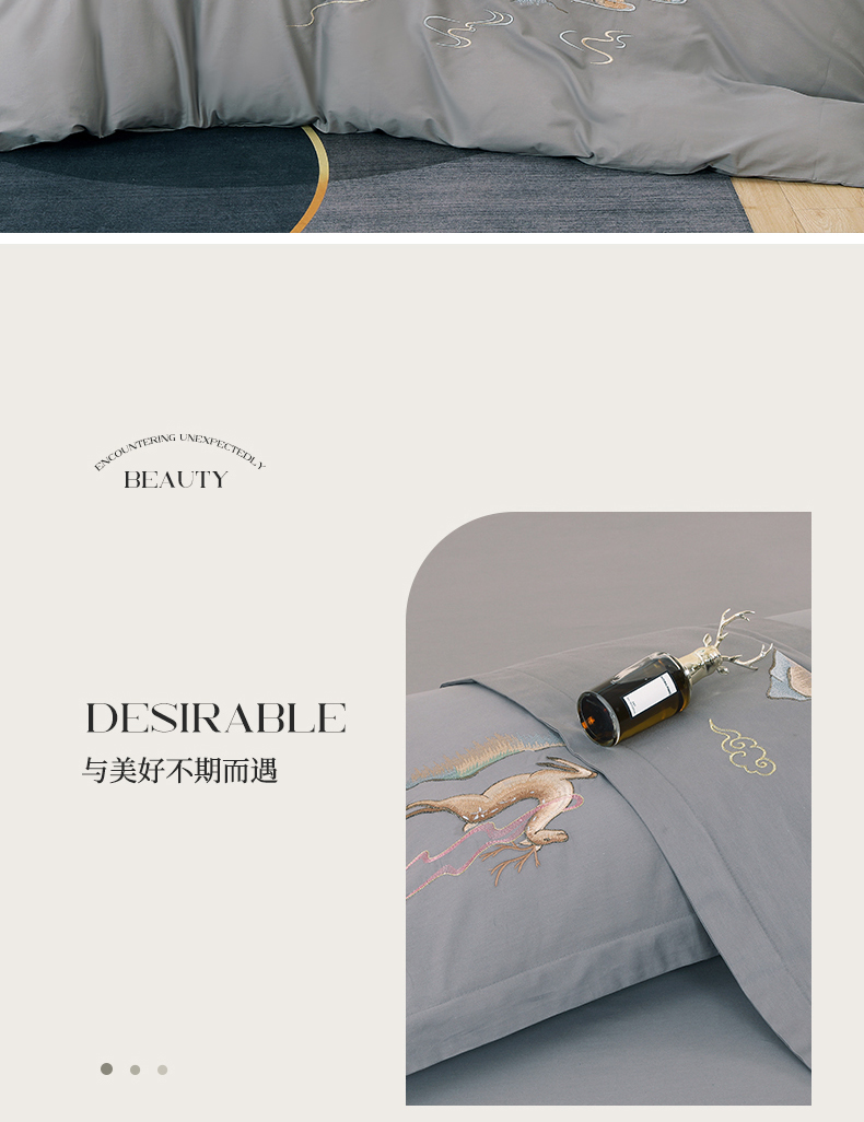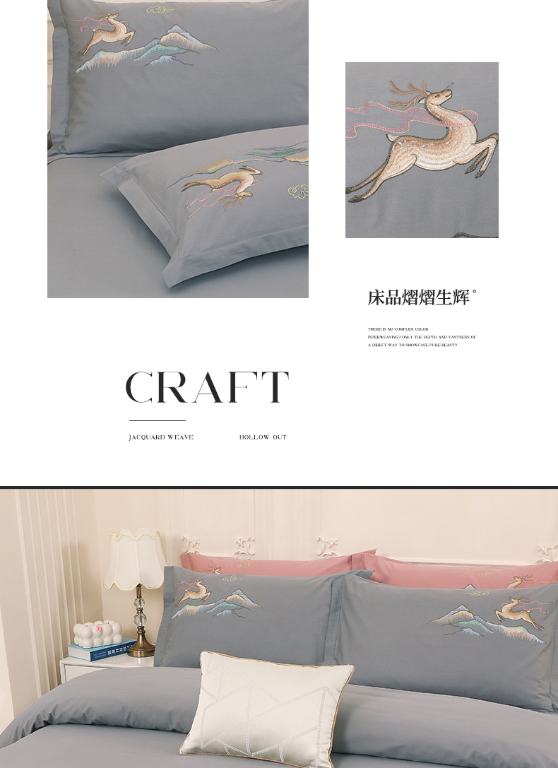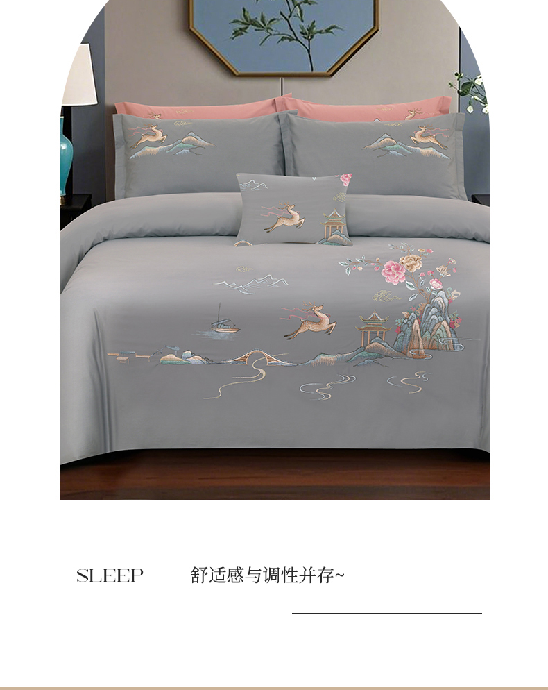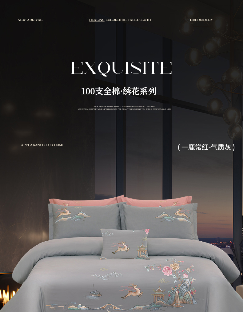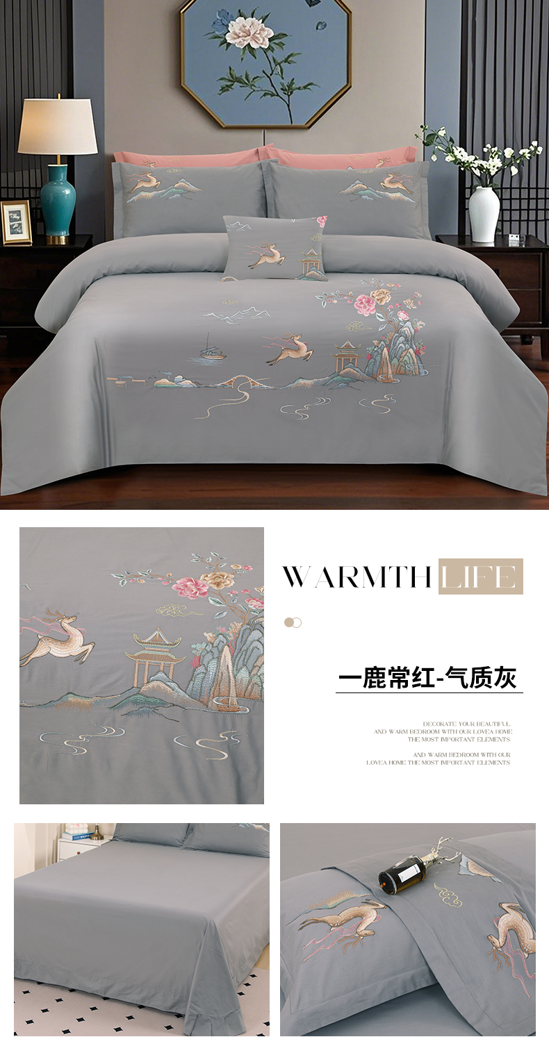 浩情国际婚庆供货中心 2026新款100支全棉高端刺绣四件套一鹿常红系列 一鹿常红-气质灰