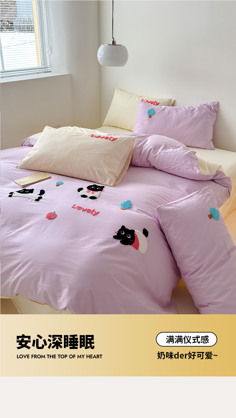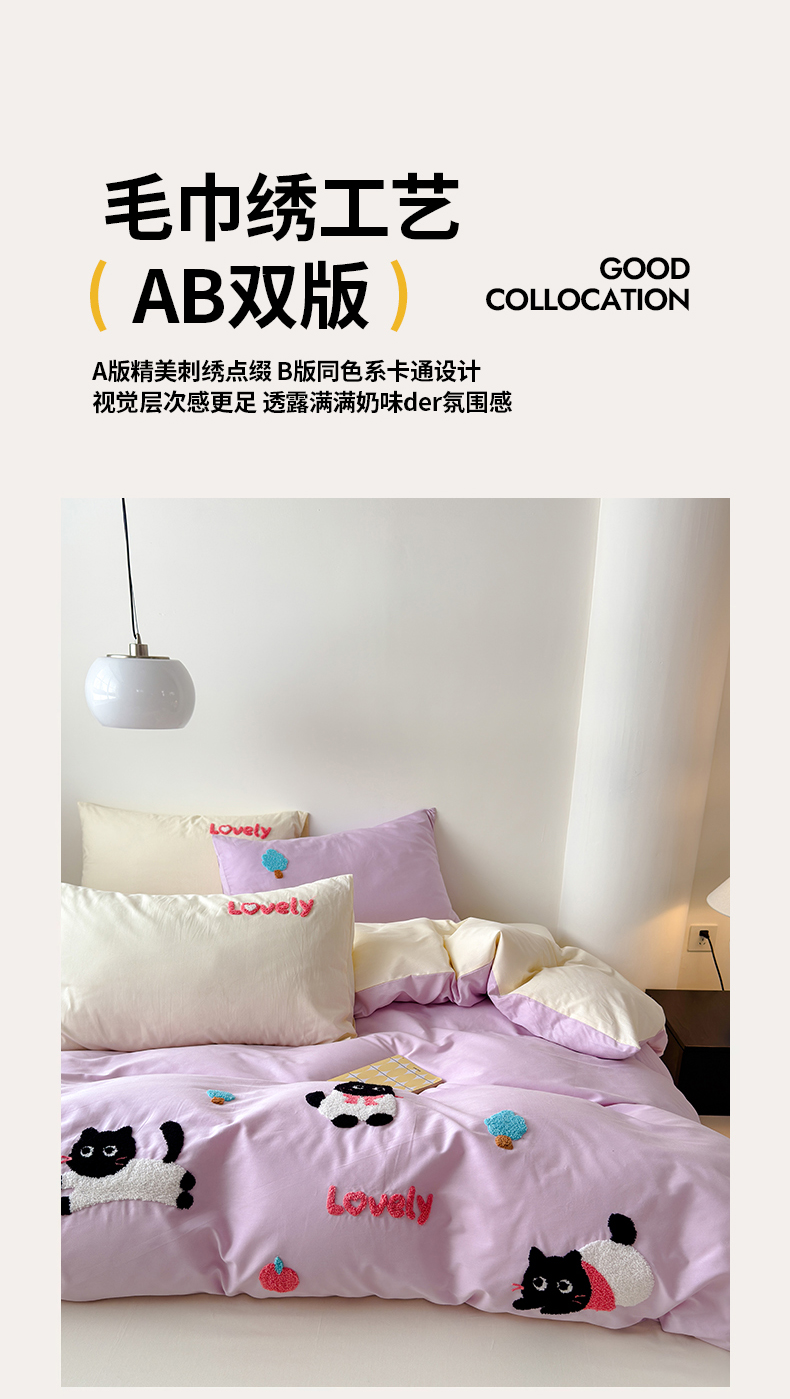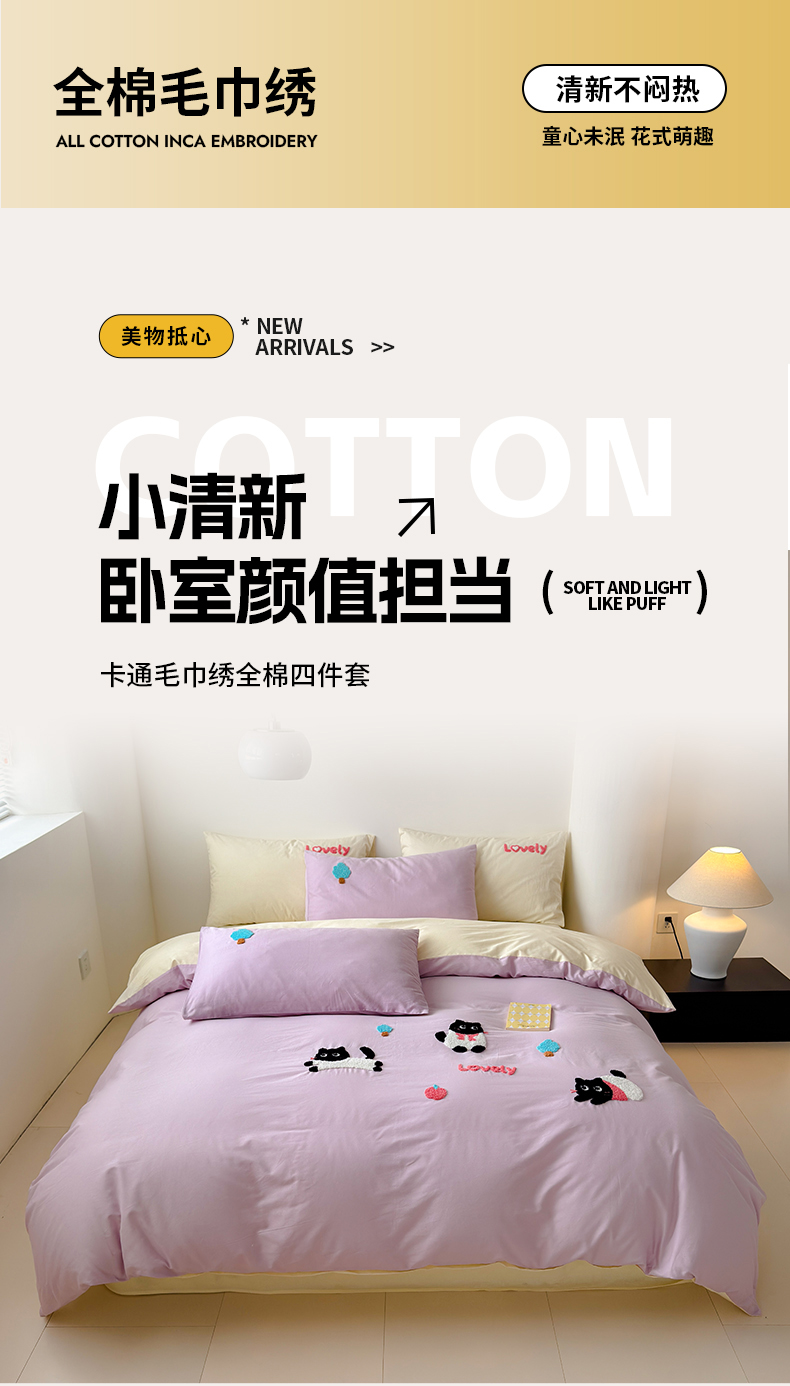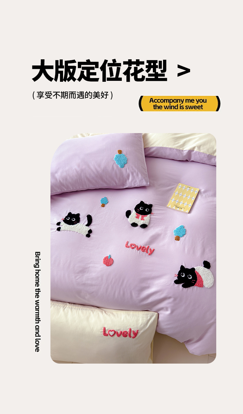当前位置: 91家纺网 > 商品网购 > 床品套件 > 四件套 > 全棉普通四件套 > 锦觅家纺 2025新款卡通小清新毛巾绣全棉纯棉四件套(大版定位花型) 嬉戏猫咪