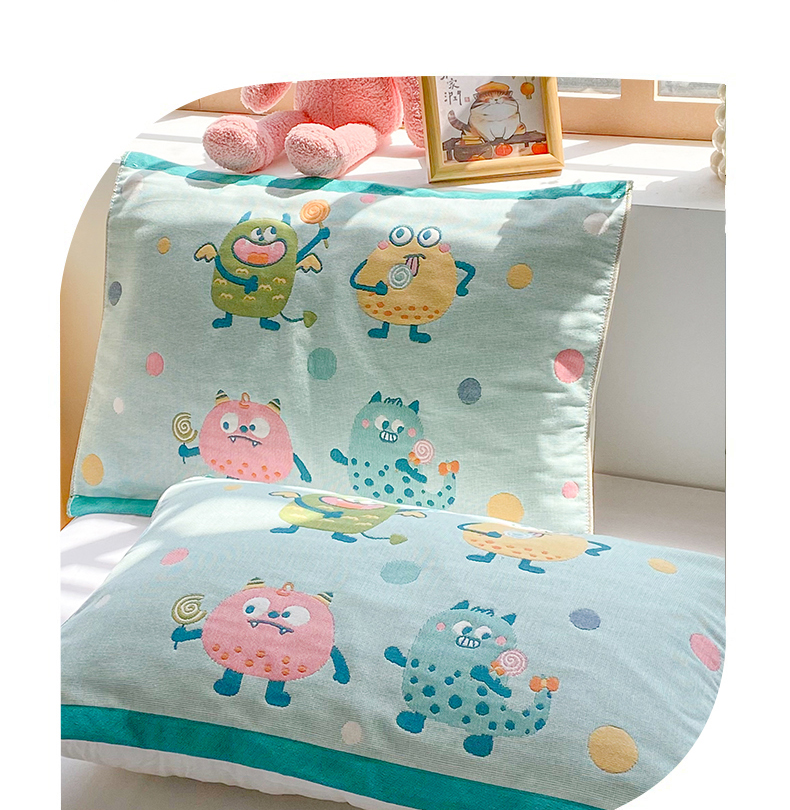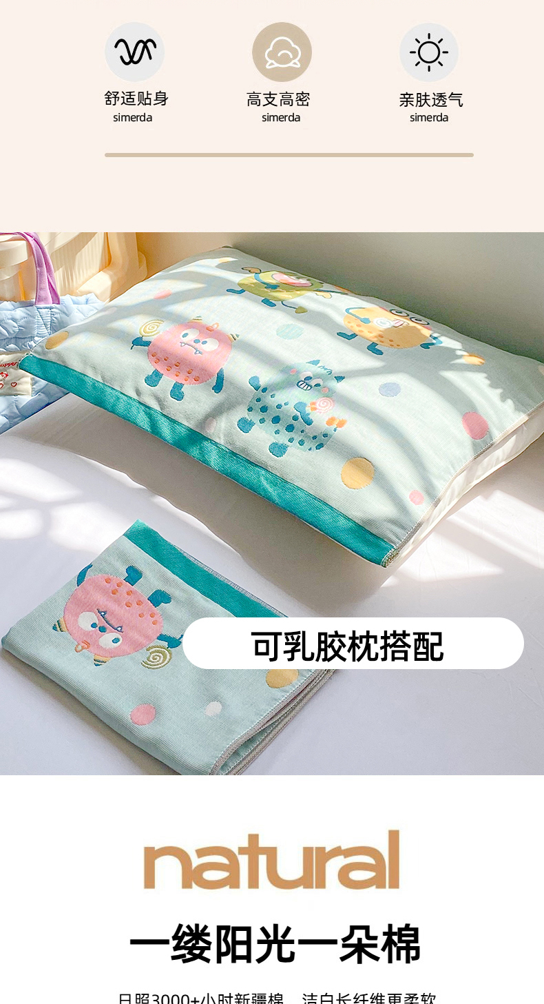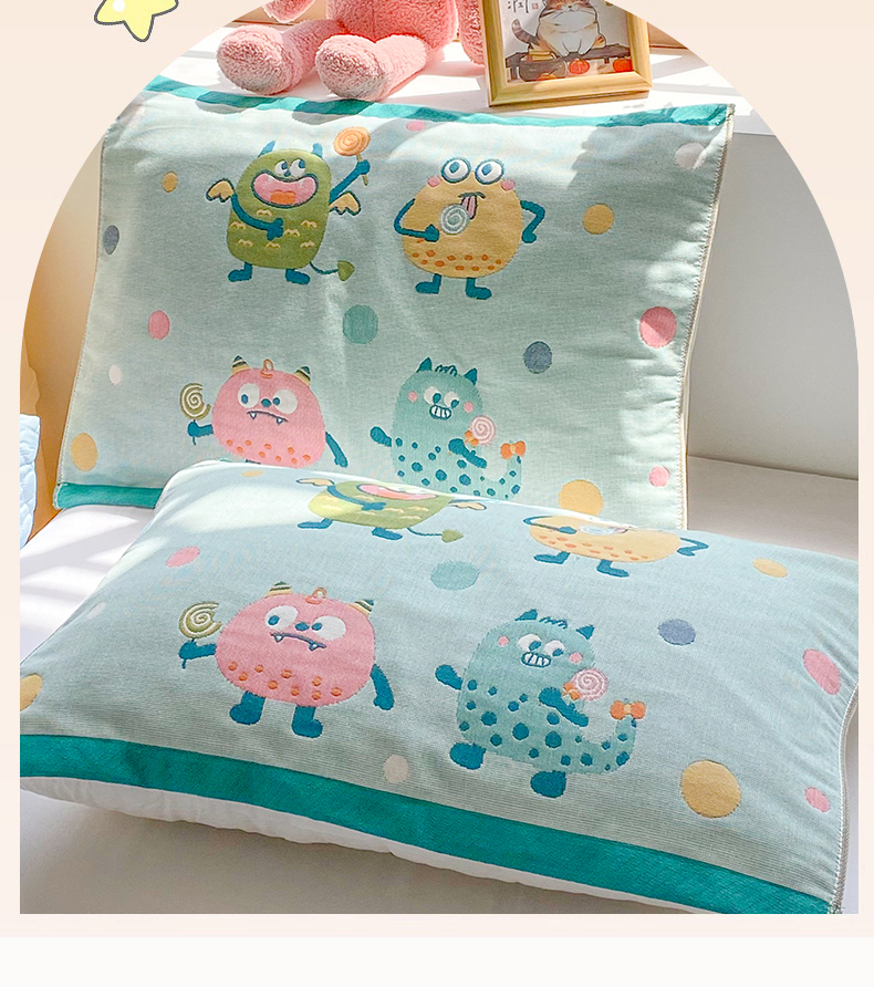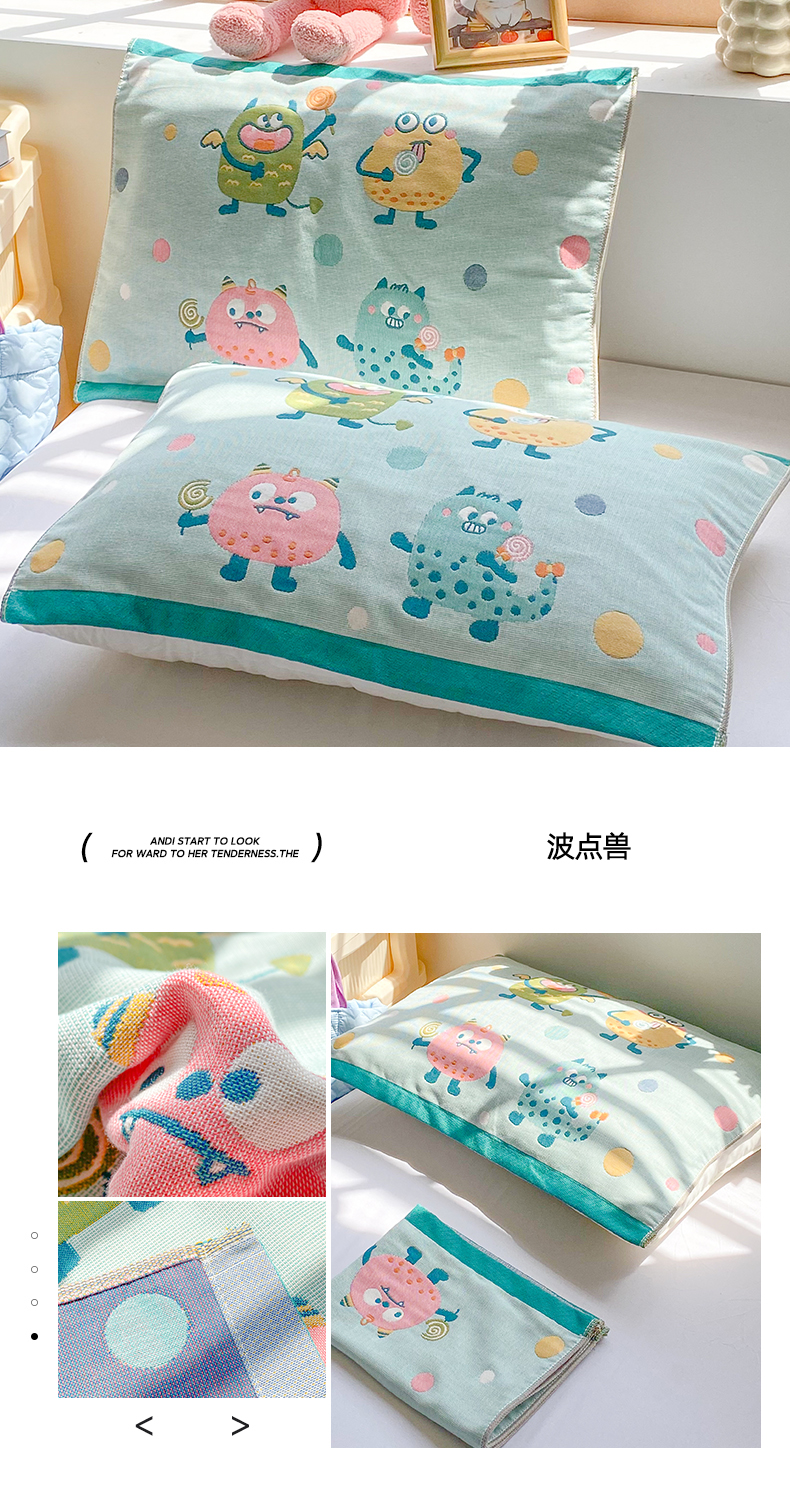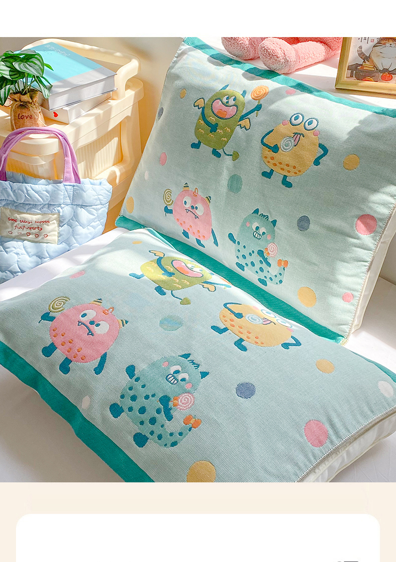 商品名称:美宜家 2025新款40*60儿童纯棉A类纱布枕巾乳胶专用高档枕巾 波点兽 一对
