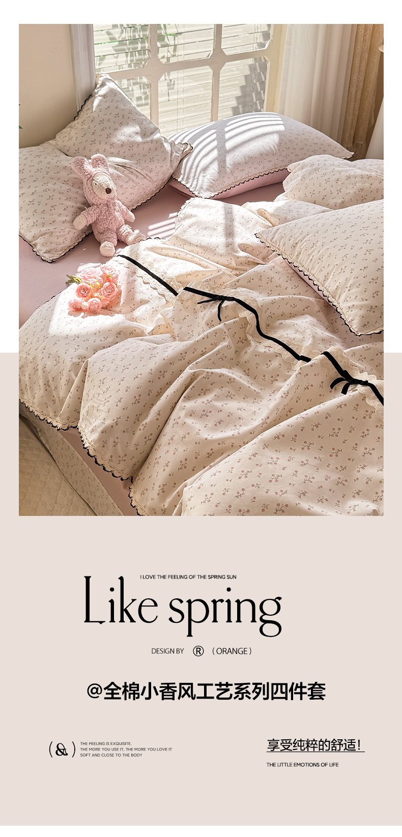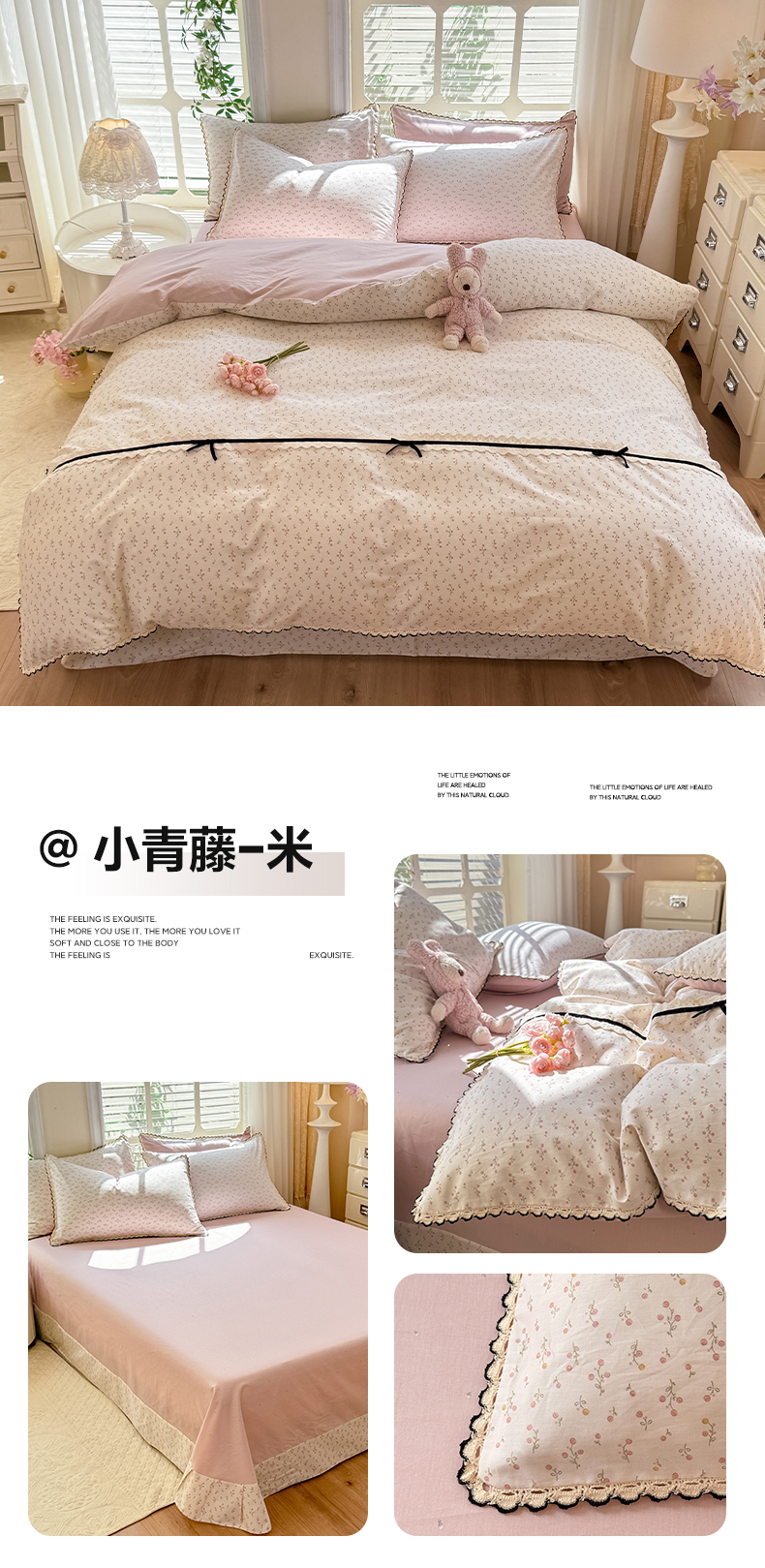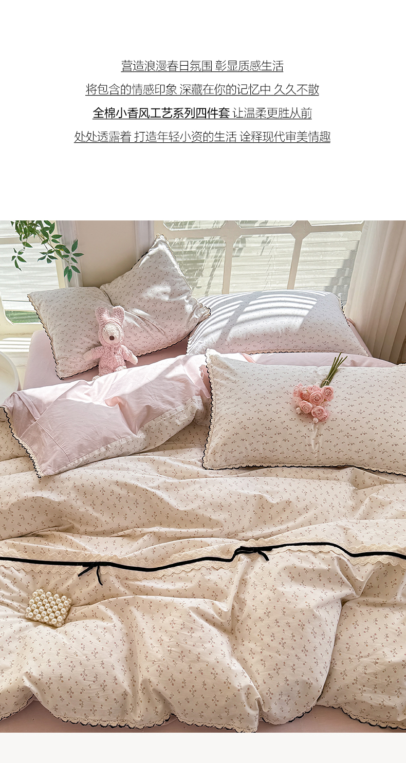 商品名称:艾唯希2025新款全棉小香风工艺四件套纯棉小花边碎花被套韩式公主风 小青藤-米
