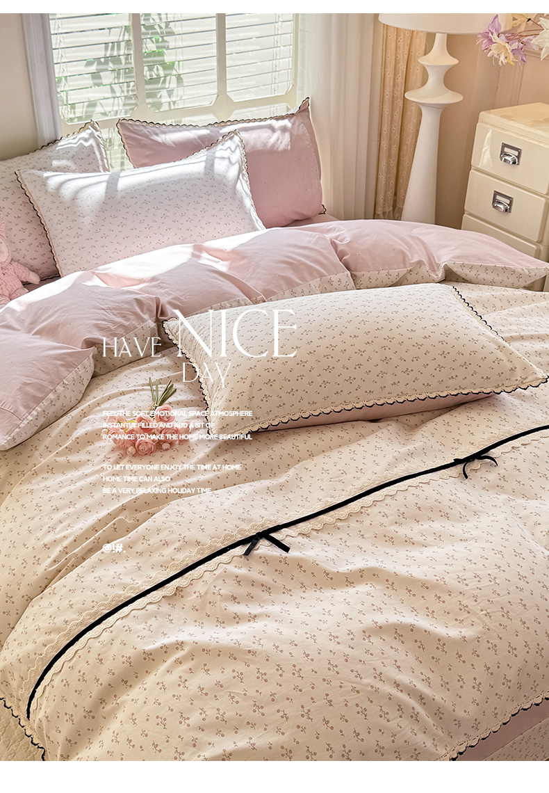 艾唯希2025新款全棉小香风工艺四件套纯棉小花边碎花被套韩式公主风 小青藤-米