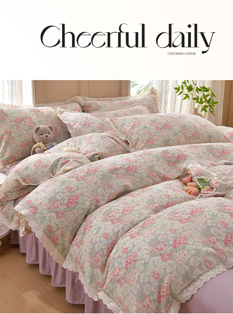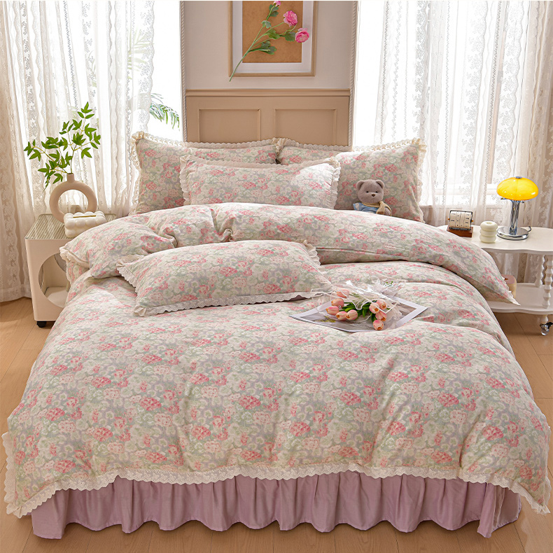 绘萱家居 2025新款100%全棉双层纱花边床裙款四件套 CQ茉莉清雨