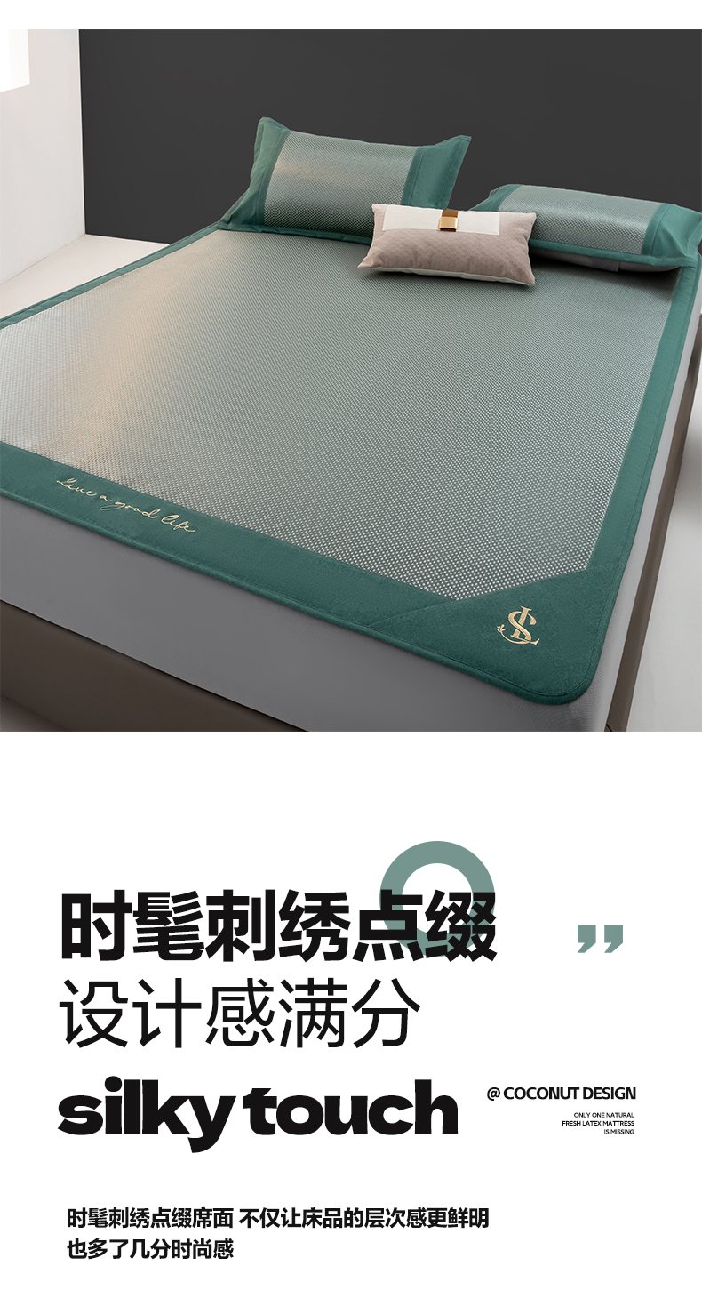 宜家坊 2025新款A类纯色绣花冰藤席凉席三件套 松花绿-床笠款