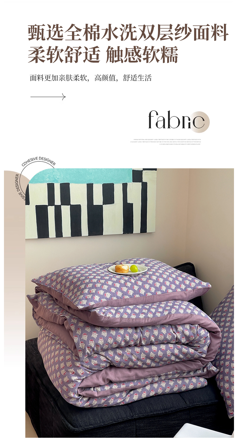 萝莉家纺 2025新款全棉复古美式风水洗双层纱印花四件套 花蕾紫