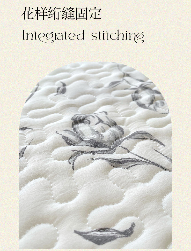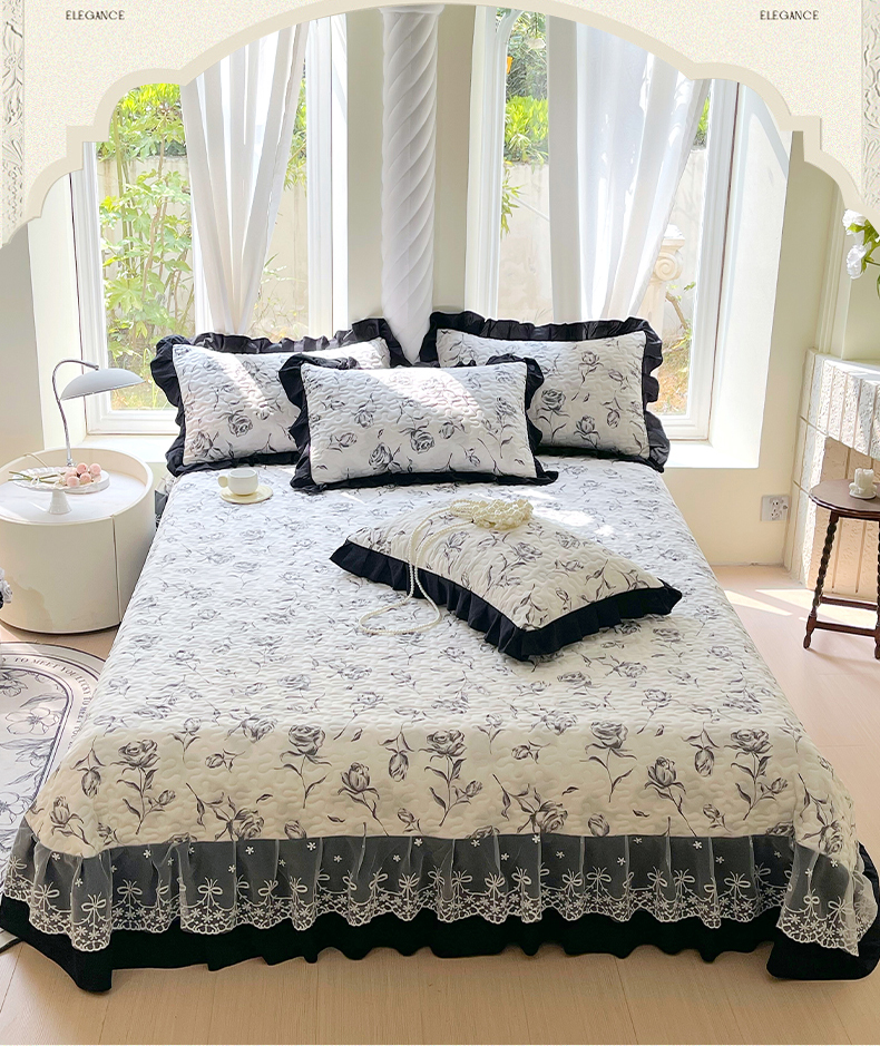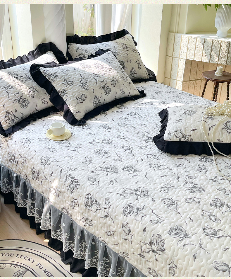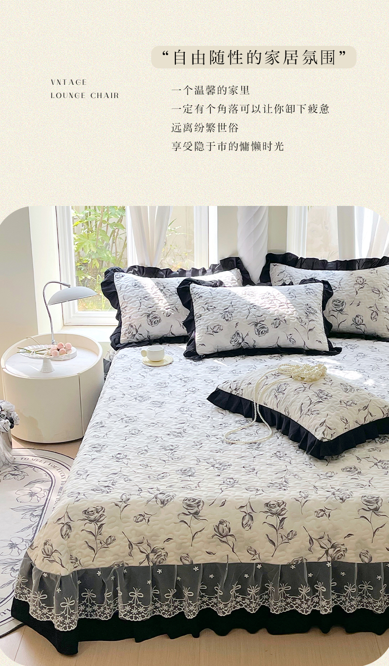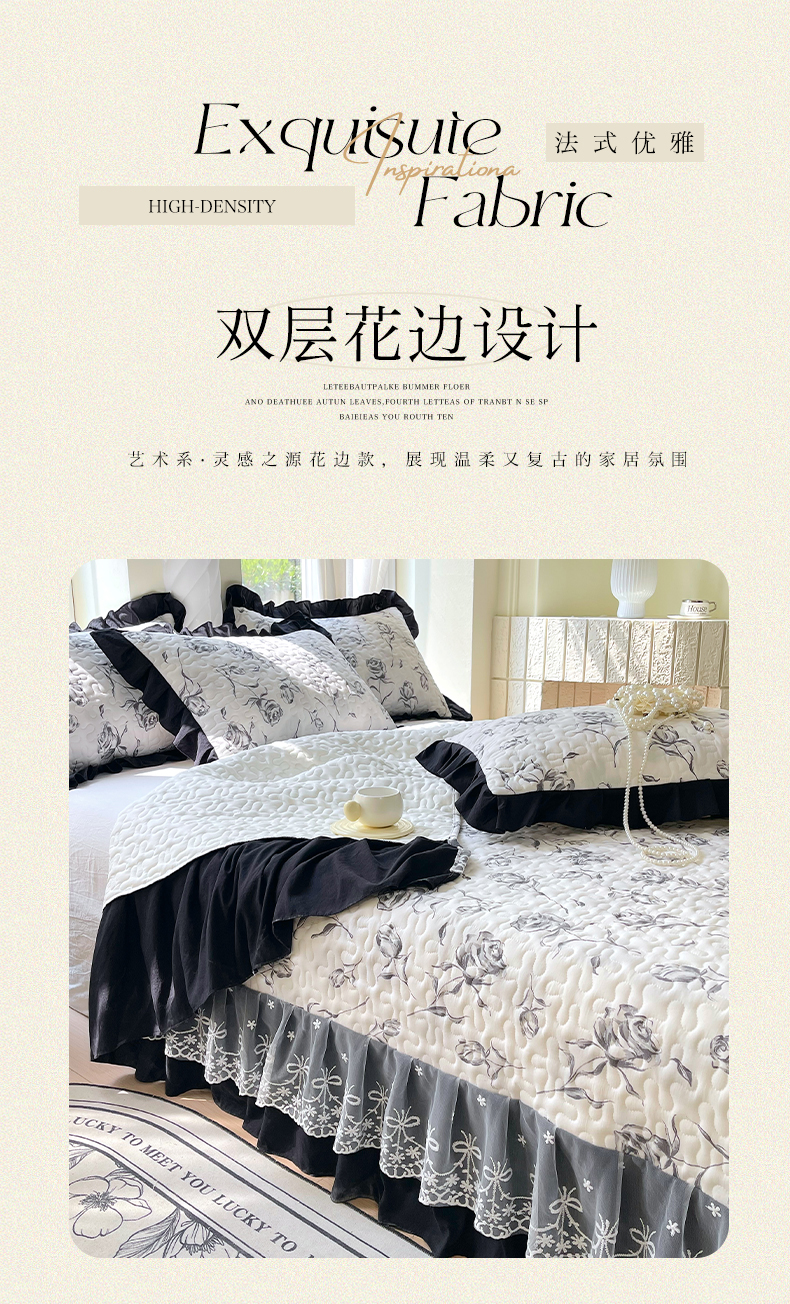 雨彤家纺 2025年新款赫本风云朵水洗棉夹棉双层花边床盖 水墨玫瑰-赫本风