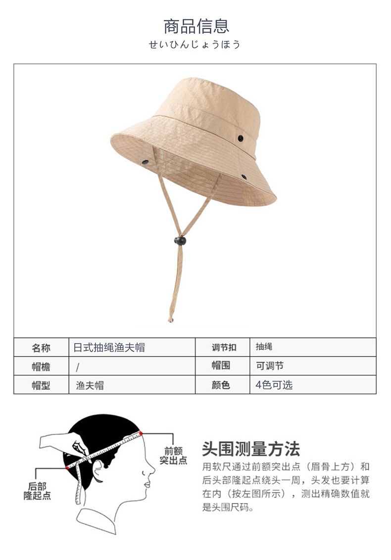 商品名称:良品汇馆 2025新款日式无印速干抽绳渔夫帽良品遮阳夏季男女防晒薄钓鱼户外透气帽子 卡其色