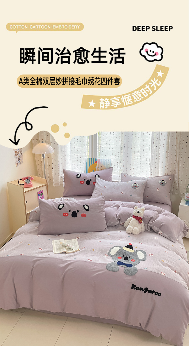(总)寐居家纺 2025新款全棉纯棉A类双层纱拼接毛巾绣花四件套