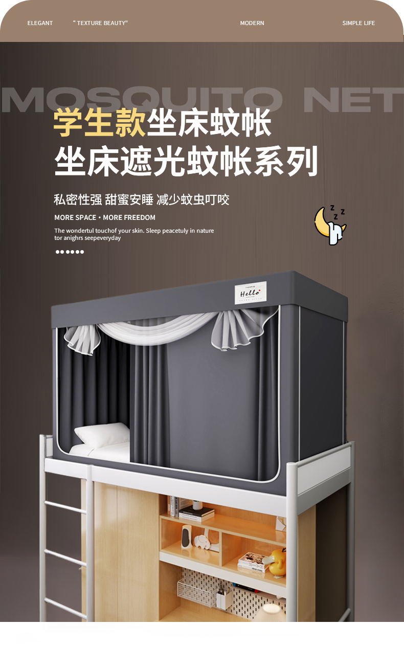 • 91家纺网 家纺一手货源 找家纺 青竹苑 2025新款织标印花纯色强遮光坐床学生蚊帐 纯色灰色