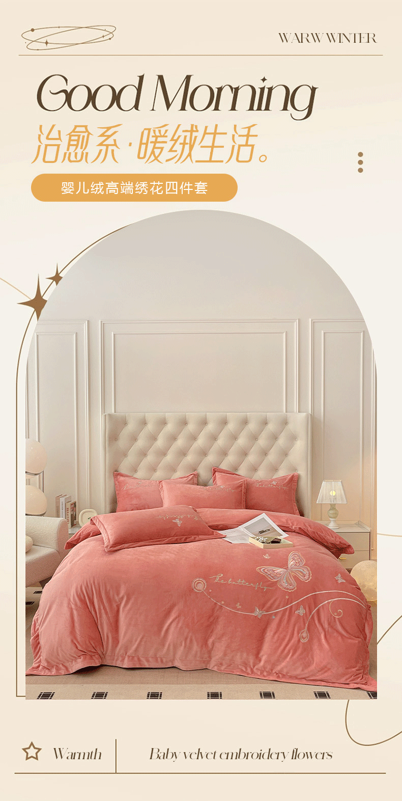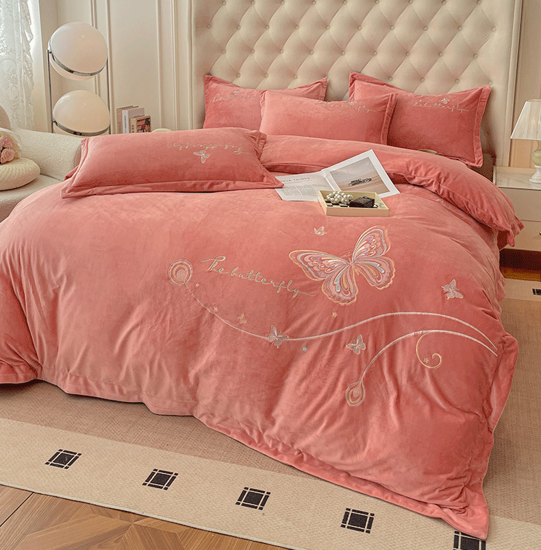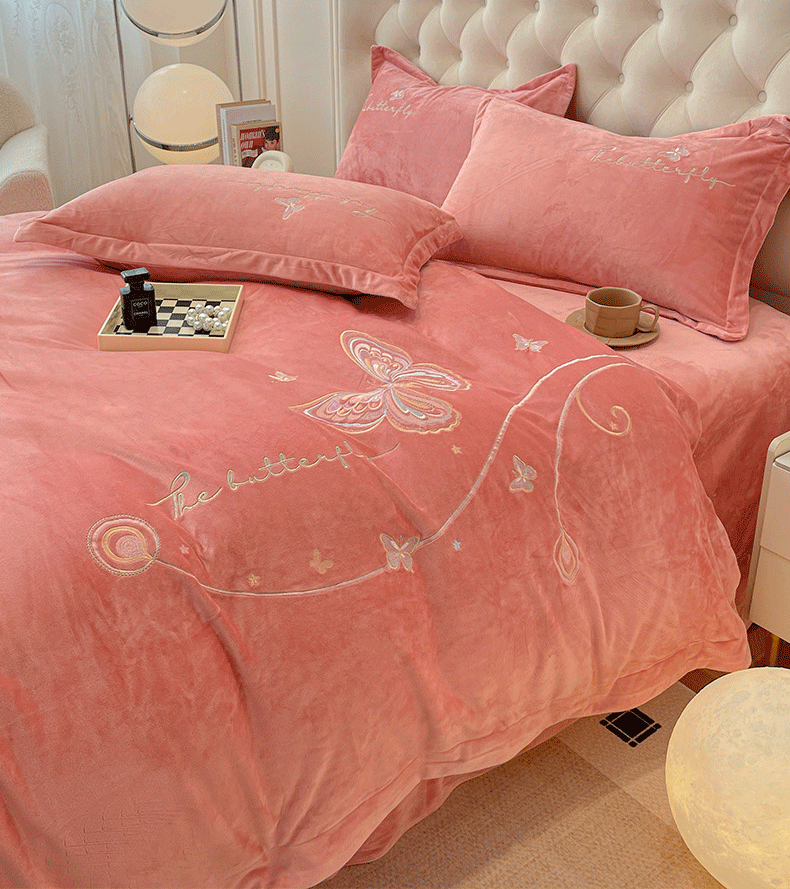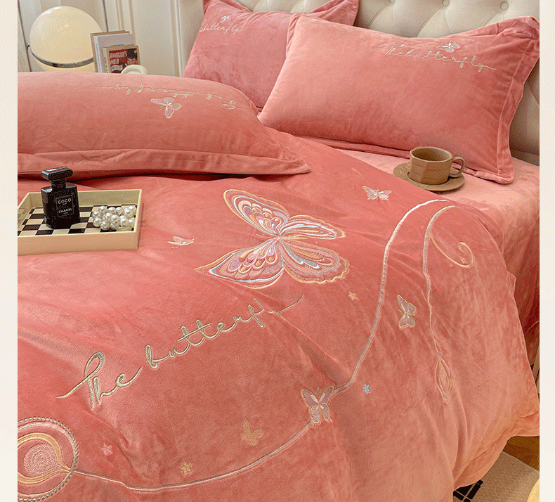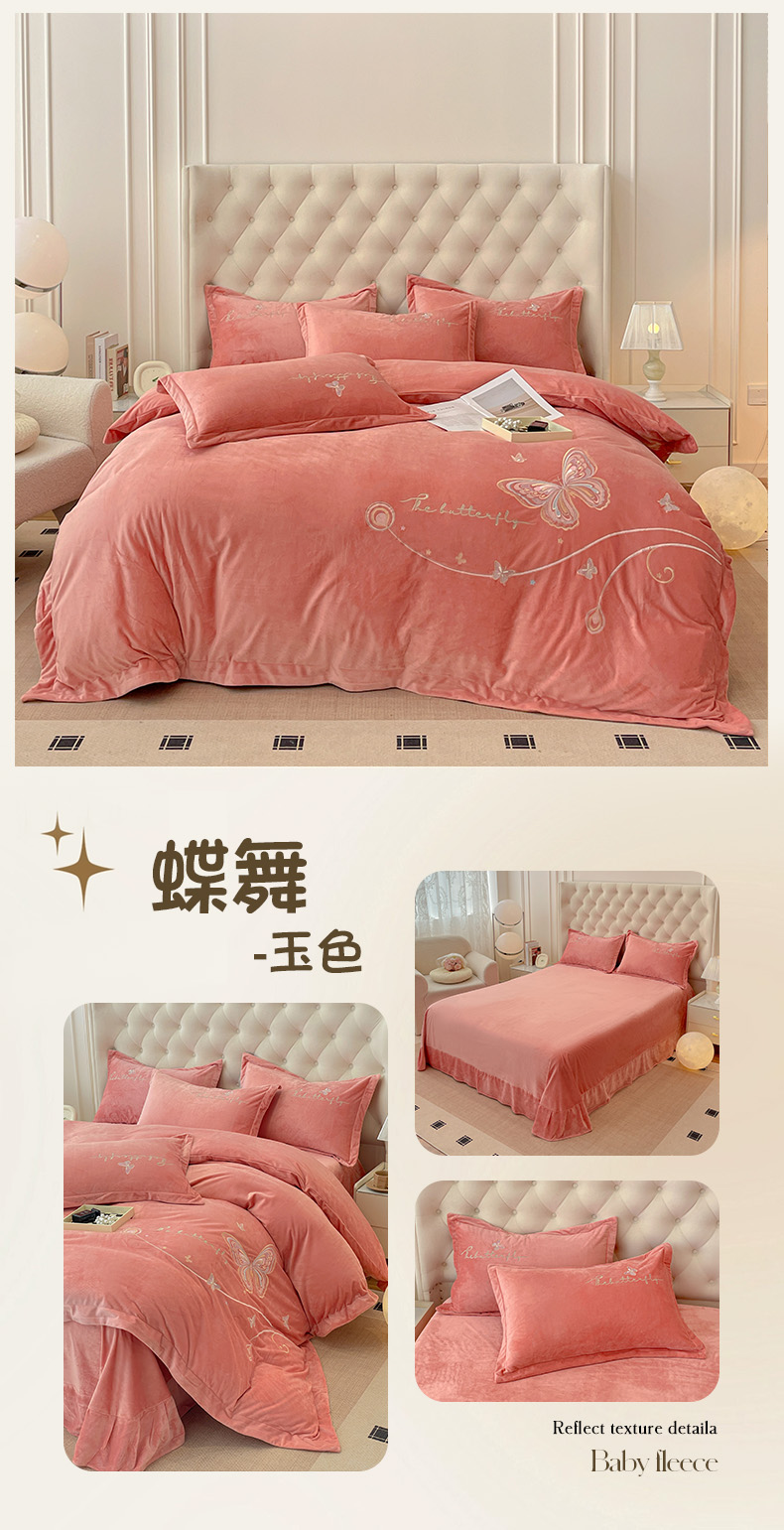 商品名称:艺玲家纺 2025新款婴儿绒高端绣花四件套 蝶舞-玉色