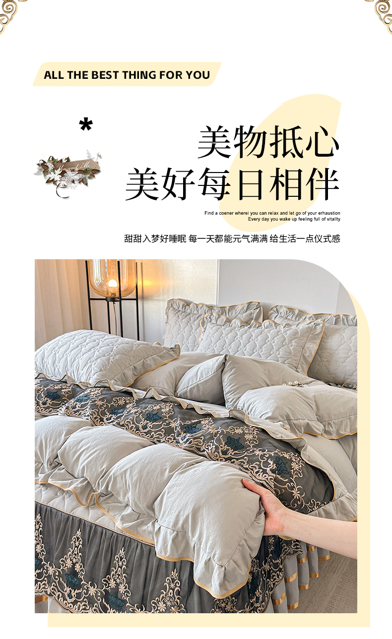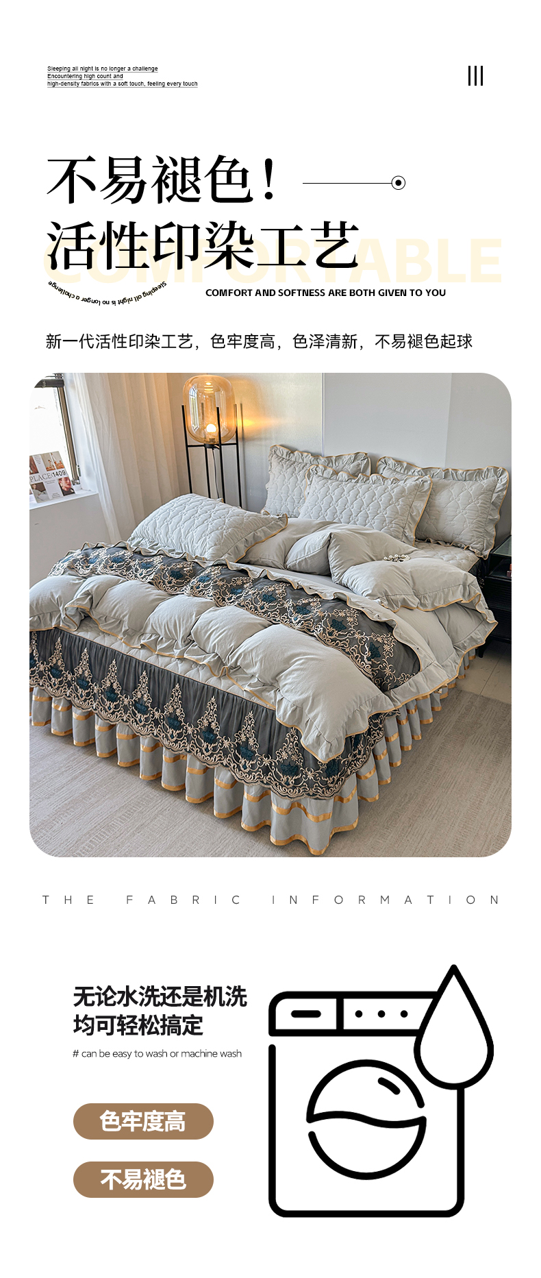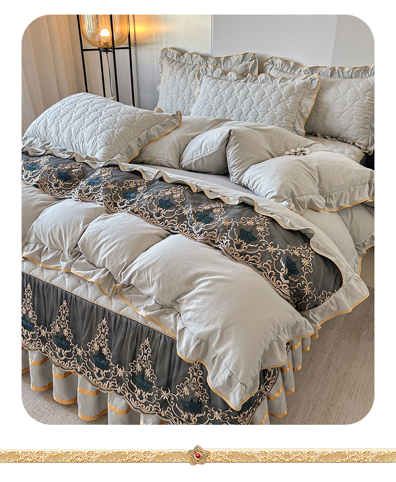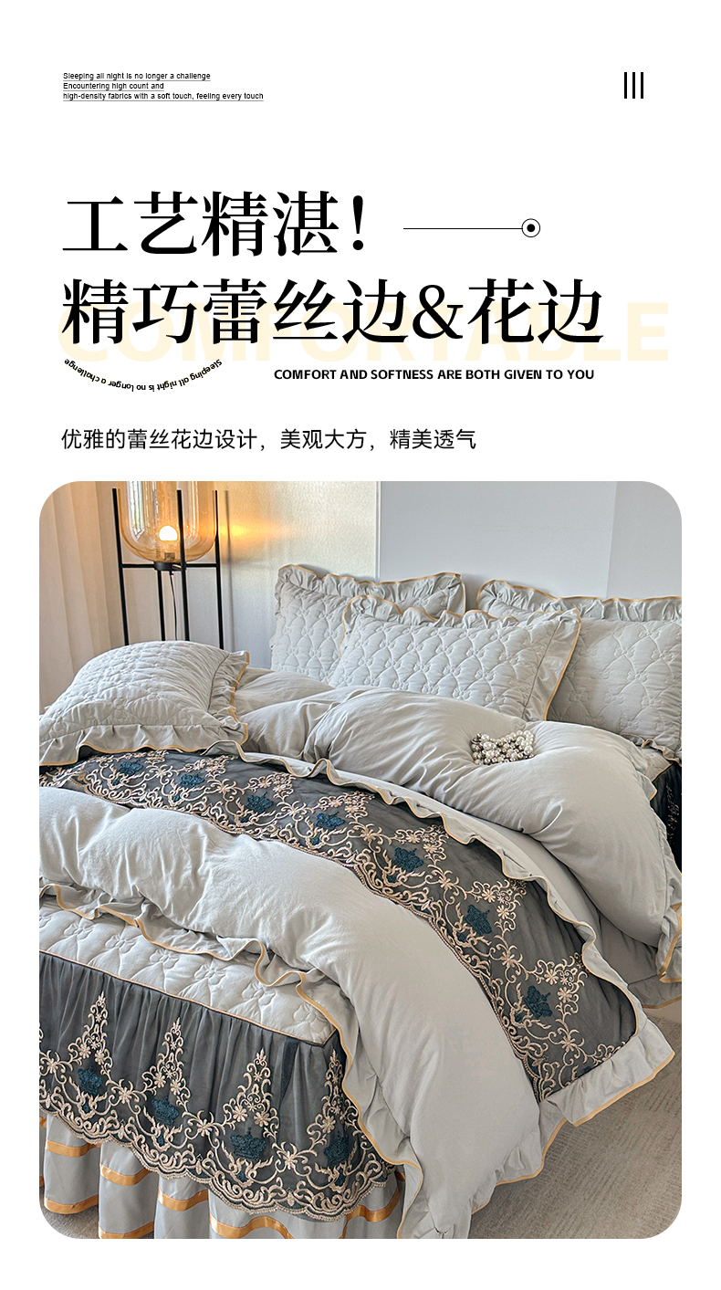 当前位置: 91家纺网 > 商品网购 > 床品套件 > 四件套 > 水洗棉四件套 > 屹成家纺 2025新款水洗棉床裙款四件套-倾城 倾城-银灰