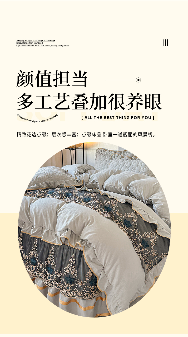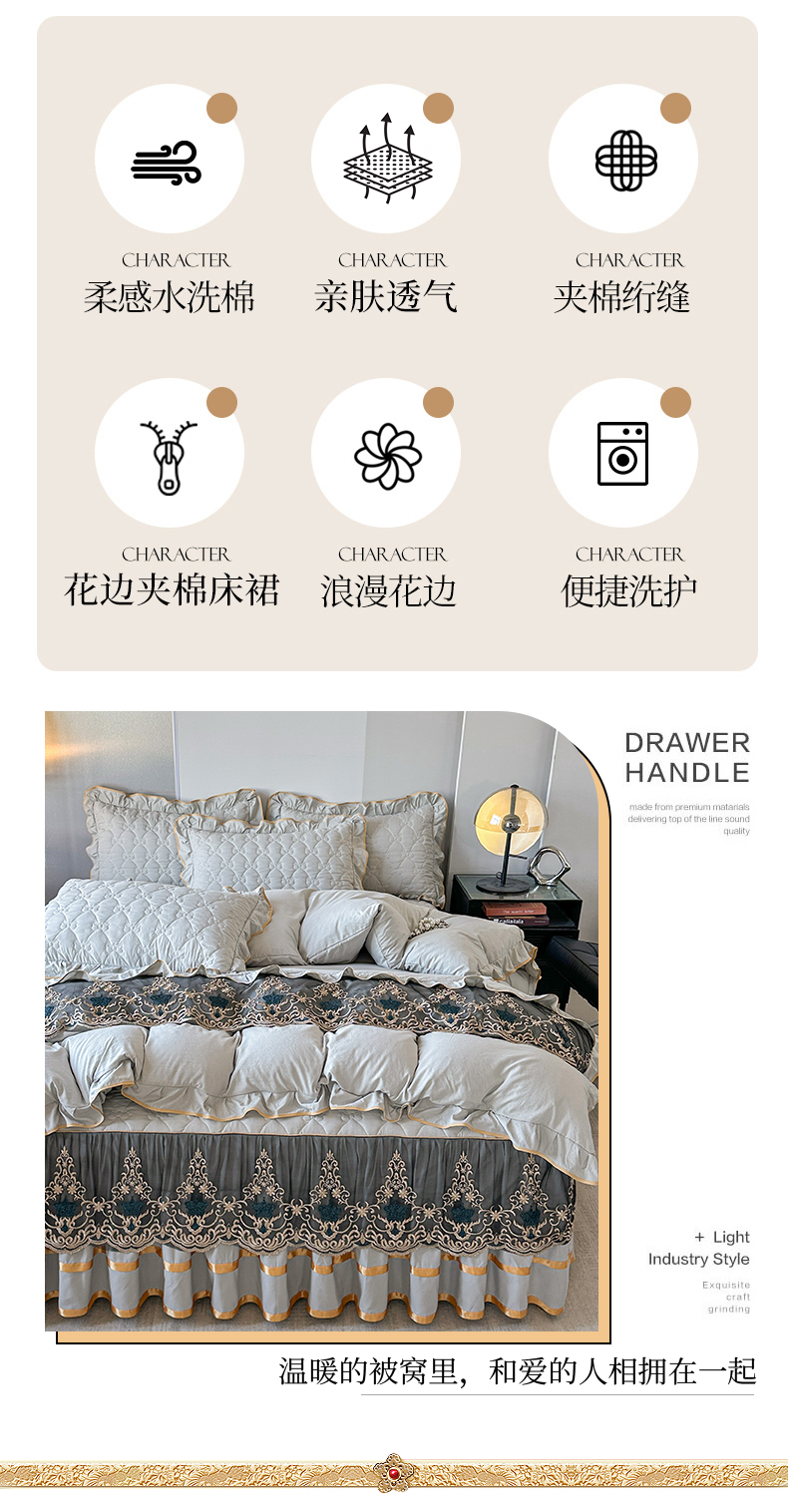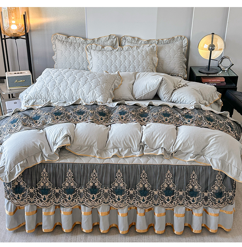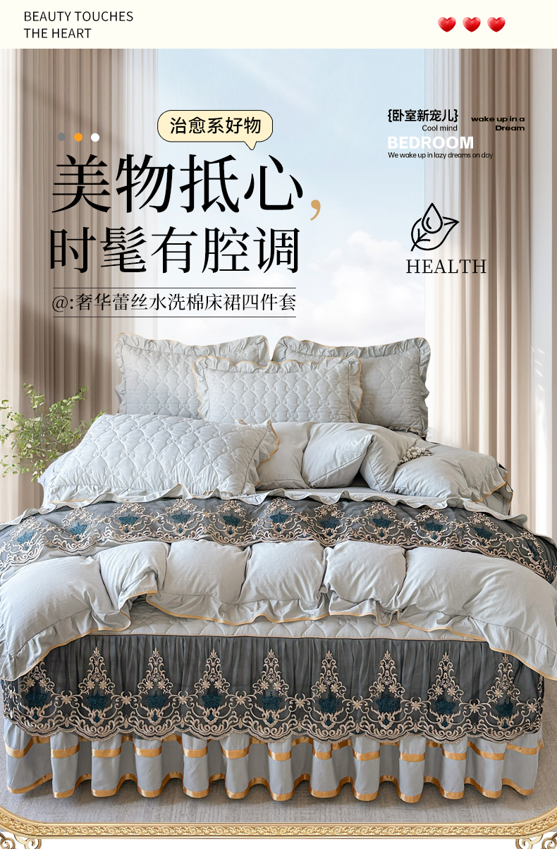 当前位置: 91家纺网 > 商品网购 > 床品套件 > 四件套 > 水洗棉四件套 > 屹成家纺 2025新款水洗棉床裙款四件套-倾城 倾城-银灰