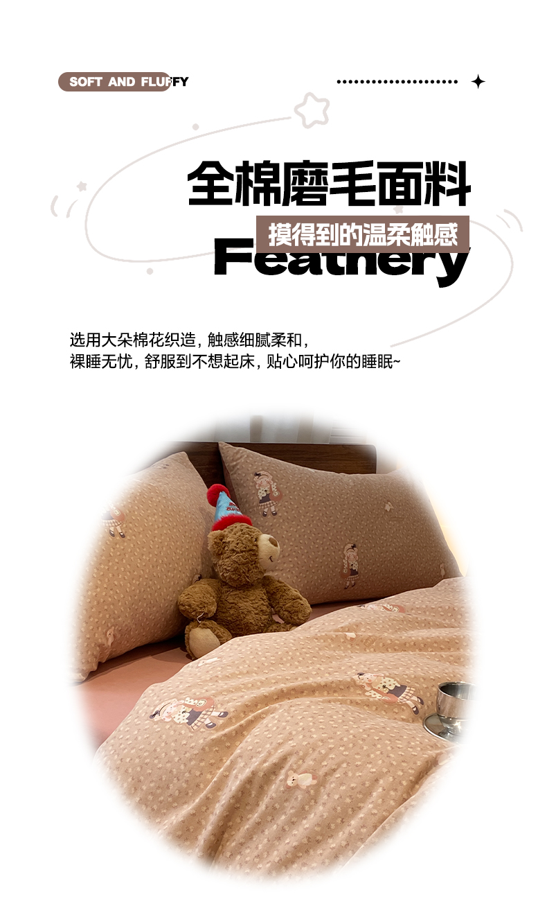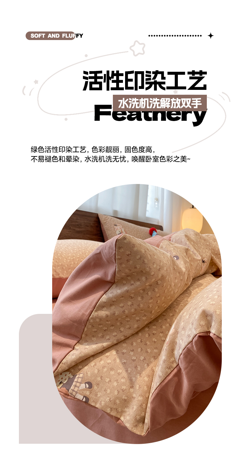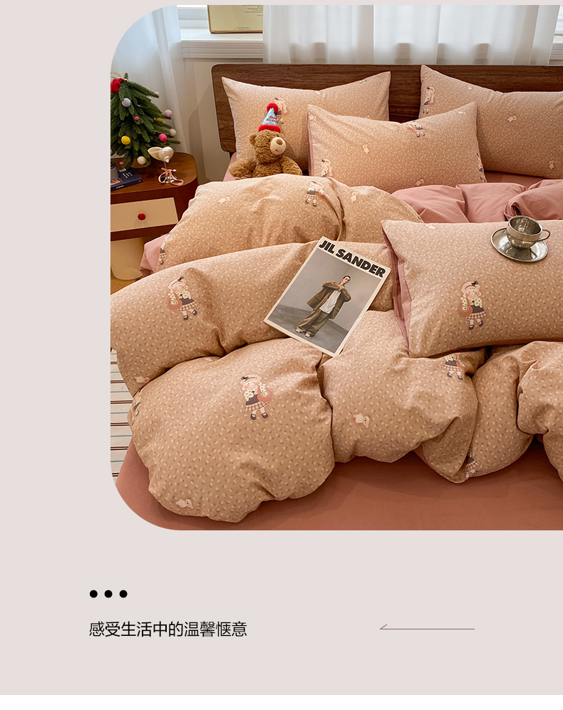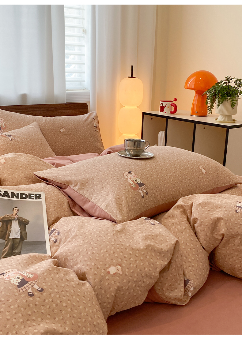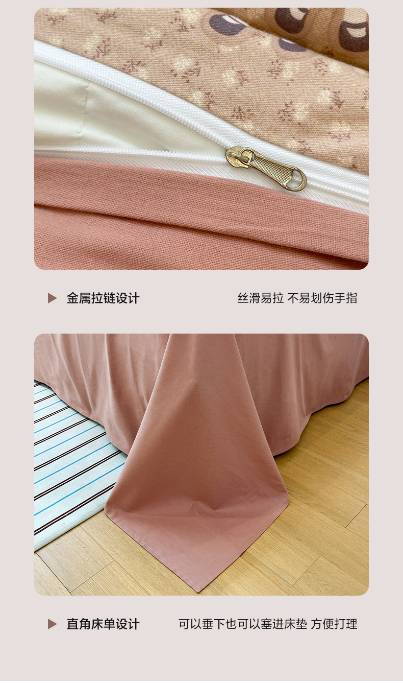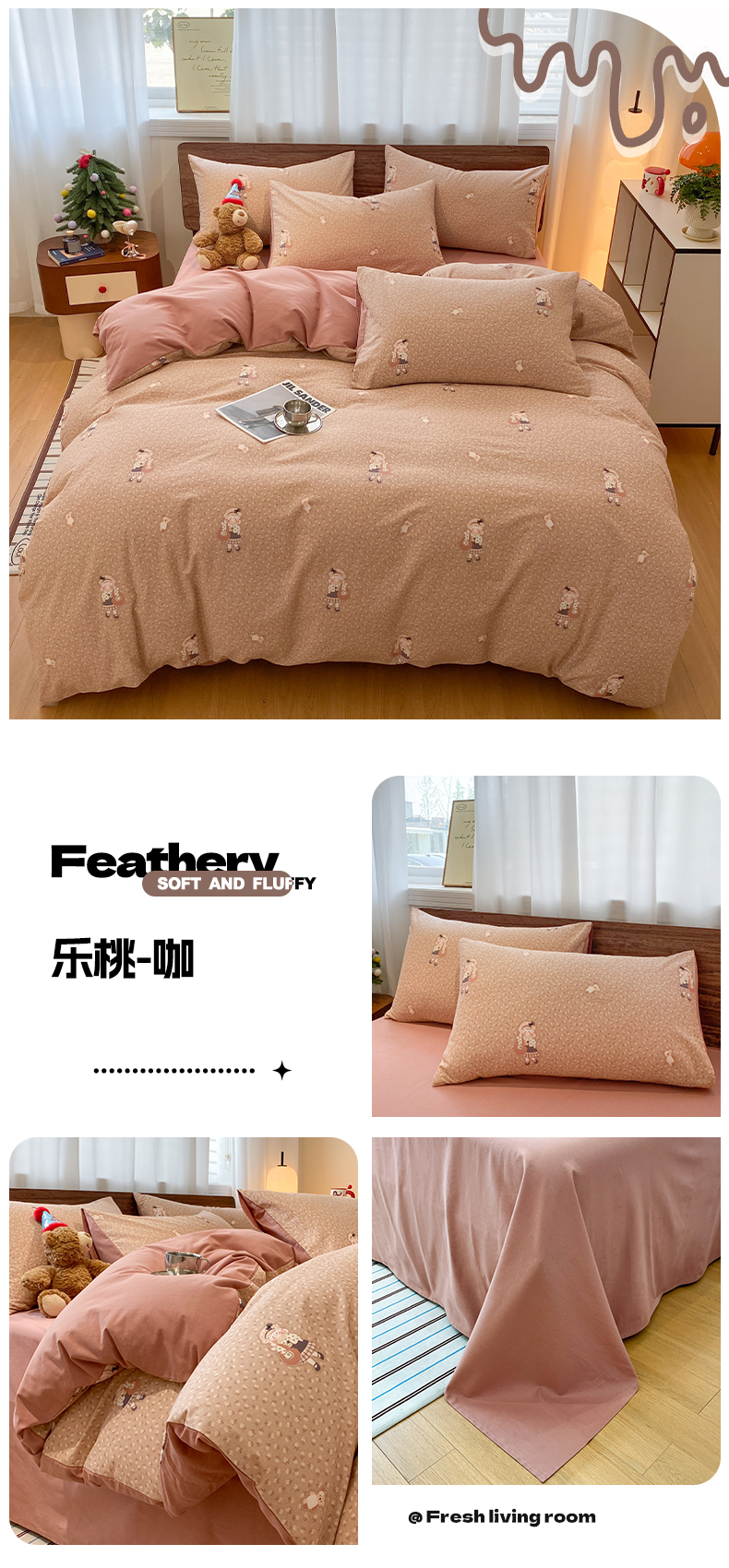 当前位置: 91家纺网 > 商品网购 > 床品套件 > 四件套 > 全棉普通四件套 > 莱登卡奴 2025新款A类100%全棉磨毛条格卡通系列四件套 乐桃-咖