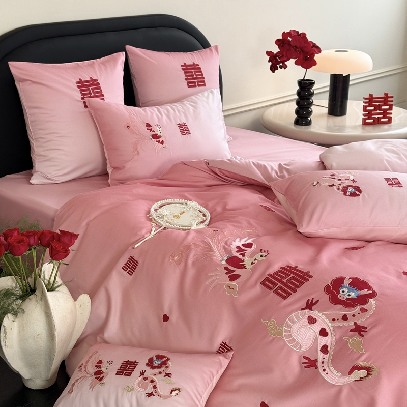 江涞 2025新款长绒棉数码印花刺绣四件套--小美满 小美满-粉