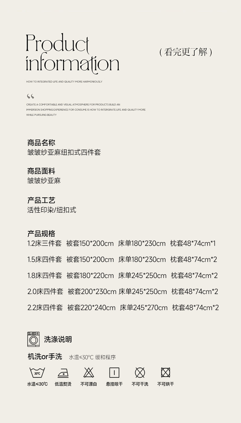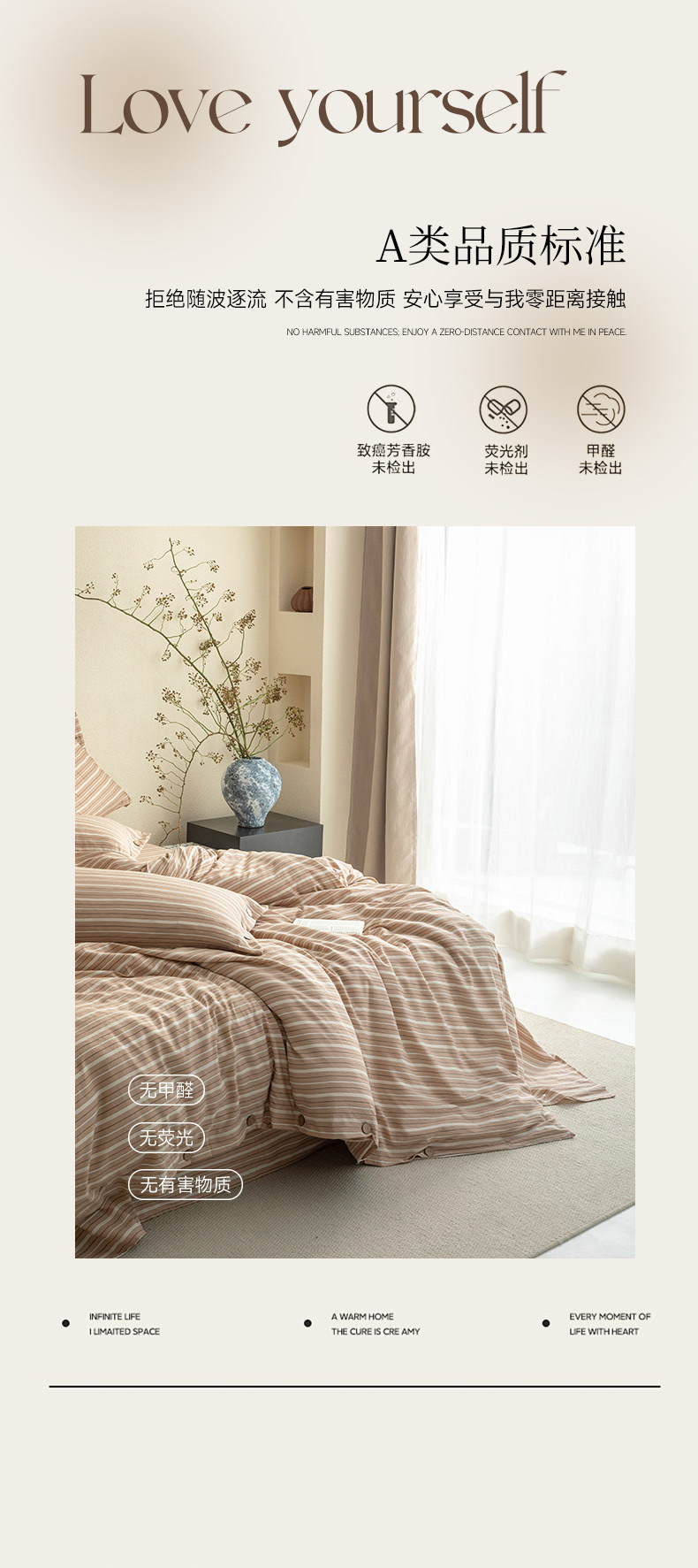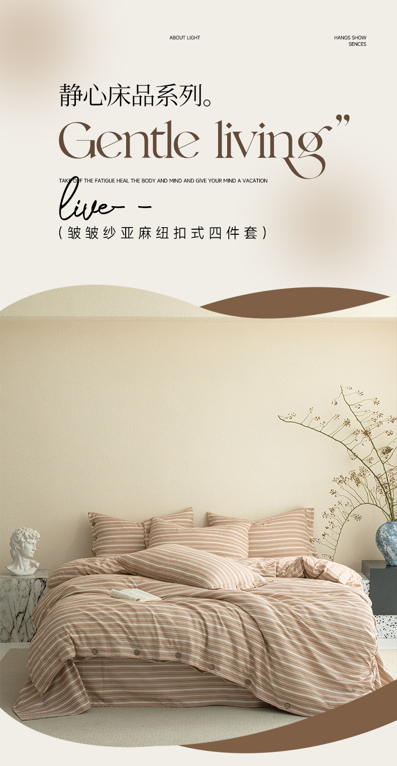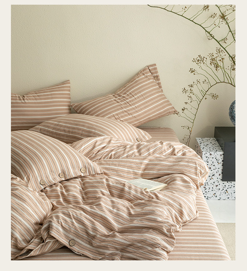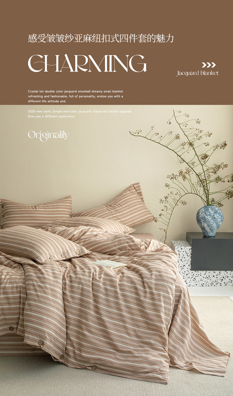 当前位置: 91家纺网 > 商品网购 > 床品套件 > 四件套 > 化纤活性四件套 > 库里梦家纺 2025新款皱皱纱亚麻纽扣式四件套 条纹-咖