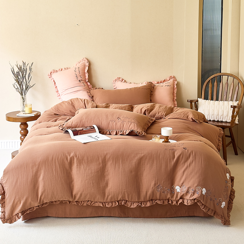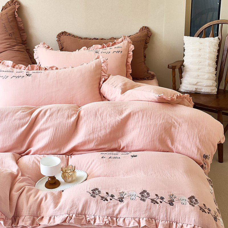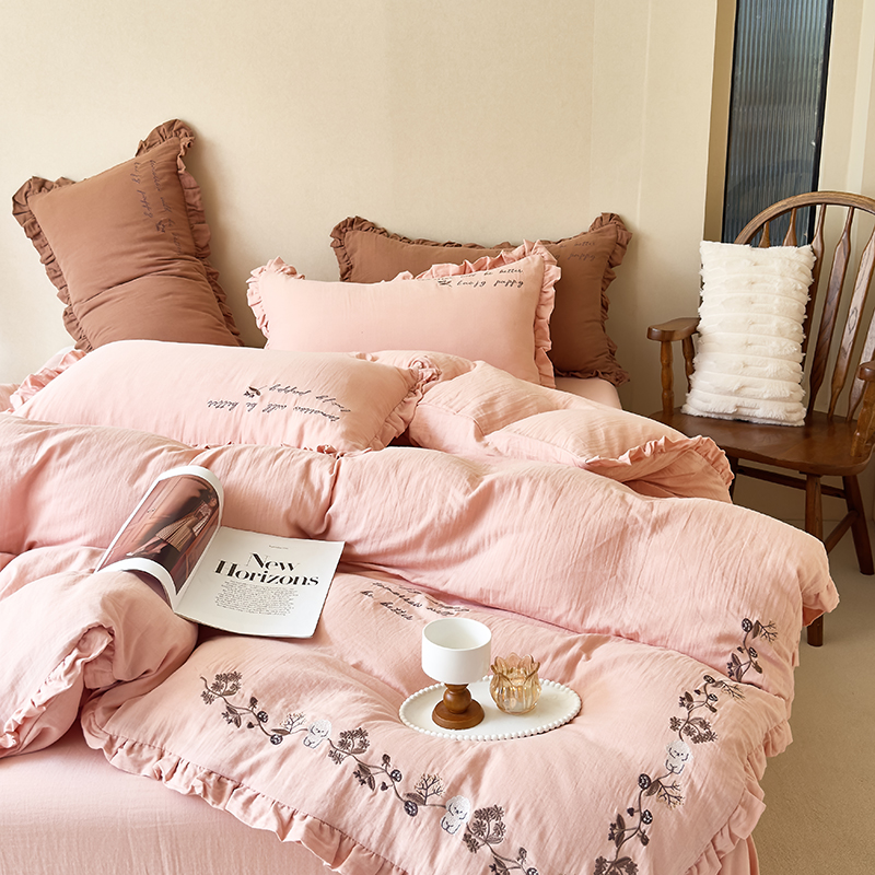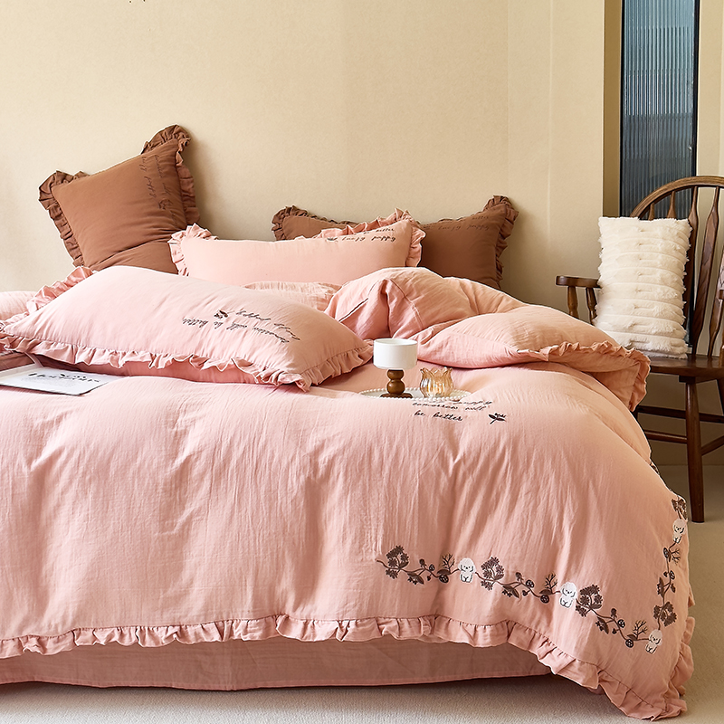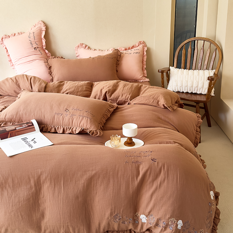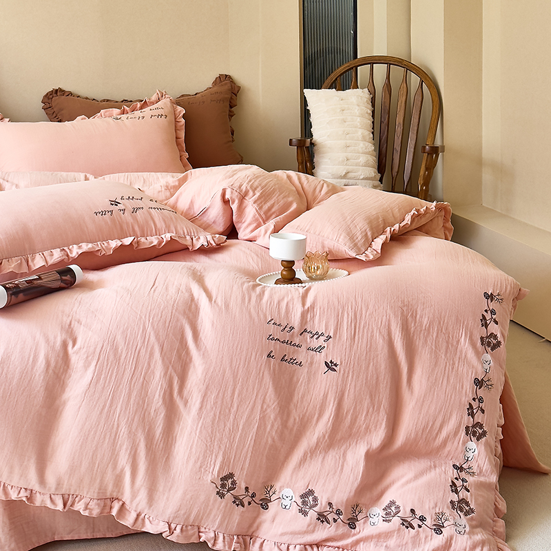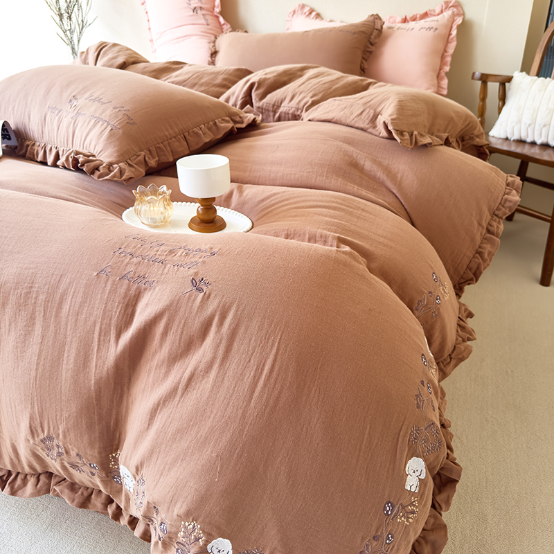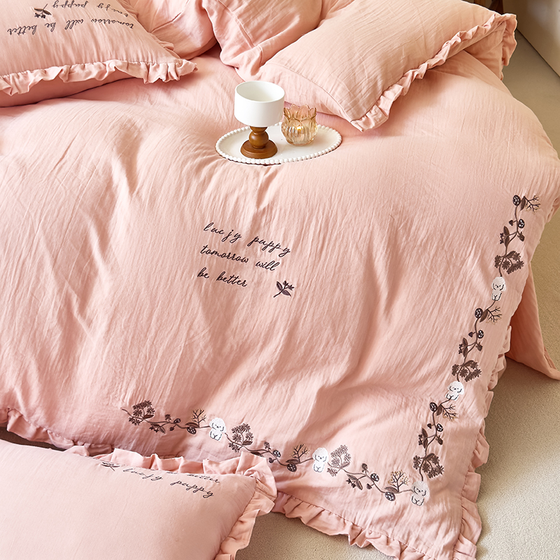 (总)贝尔 2025新款全棉双层皱皱纱花边刺绣小狗四件套