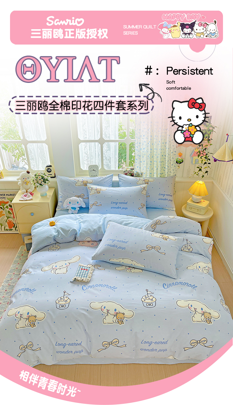 (总)朵希曼 2026新款三丽鸥全棉印花四件套系列,点点美乐蒂,红格凯蒂,蘑菇凯蒂,甜甜凯蒂,晚安大耳狗,樱桃凯蒂,元气美乐蒂,运动凯蒂