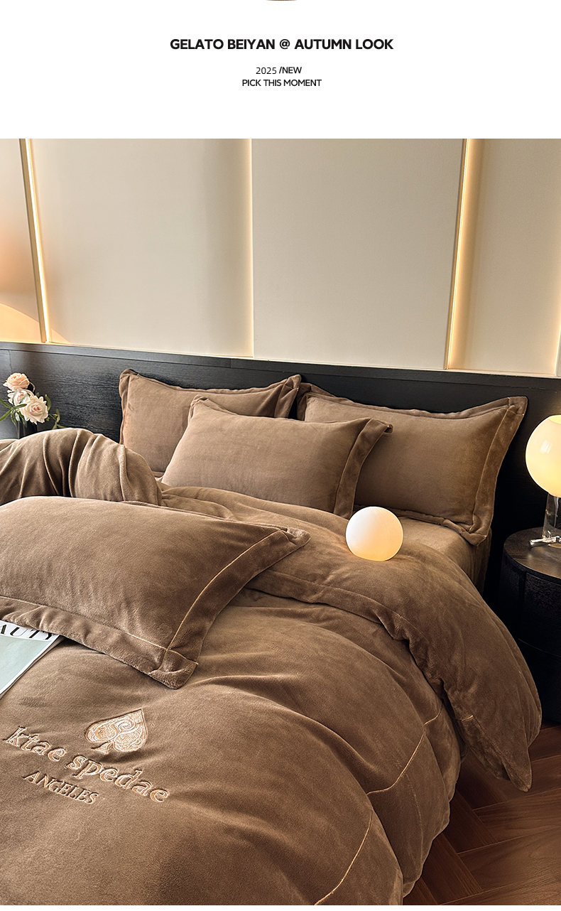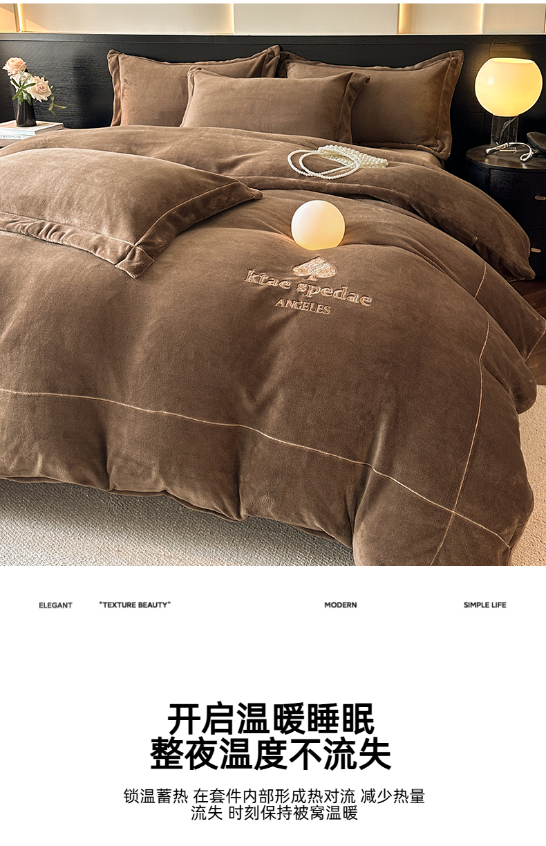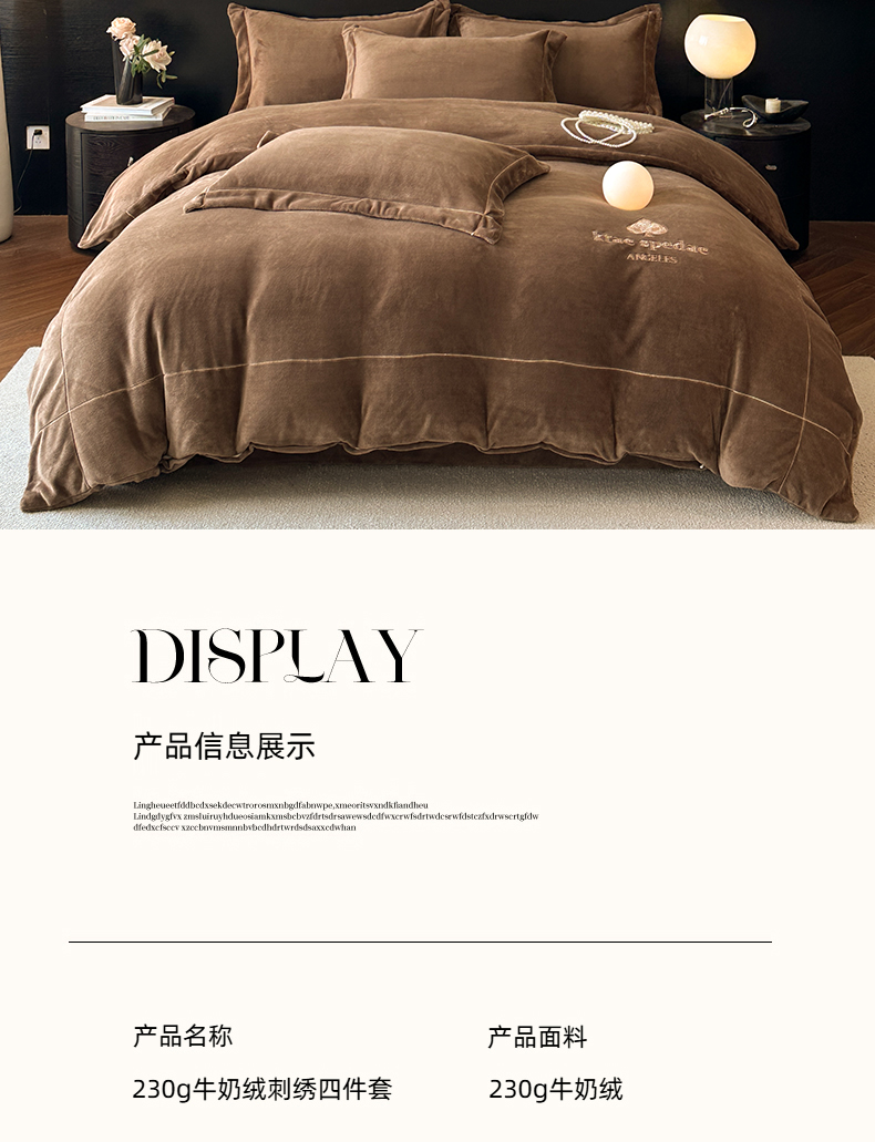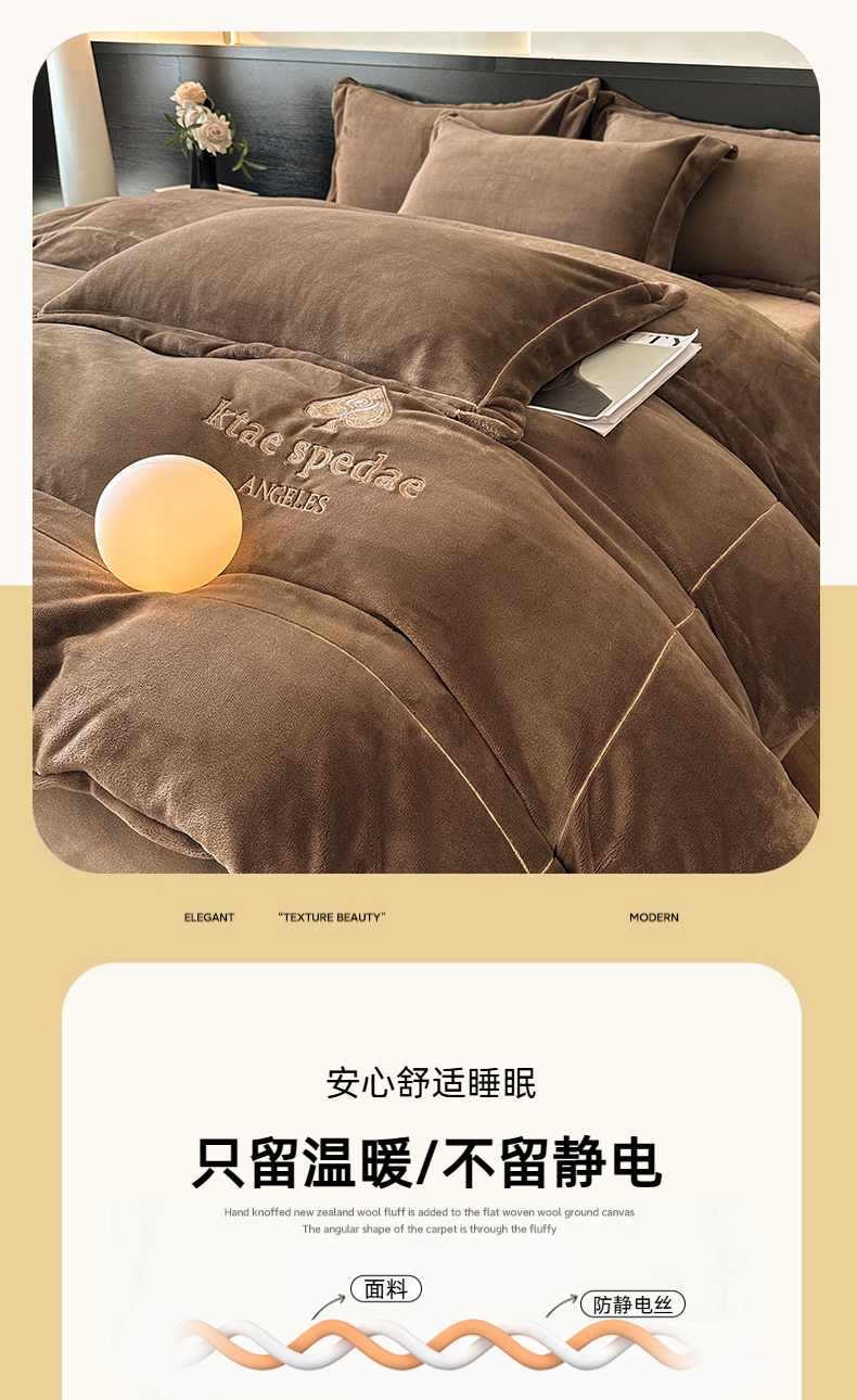 商品名称:狂想家 2025新款刺绣牛奶绒四件套-安琪儿 安琪儿-轻奢咖