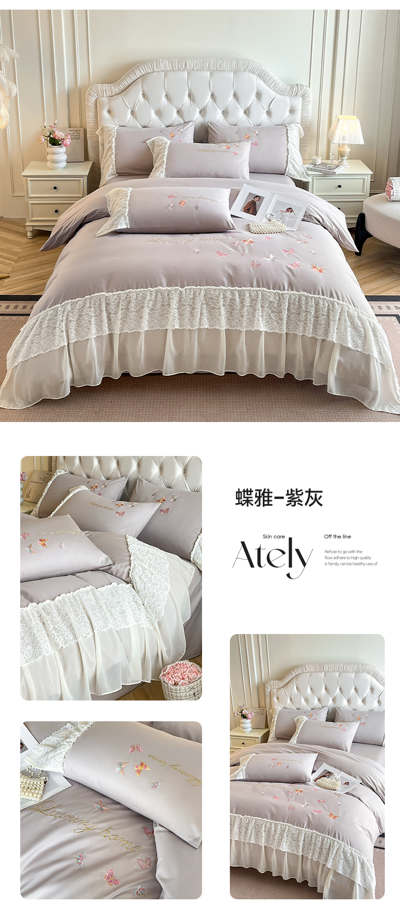 商品名称:索飞特家纺 2025新款全棉蕾丝双层边刺绣四件套(蝶雅) 蝶雅-紫灰