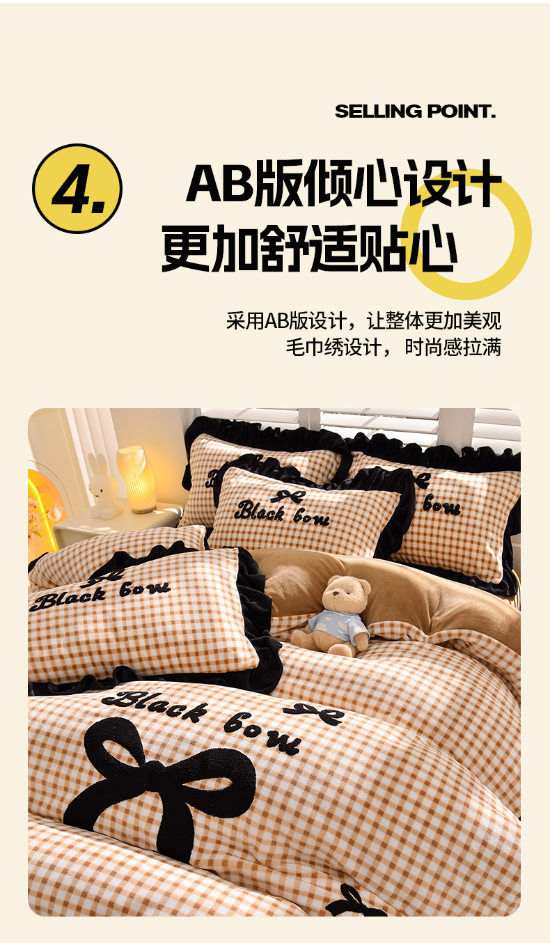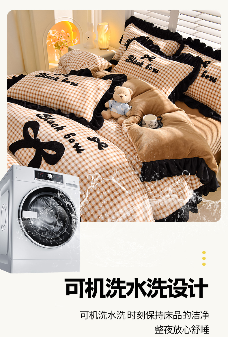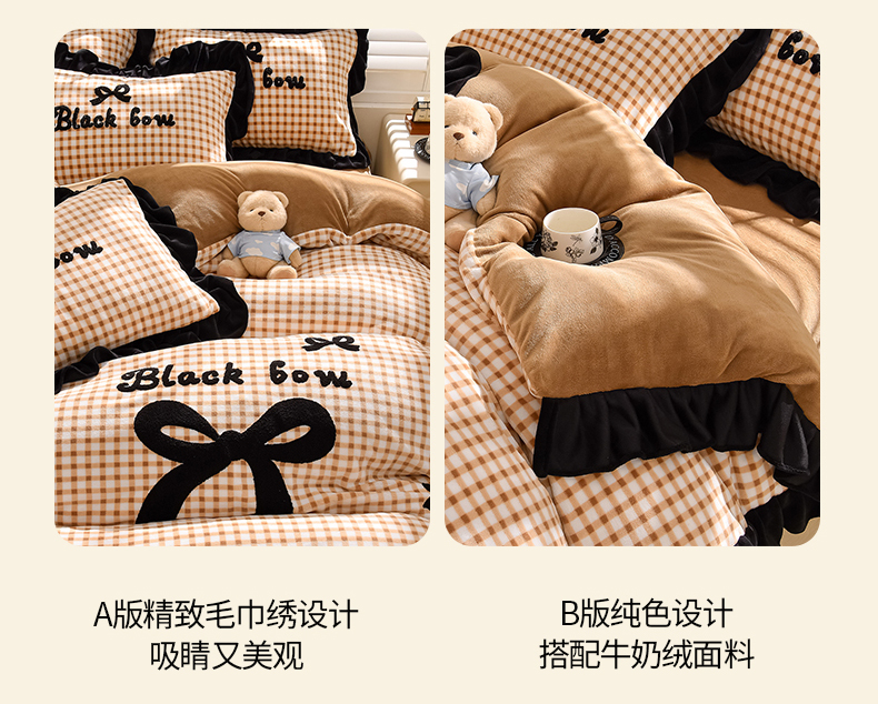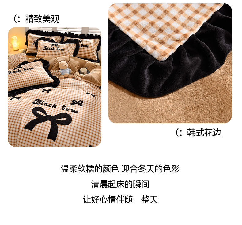 商品名称:炫拼家纺 2025新款法式蝴蝶结毛巾绣韩版加厚小格子花边牛奶绒四件套 法式蝴蝶结-咖