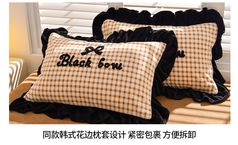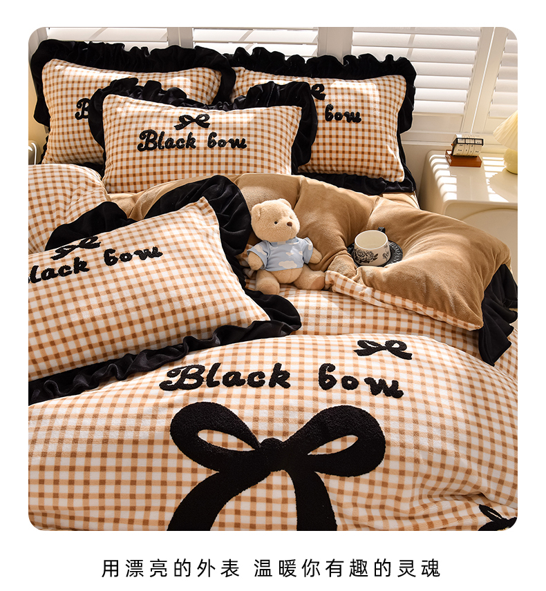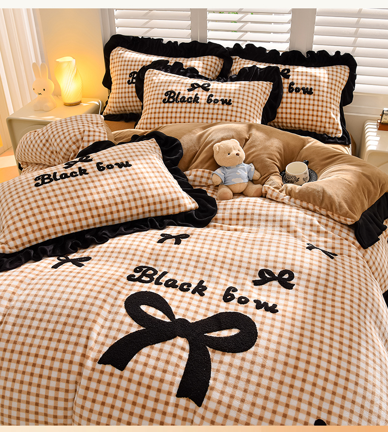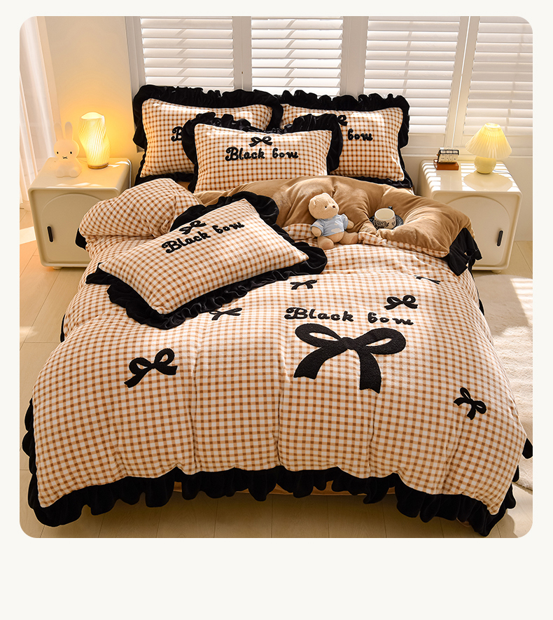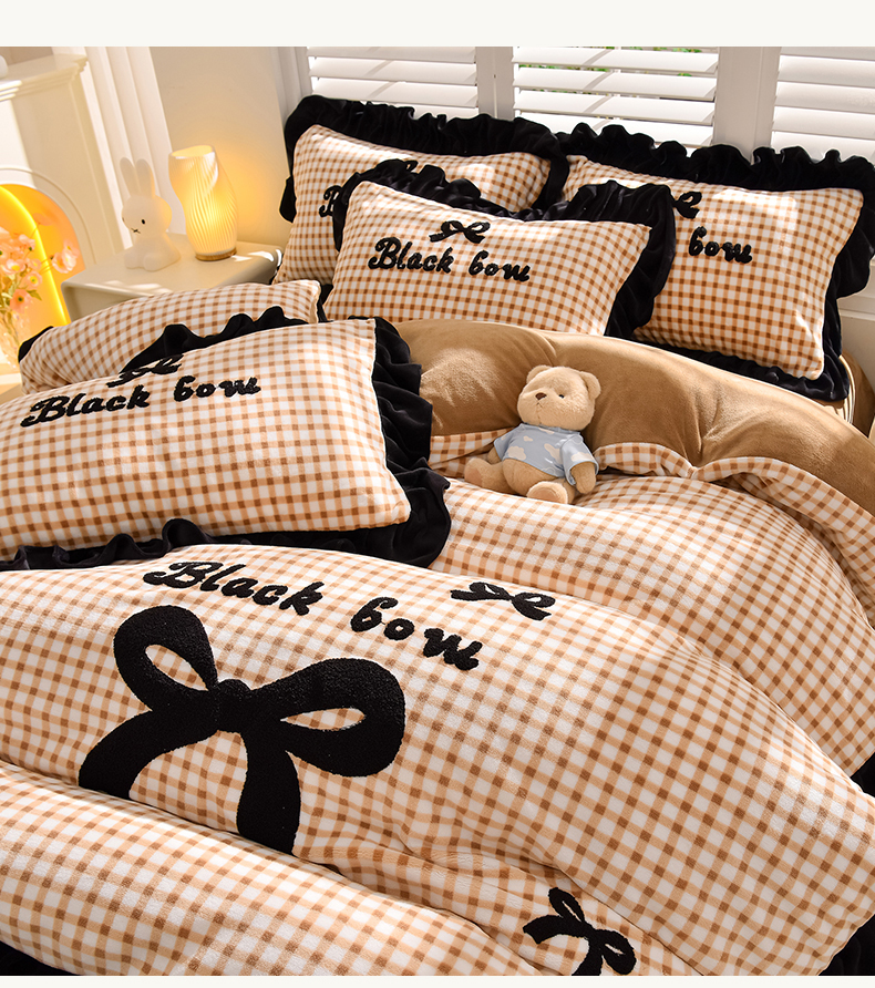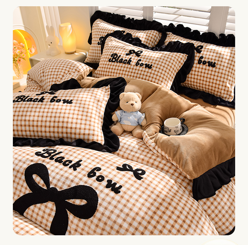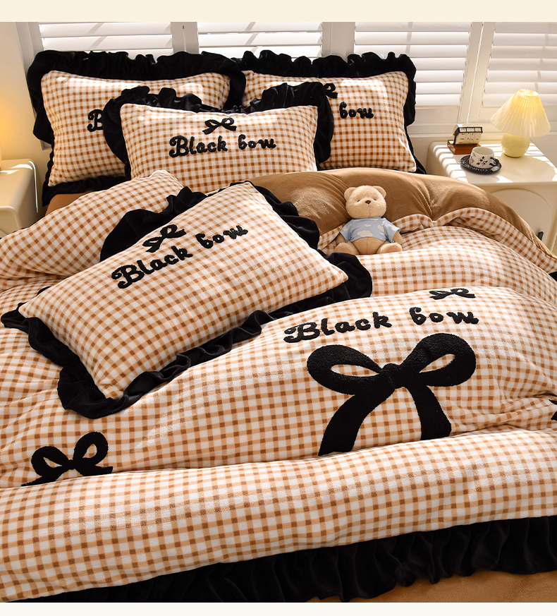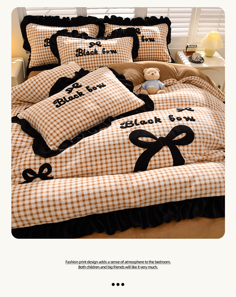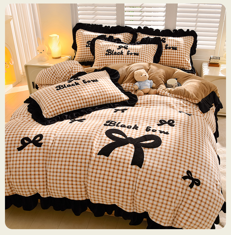 炫拼家纺 2025新款法式蝴蝶结毛巾绣韩版加厚小格子花边牛奶绒四件套 法式蝴蝶结-咖