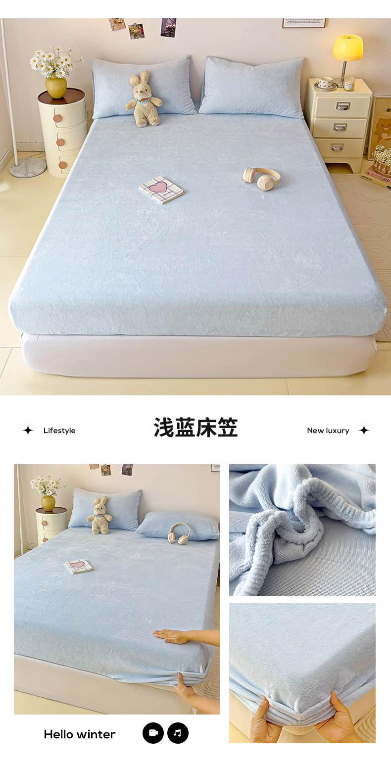 • 91家纺网 家纺一手货源 找家纺 芷凡家纺 2025新款A类纯色条纹格子加厚牛奶绒床笠 牛奶绒床笠-浅蓝