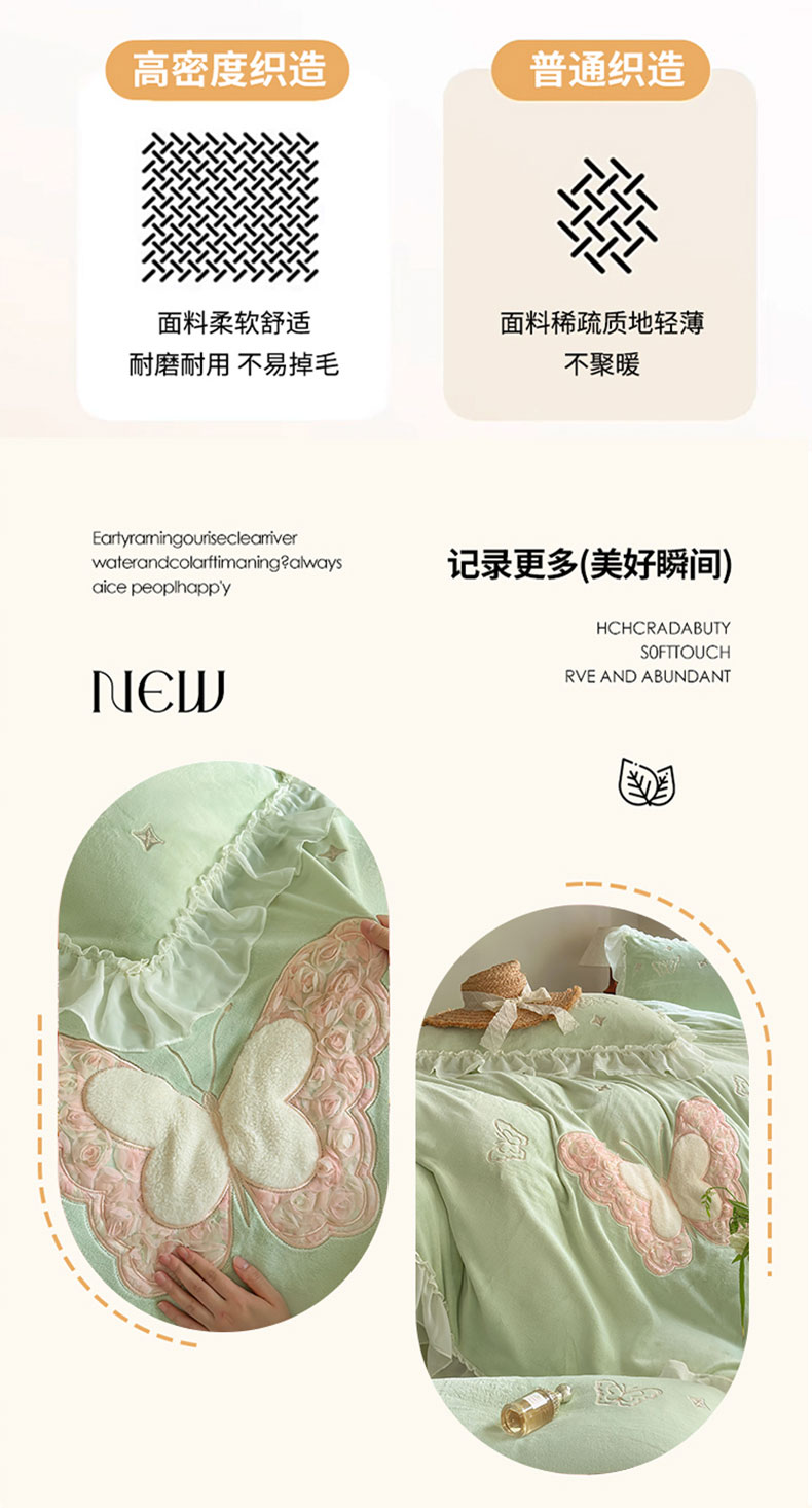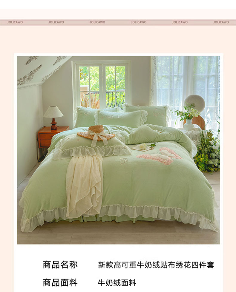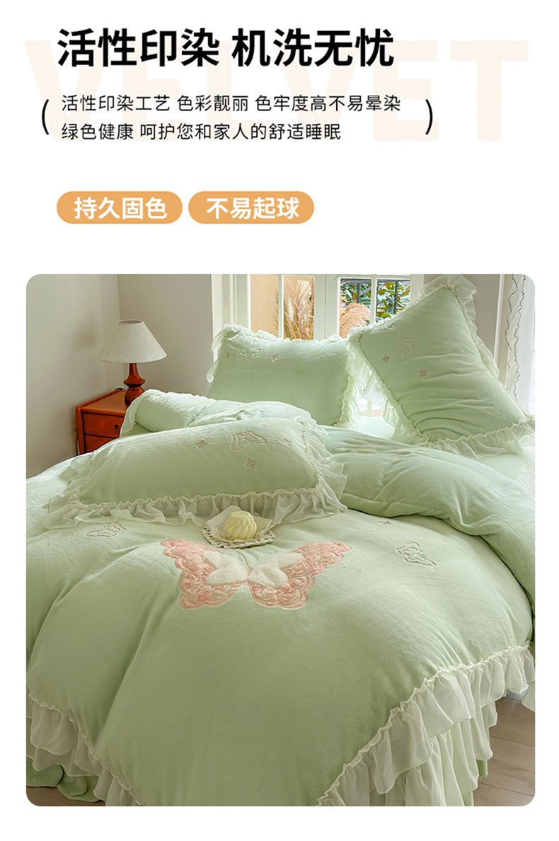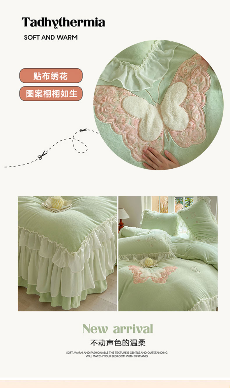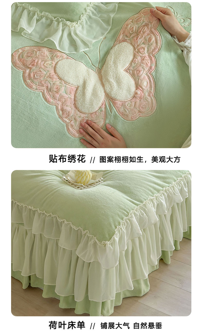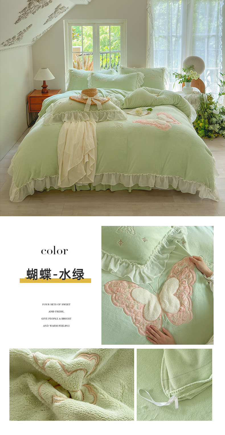 商品名称:美洲琳 2025新款高克重全消光贴布绣花牛奶绒四件套 蝴蝶-水绿