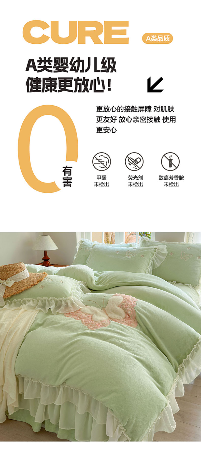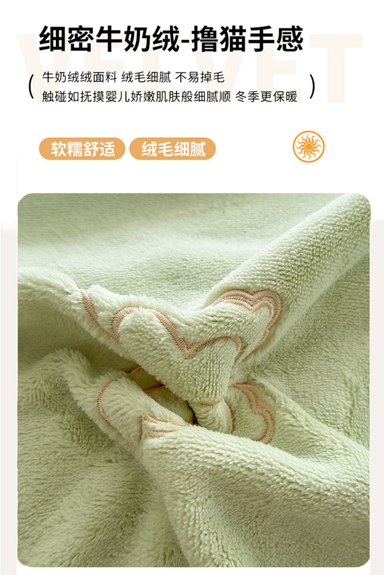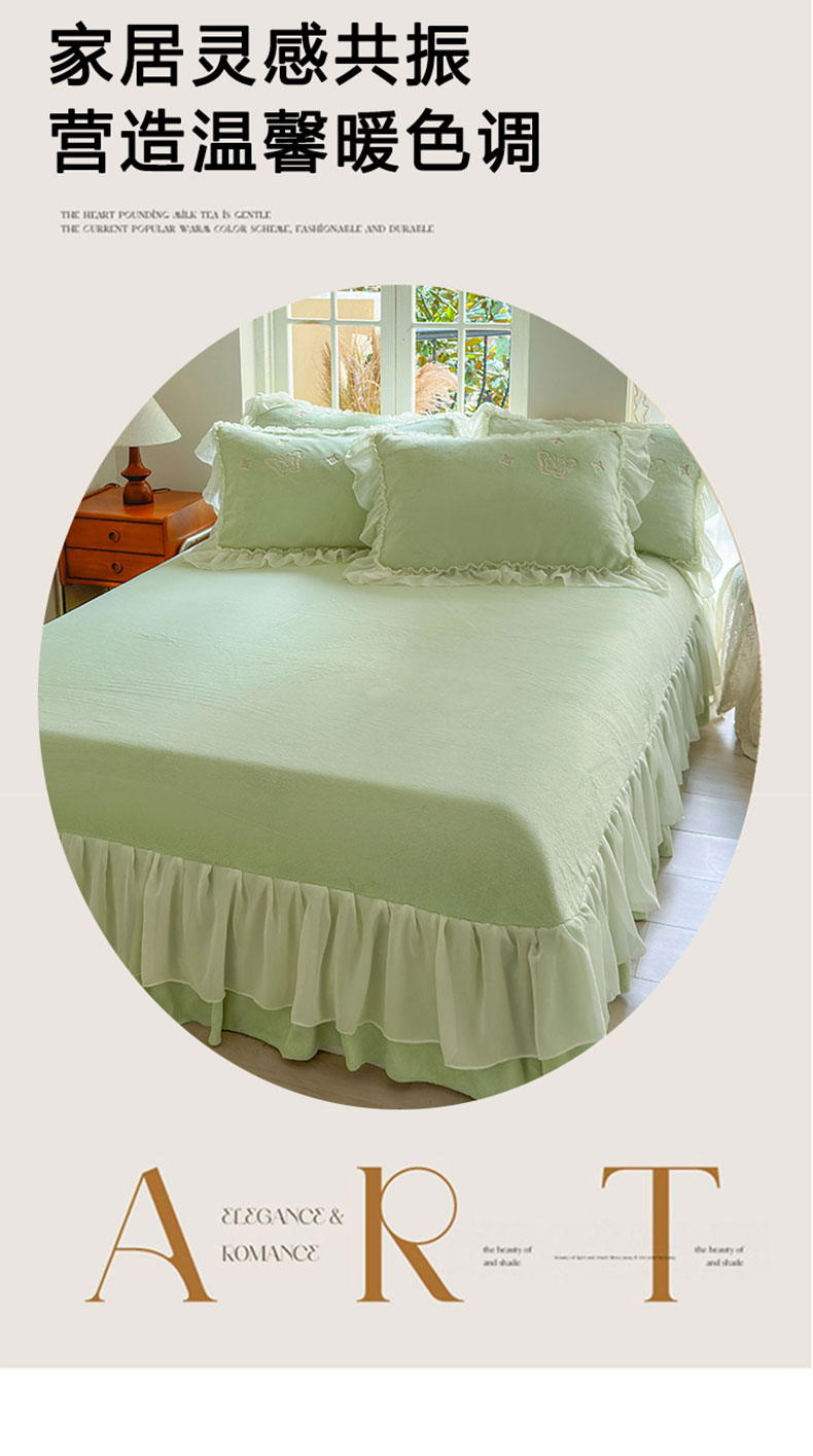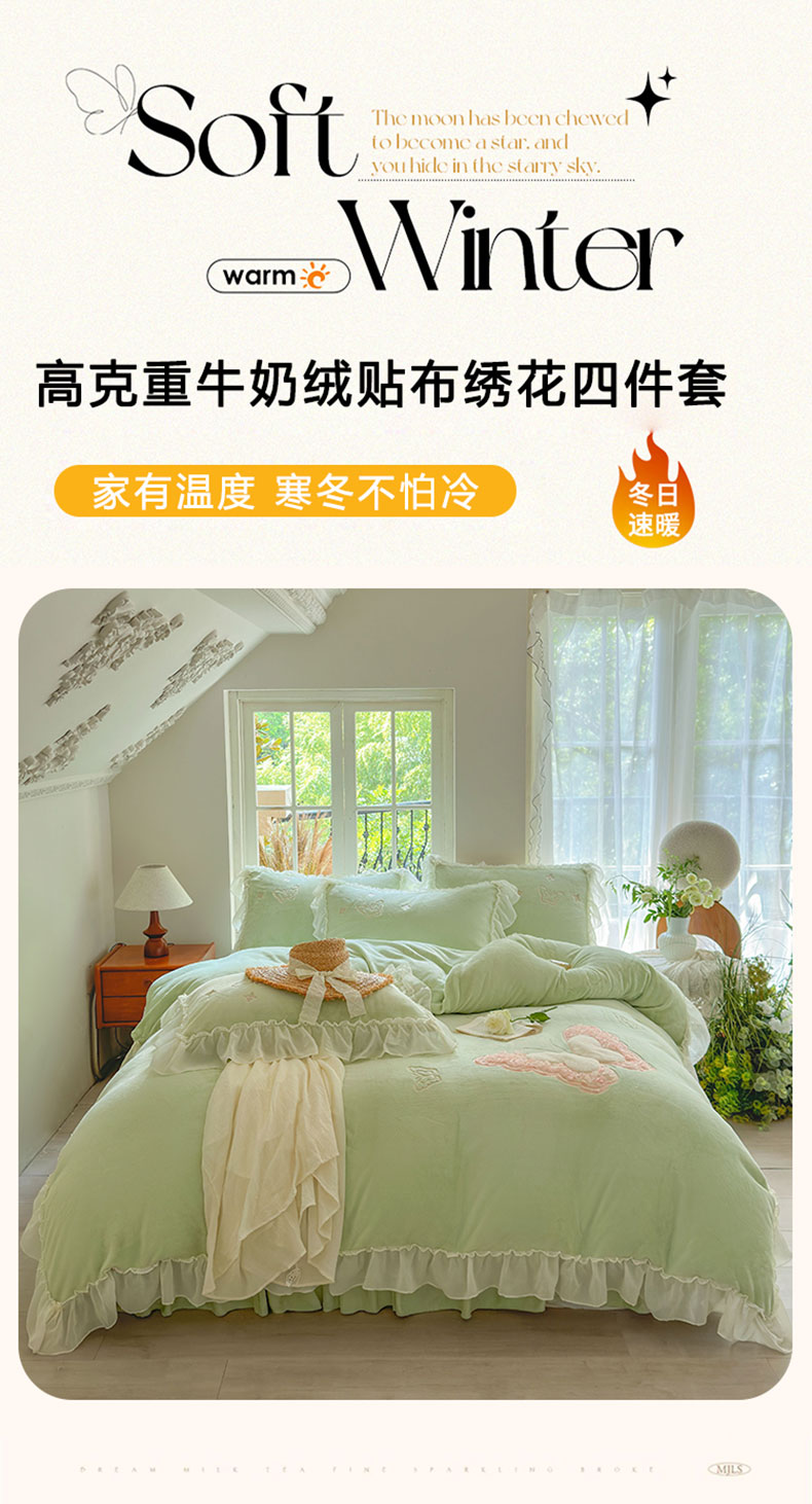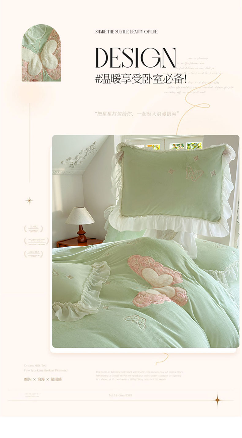 商品名称:美洲琳 2025新款高克重全消光贴布绣花牛奶绒四件套 蝴蝶-水绿