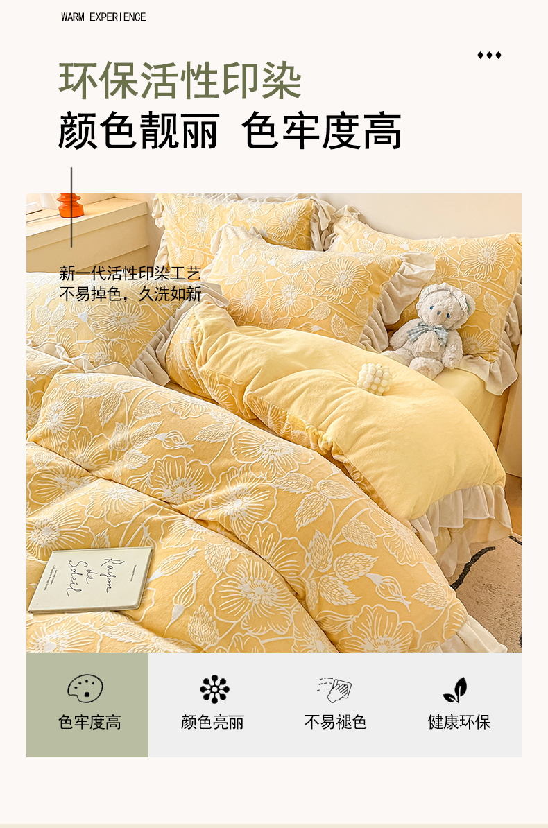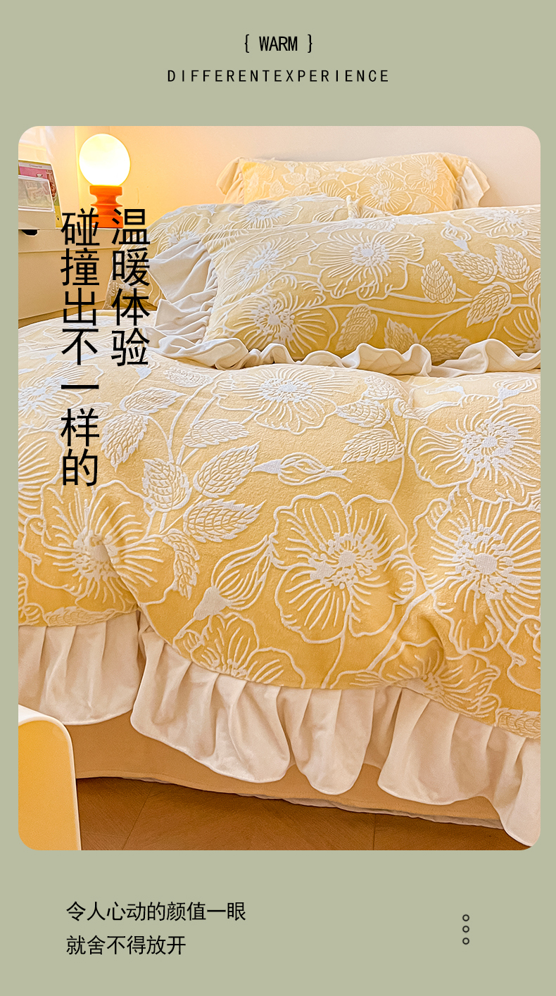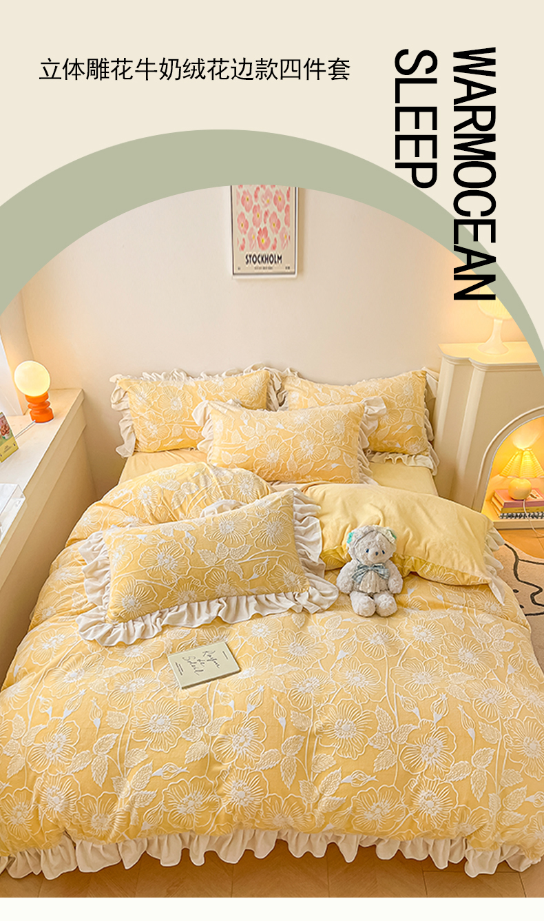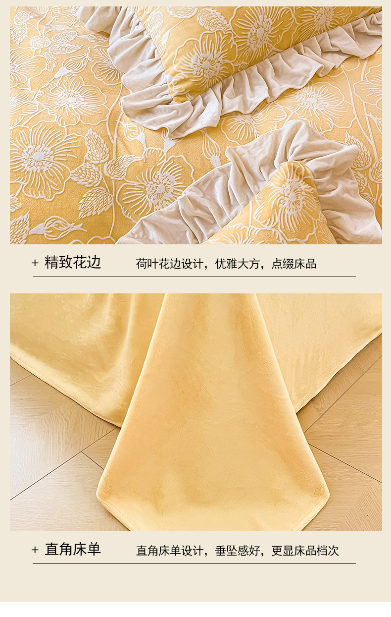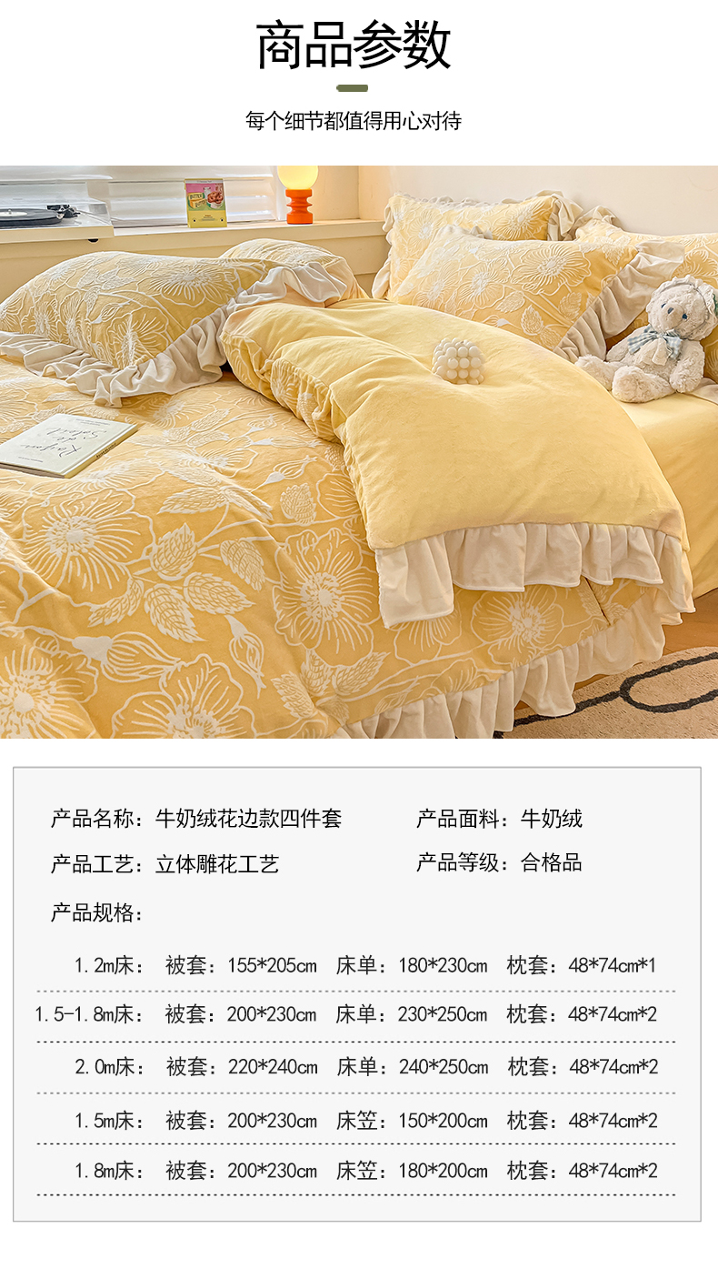 当前位置: 91家纺网 > 商品网购 > 床品套件 > 四件套 > 牛奶绒四件套 > 琪格格纺织 2025新款全消光小清新花边款雕花牛奶绒四件套 雕花绒花边 安妮花苑 黄