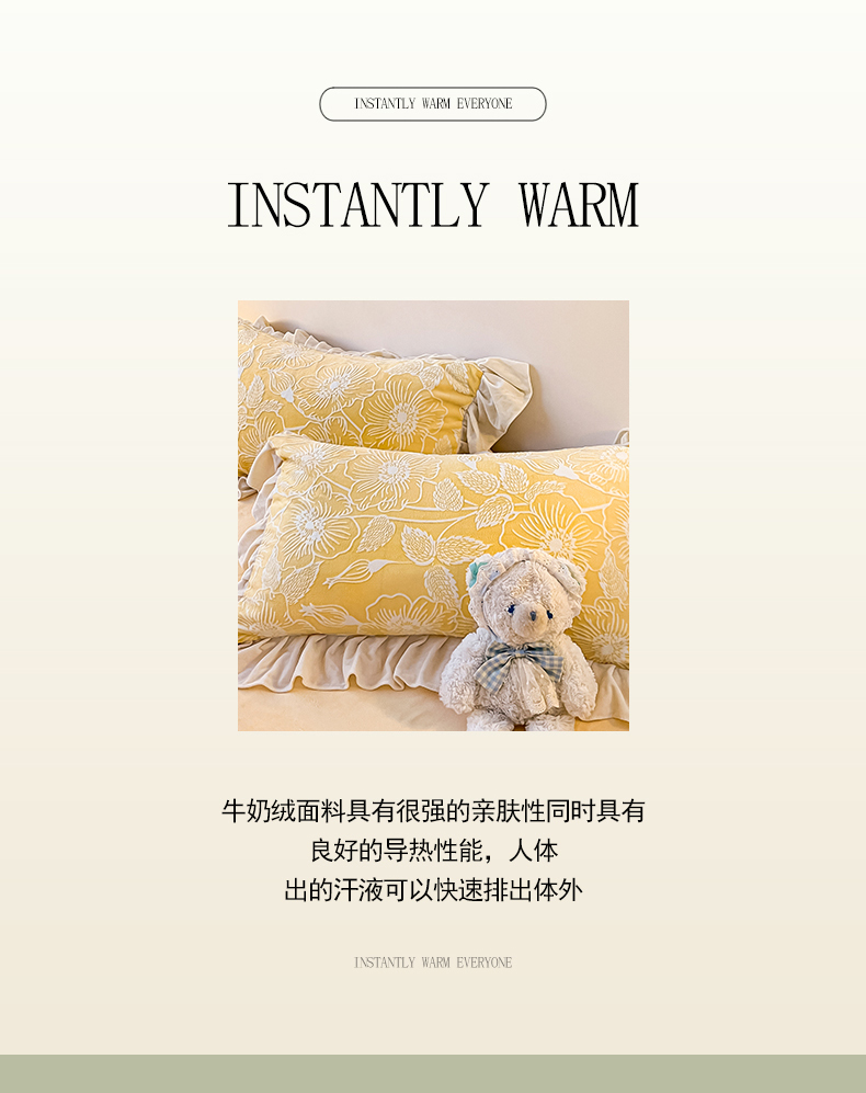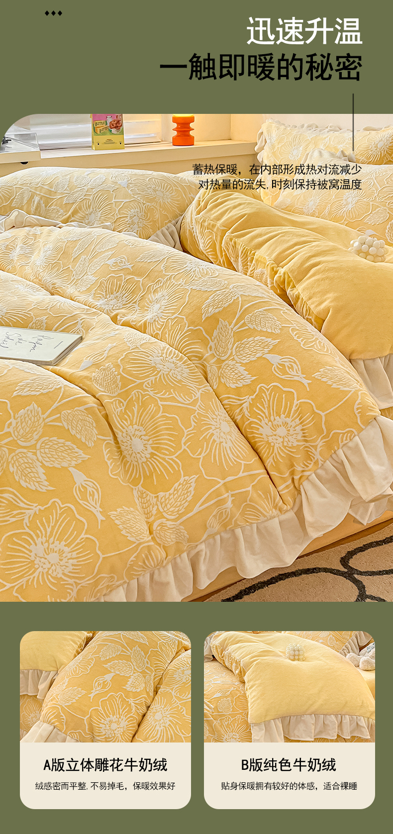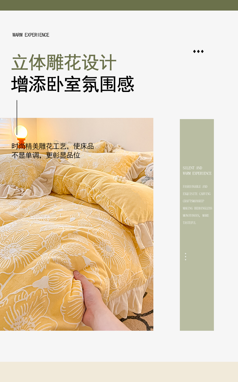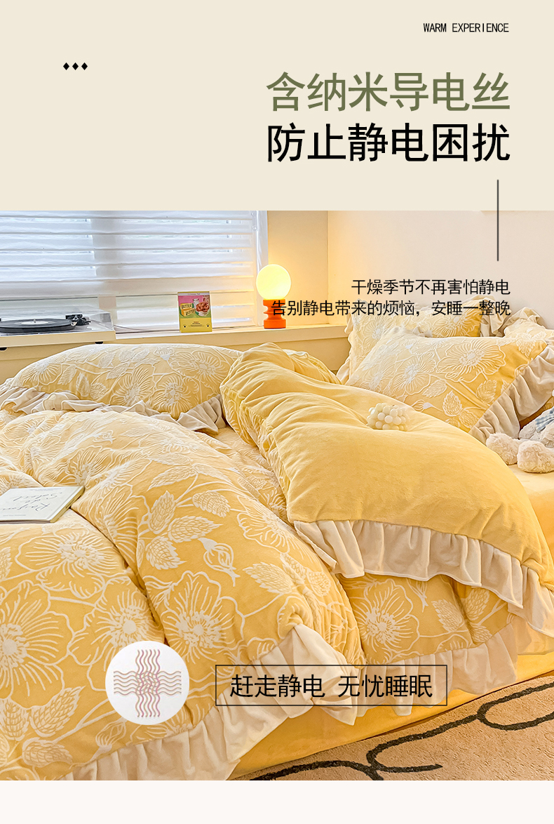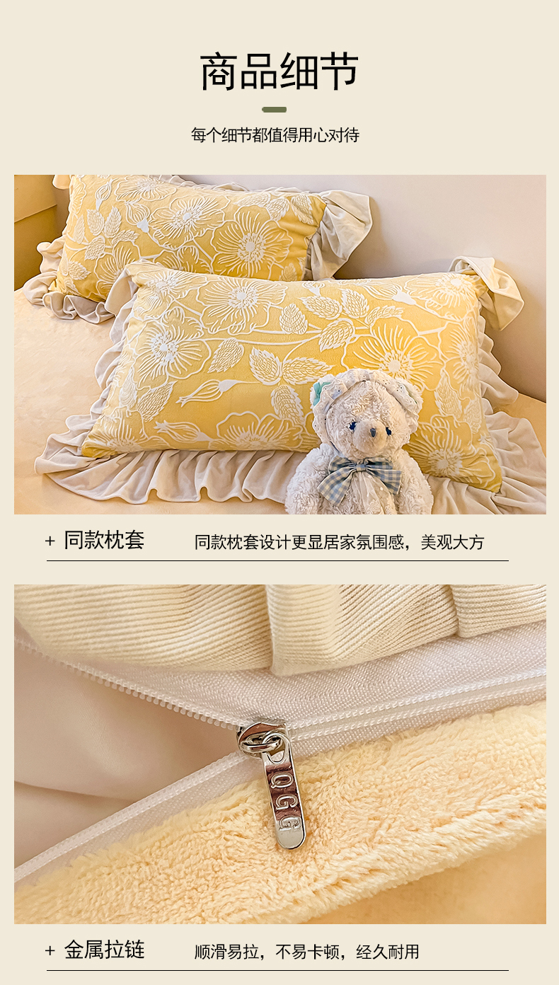 当前位置: 91家纺网 > 商品网购 > 床品套件 > 四件套 > 牛奶绒四件套 > 琪格格纺织 2025新款全消光小清新花边款雕花牛奶绒四件套 雕花绒花边 安妮花苑 黄