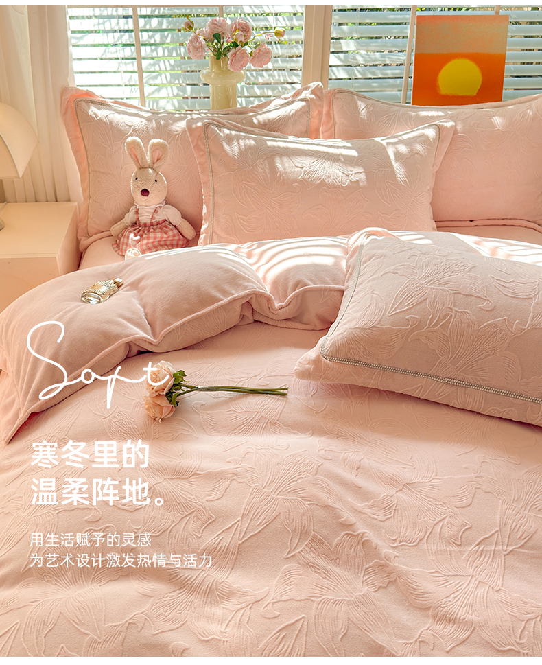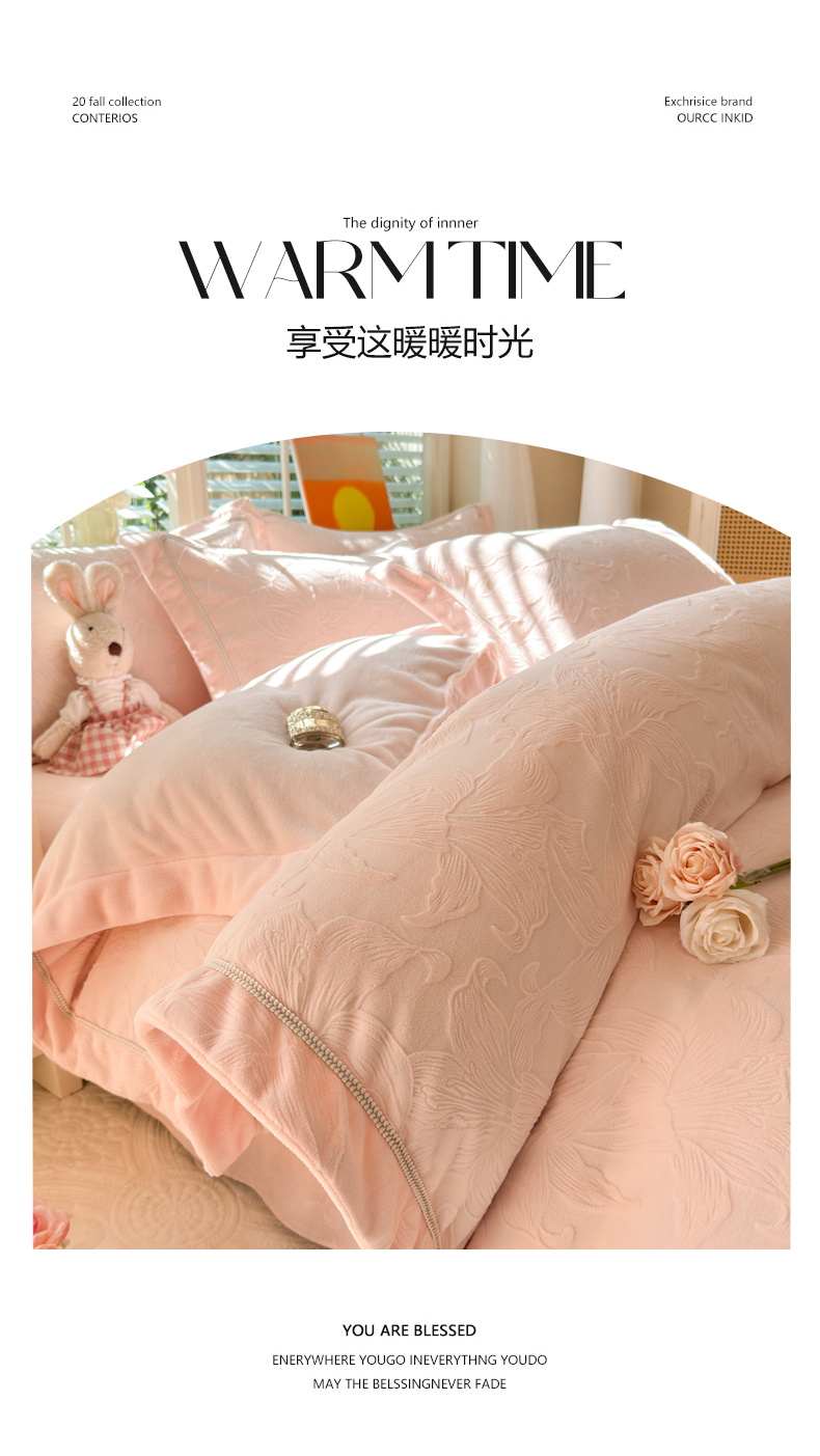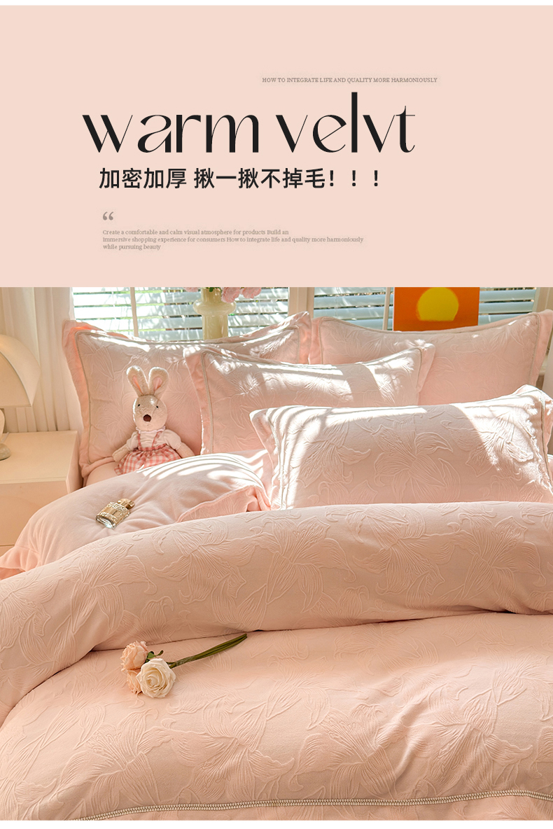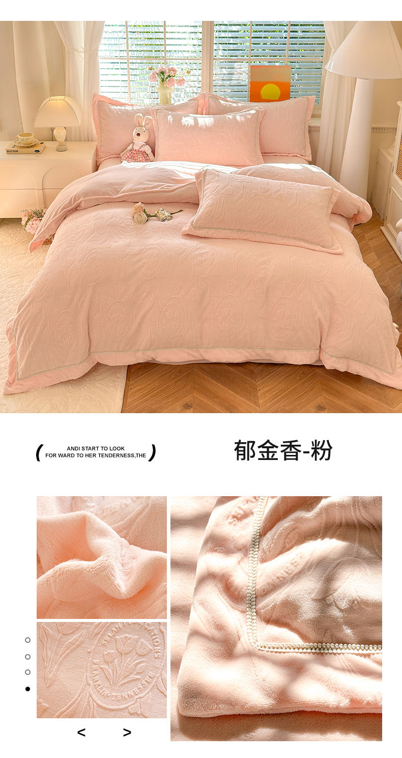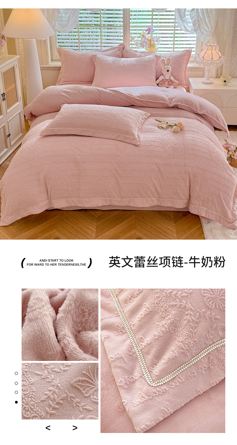 艾唯希家纺 2025新款全消光雕花绒织带款四件套牛奶绒-雕花织带系列 百年好合-粉